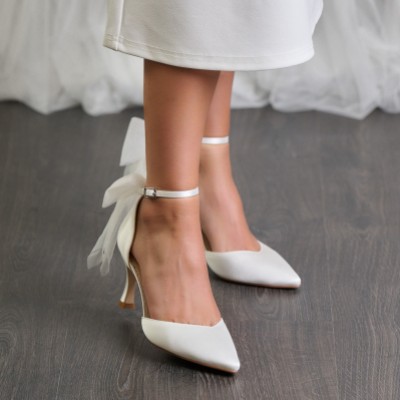 Combining style with sublime comfort, this lovely two part court shoe is handcrafted in classic ivory satin and boats an elegant pointed toe and wide cuff ankle strap with bow...