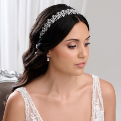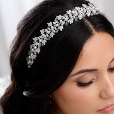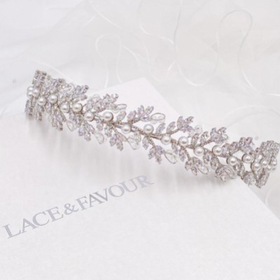 Tuscany Silver Crystal Leaves and Pearl Wedding Headband