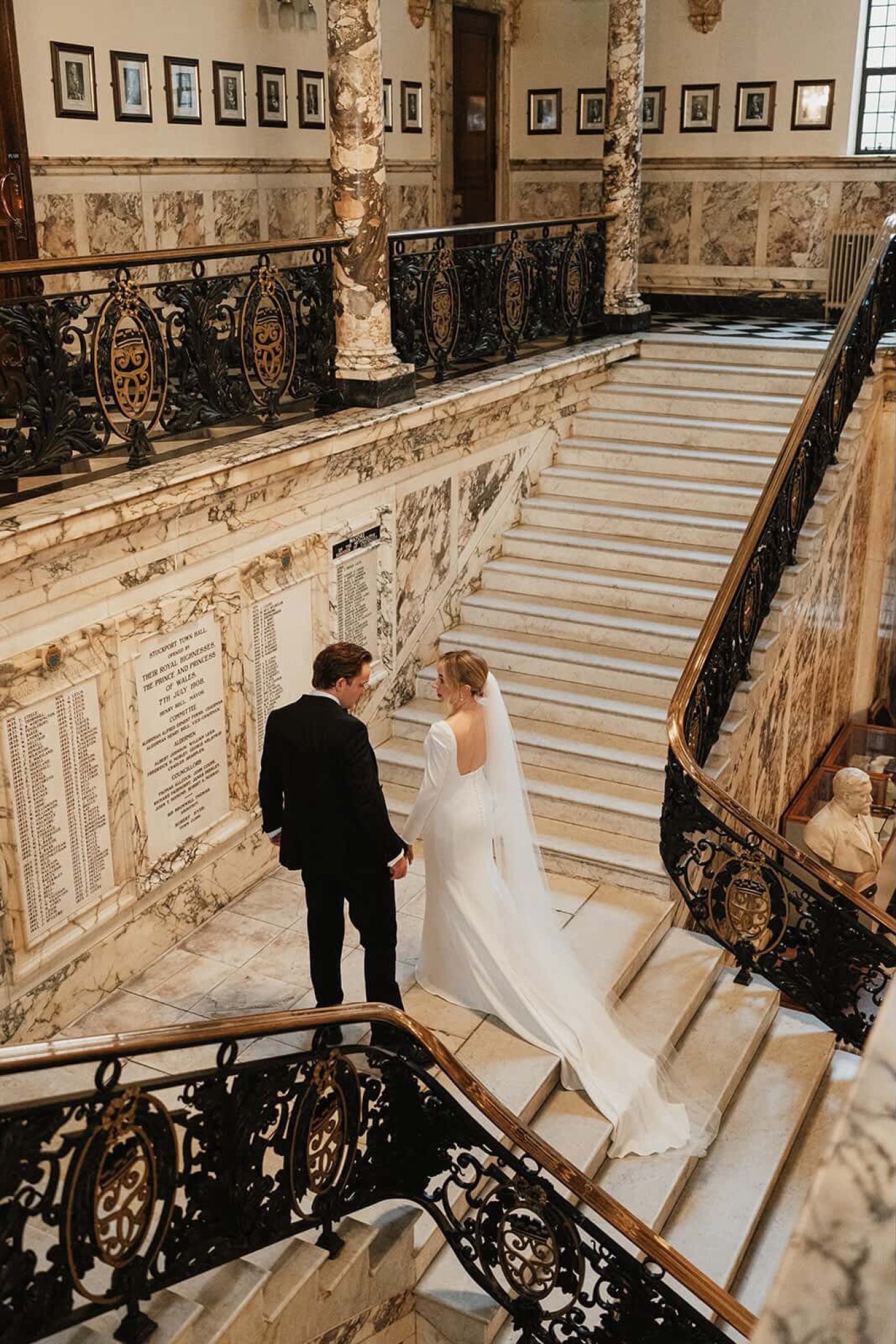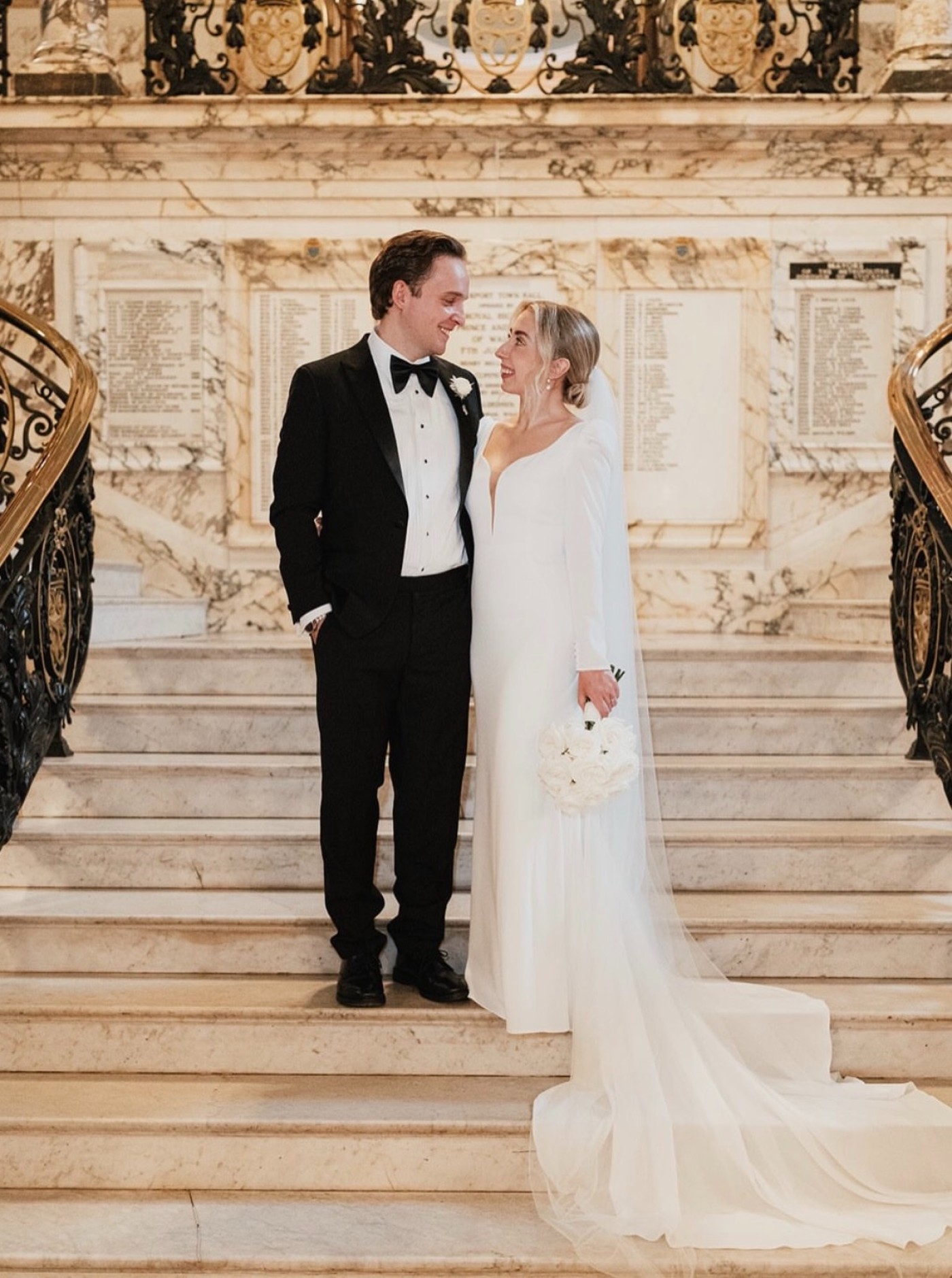 The lovely couple tied the knot at the amazing Stockport Town Hall ⛪️ Stockport Town Hall is a beautiful Grade II listed building with a striking clock tower, historically known as 'The Wedding Cake' due to its white facade.