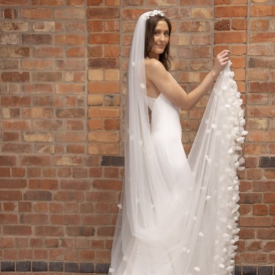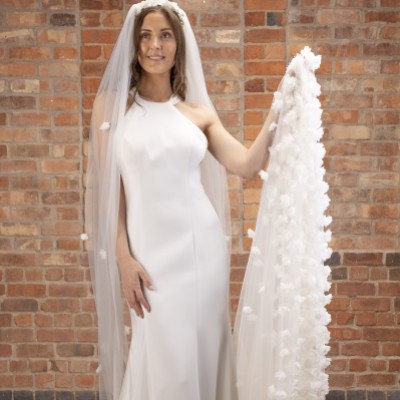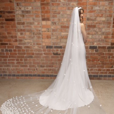 A beautiful floral cathedral veil handcrafted from a single layer of dreamily soft ivory tulle this design is heavily embellished with hundreds of gorgeous 3D flowers on the train...