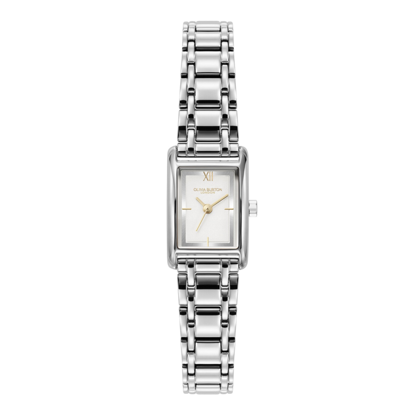 Introducing Olivia Burton's best-selling Grove watch in a new mini size. The petite rectangular Silver White dial is beautifully finished with a sunray border, domed crystal and gold accents. Complete with slim case and classic bracelet strap in a silver finish, this tiny classic is perfect for stacking with jewellery.