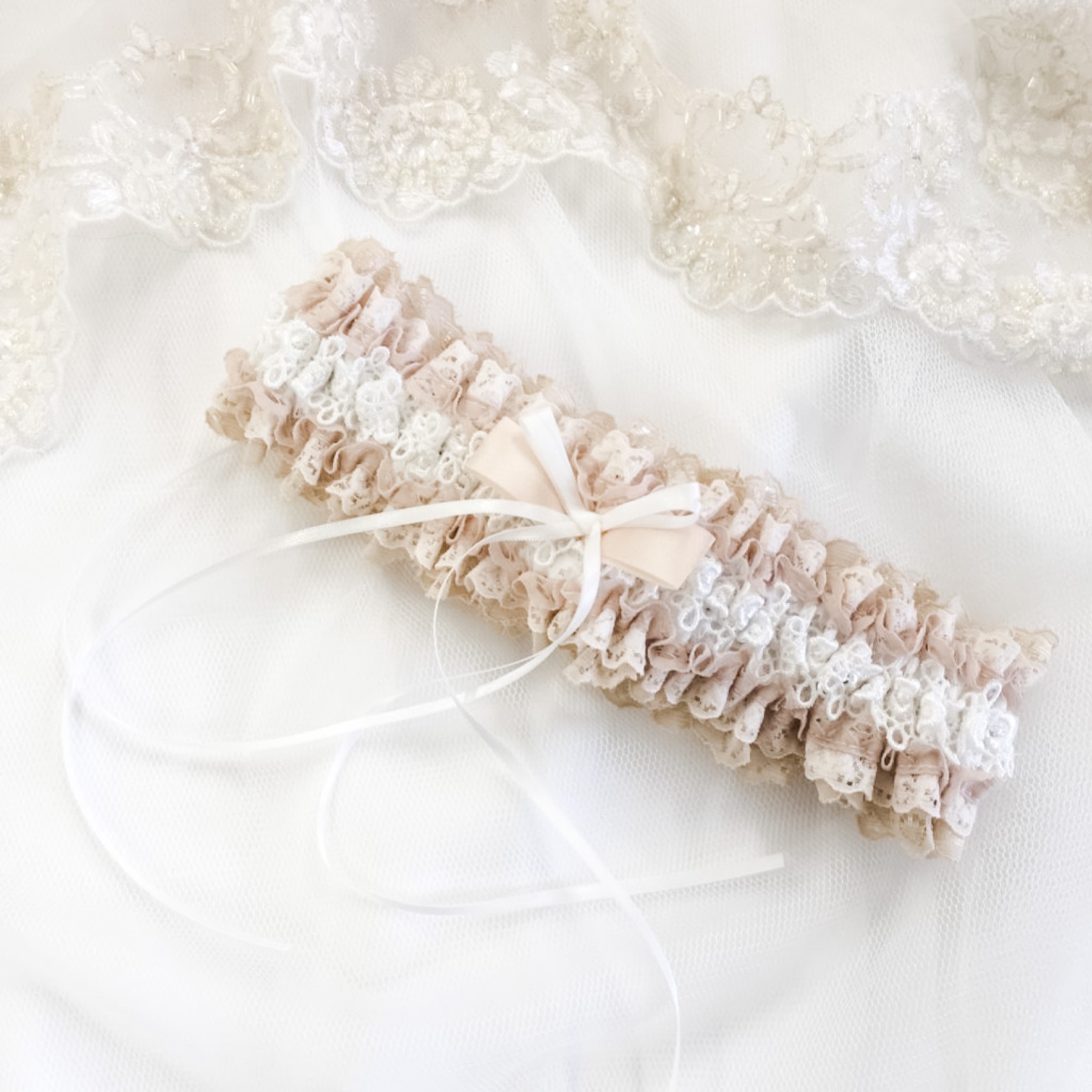 A pretty lace bridal garter beautifully handmade with layers of nude, blush and ivory lace, finished with double bow detail made from narrow ivory satin ribbon. This luxury garter makes a gorgeous bridal gift.