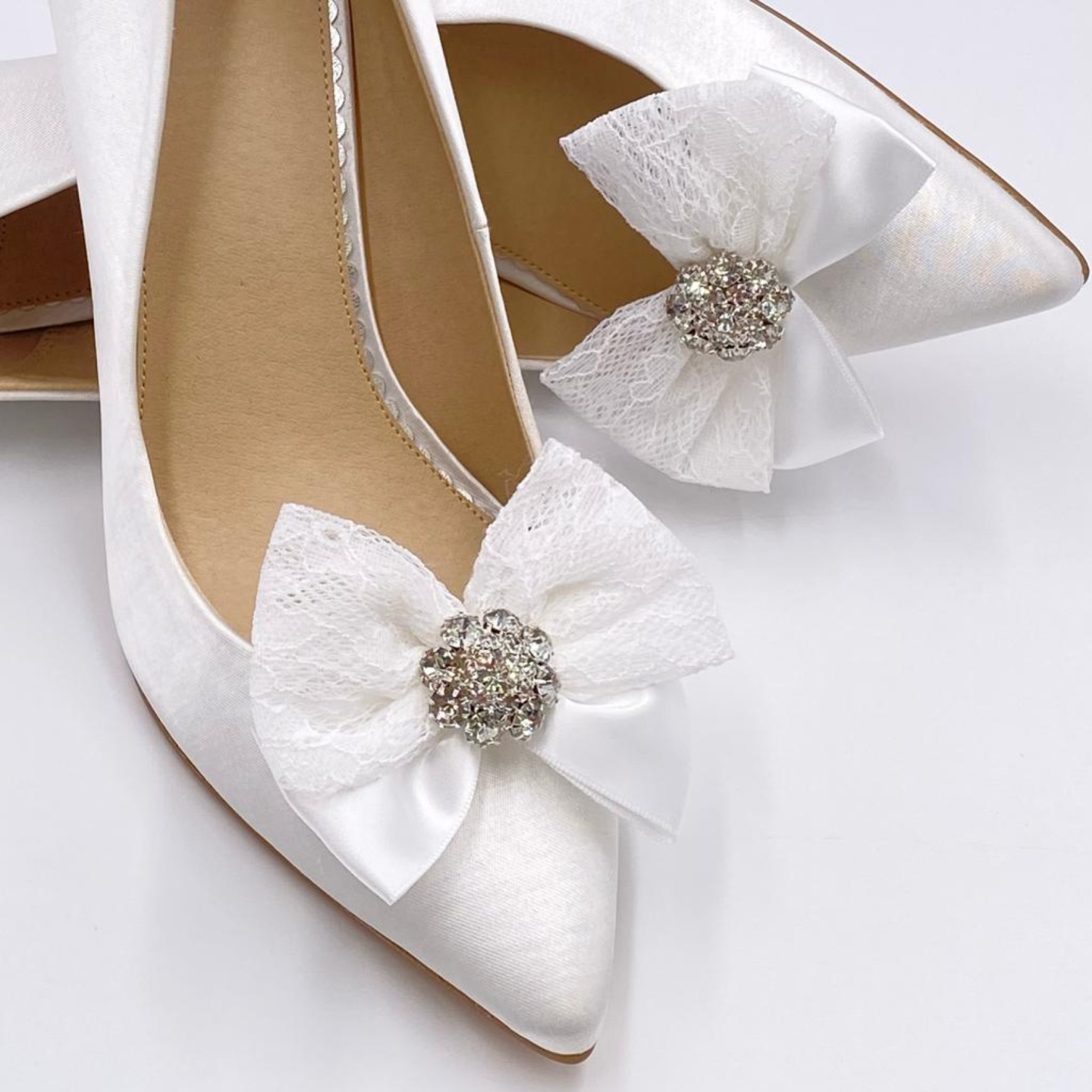 A beautiful large bow shoe clip made from delicate ivory lace and satin, topped with a sparkling crystal brooch style trim for a touch of bridal glamour. The perfect way to make any wedding court shoe look super cute!