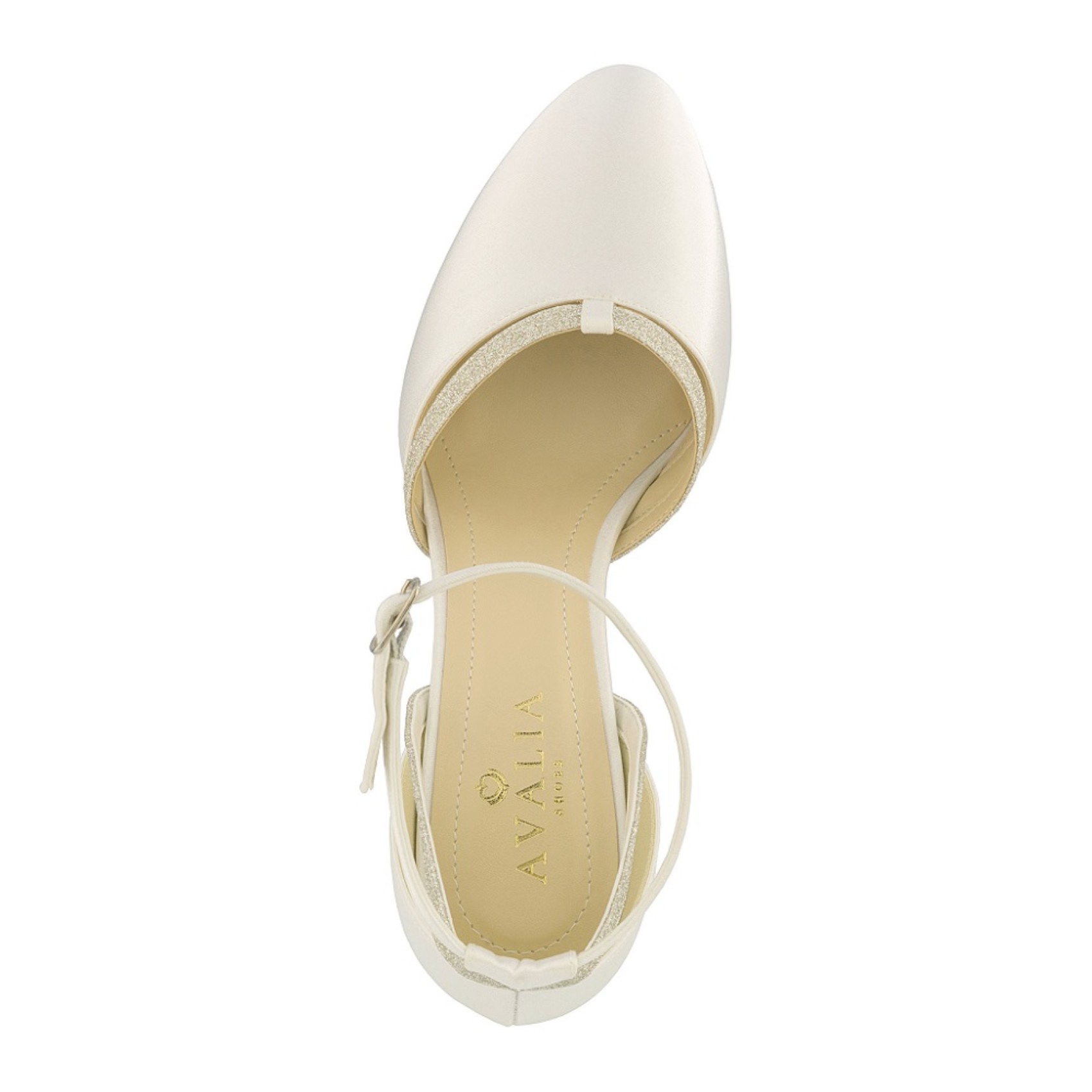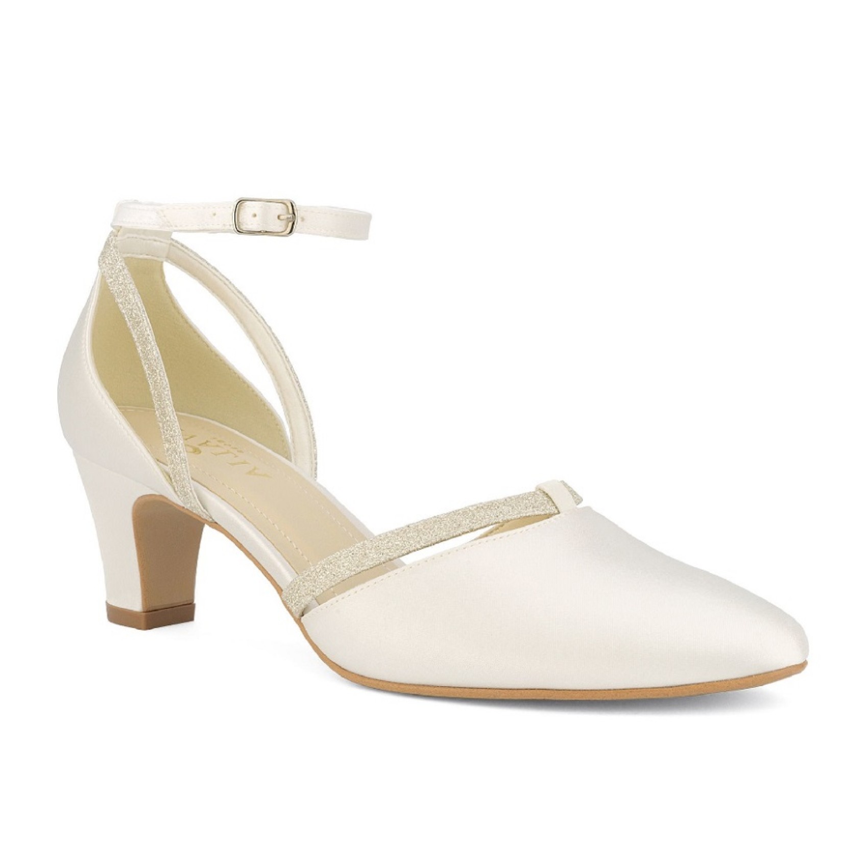 Luna adds a touch of glamour to a classic shape. Handmade from luxury ivory satin these beautiful two part court shoes feature a delicate ankle strap and shimmering silver glitter trim. Sitting on a low block heel these wedding shoes are not only ultra comfy but also super stylish.