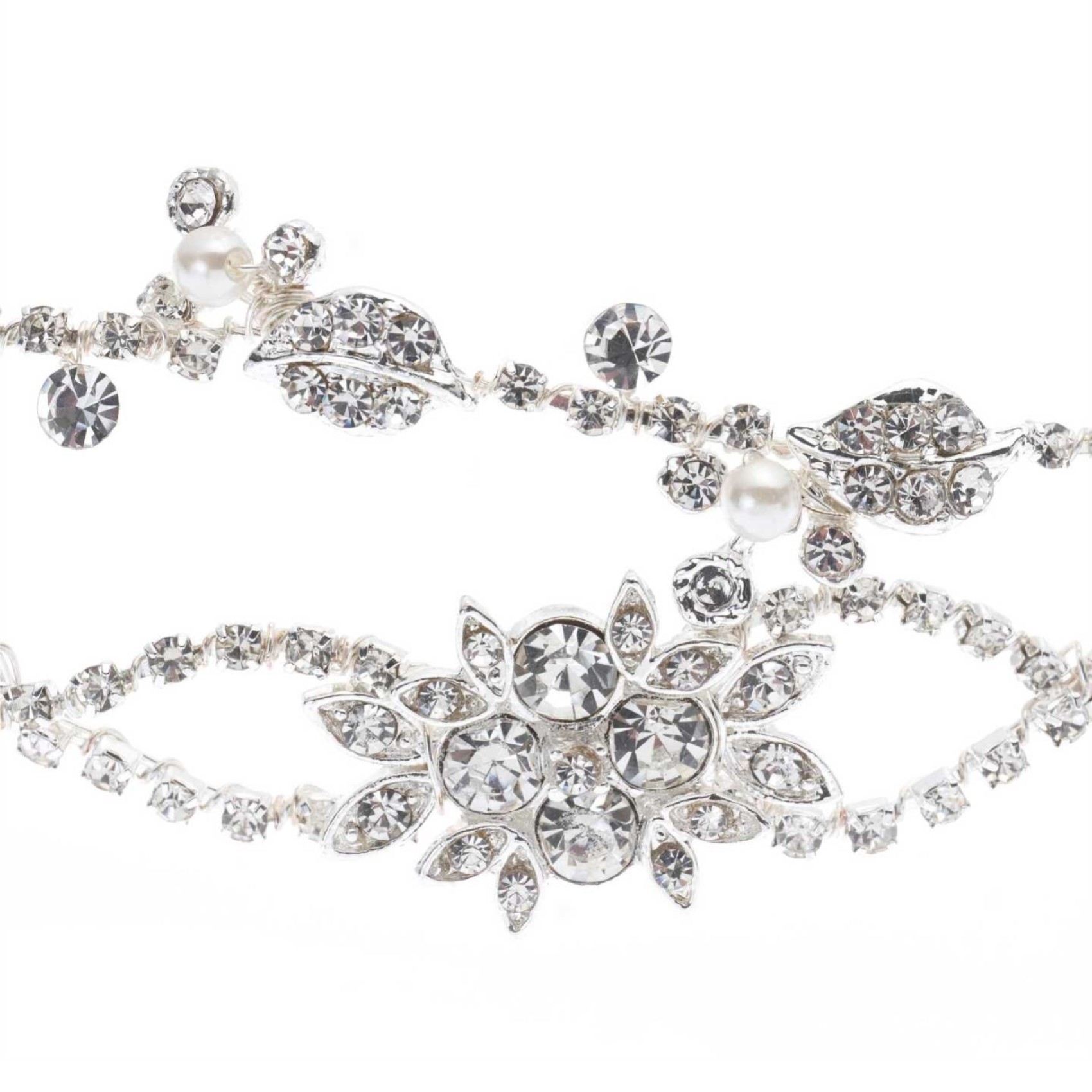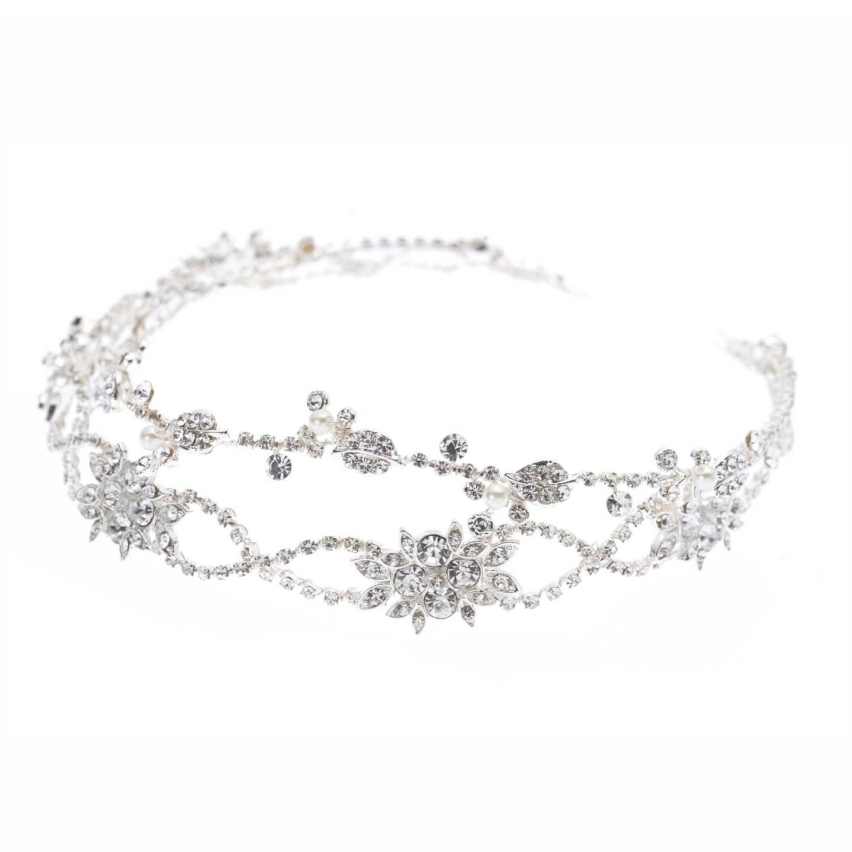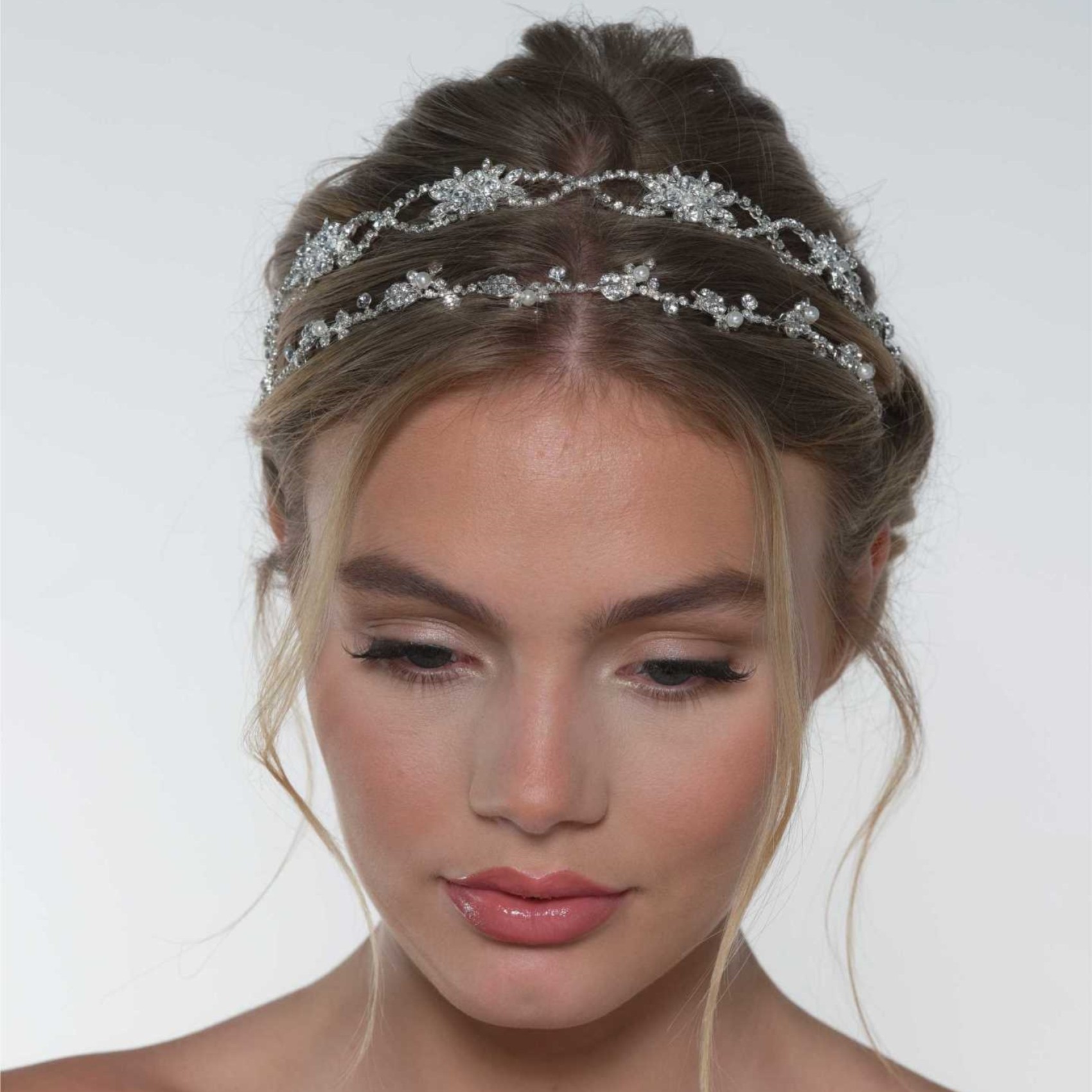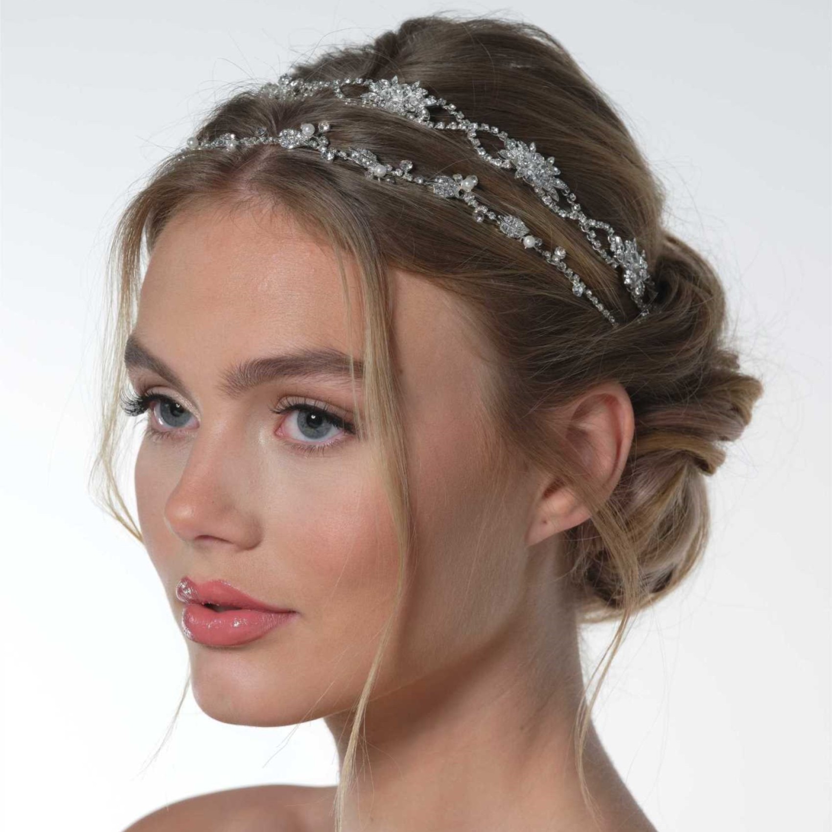 An intricate bridal headpiece made up of entwining silver diamante vines, interspersed with crystal floral motifs set in a unique double headband design, finished with ivory pearl accents. We think this wedding hair vine looks stunning in the frony of a relaxed bridal updo as shown, or worn around the back of a plaited half up hairstyle.