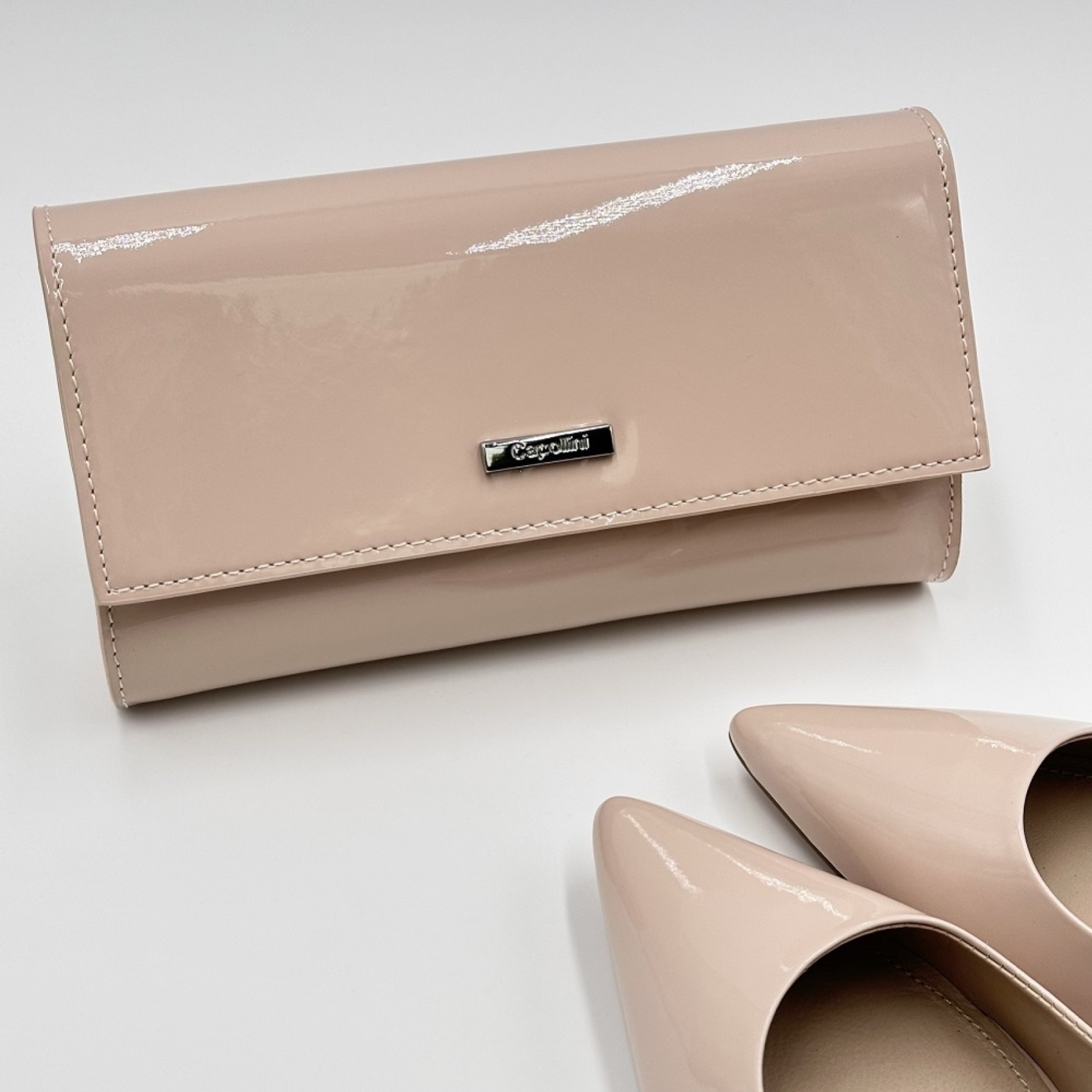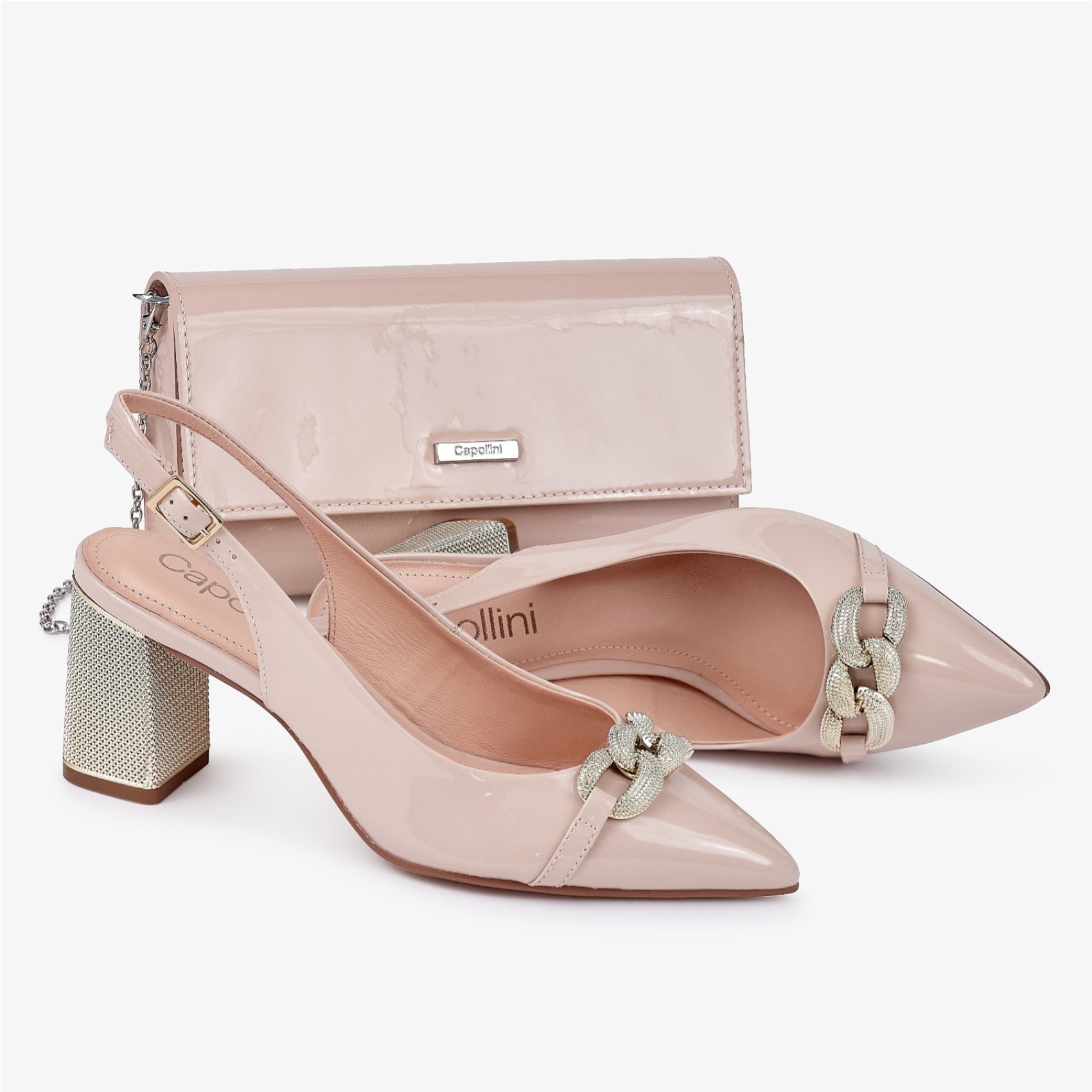 Diese handgefertigte, zeitlose Handtasche aus nudefarbenem Lackleder verfügt über einen weichen Magnetverschluss, ist schön gefüttert und hat ein großes Fach mit Reißverschluss und ein offenes Innenfach. Tragen Sie die Tasche als traditionelle Clutch oder mit der langen, abnehmbaren Schulterkette, um die Hände frei zu haben, und versehen Sie sie mit dem Gütesiegel Capollini.
