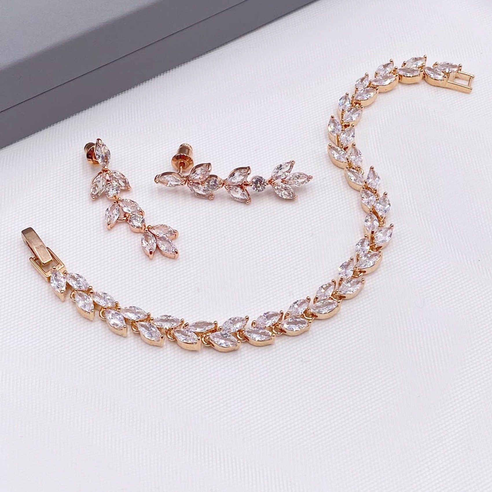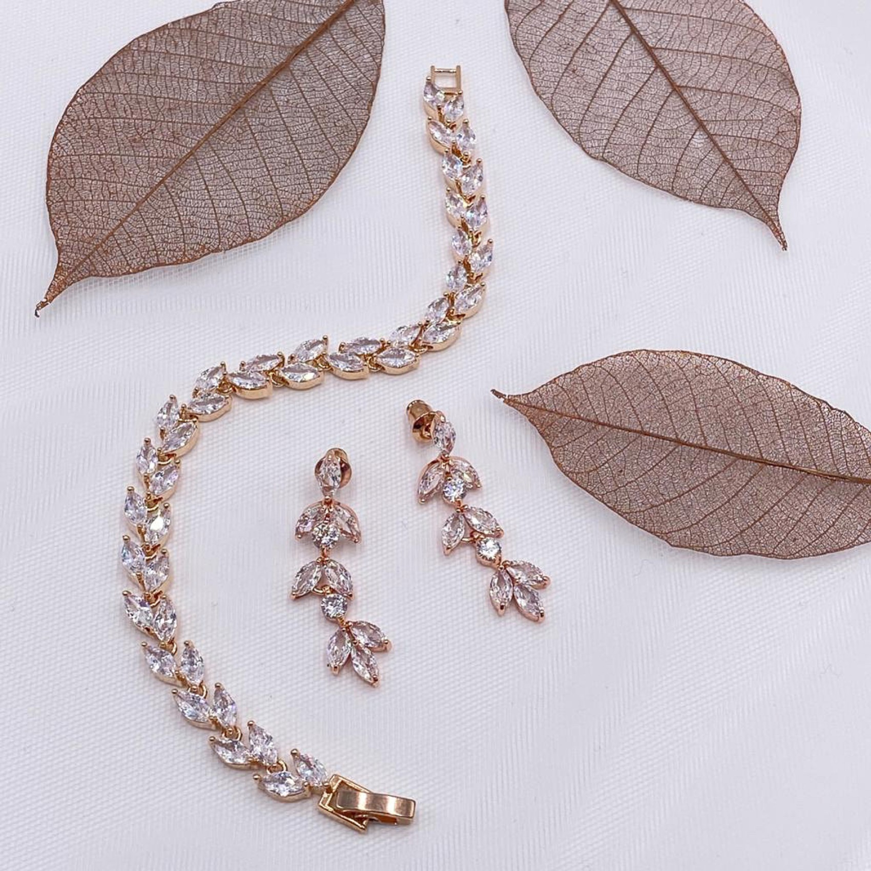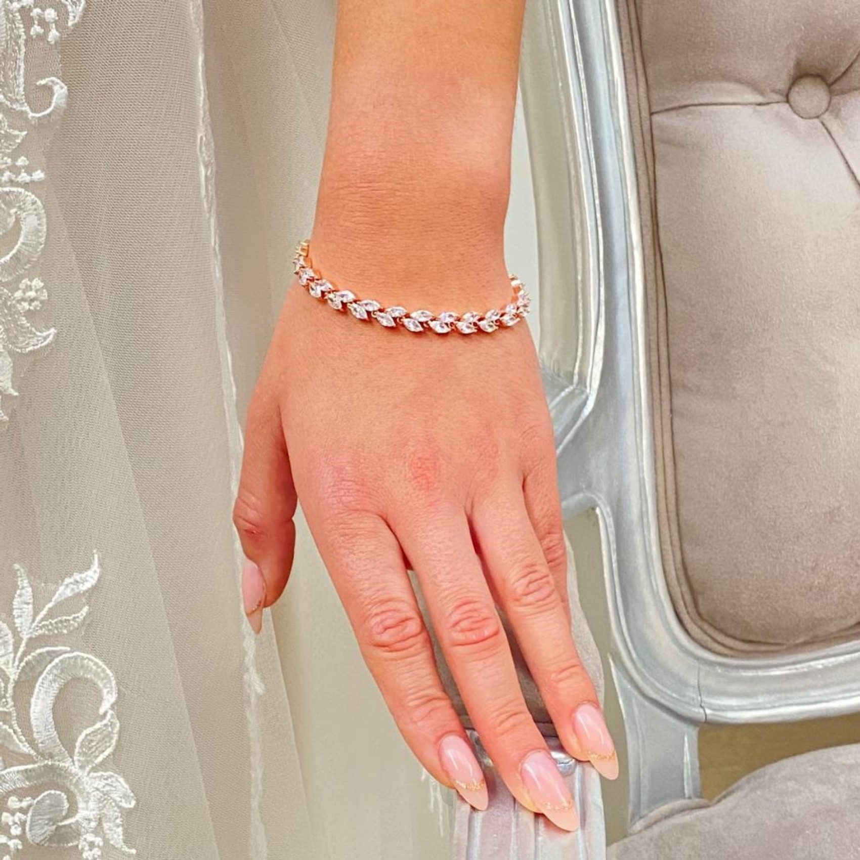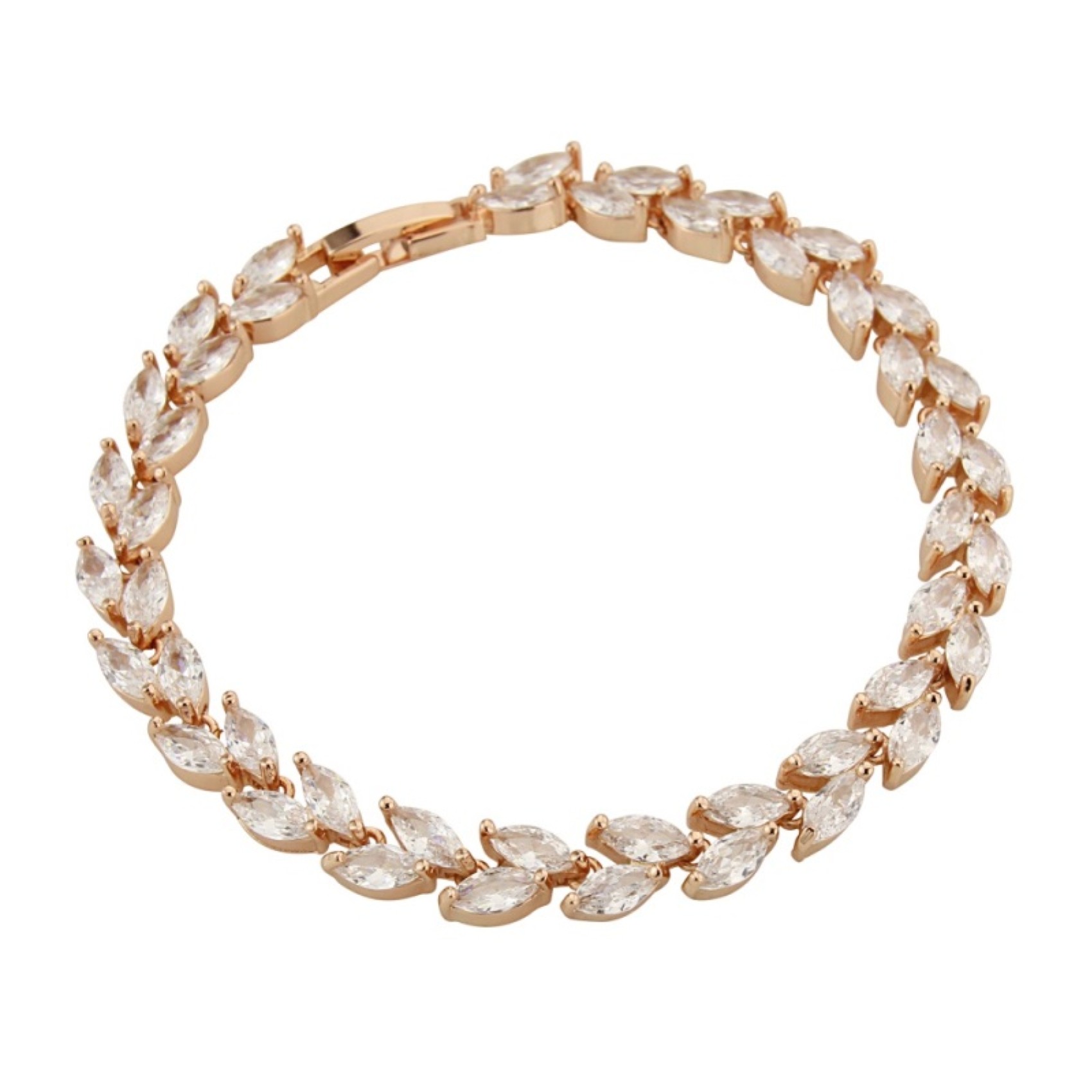 Dieses wunderschöne kristallene Hochzeitsarmband ist mit marquisefarbenen Zirkoniasteinen in Roségoldfassung verziert, die eine glitzernde Blätterranke bilden. Es wird mit einer Faltschließe geschlossen. Eine vielseitige Wahl als Ergänzung zu klassischen, Vintage- oder Bohème-Kleidern.
