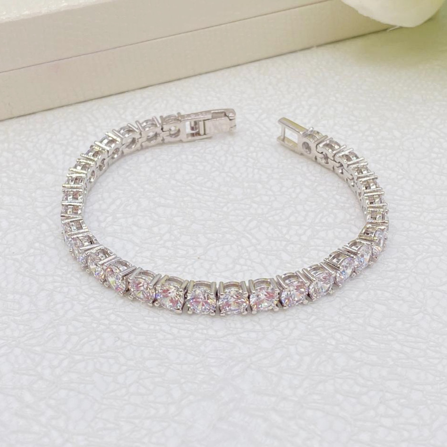 Dieses klassische Kristallarmband besteht aus facettierten Zirkoniasteinen, die in einer schlichten Linie gefasst sind, und wird mit einem Faltverschluss mit Kristalldetails geschlossen. Dieses Hochzeitsarmband mit Zirkonia glitzert und funkelt wie ein Diamant und verleiht jedem Brautlook sofortigen Glamour.
