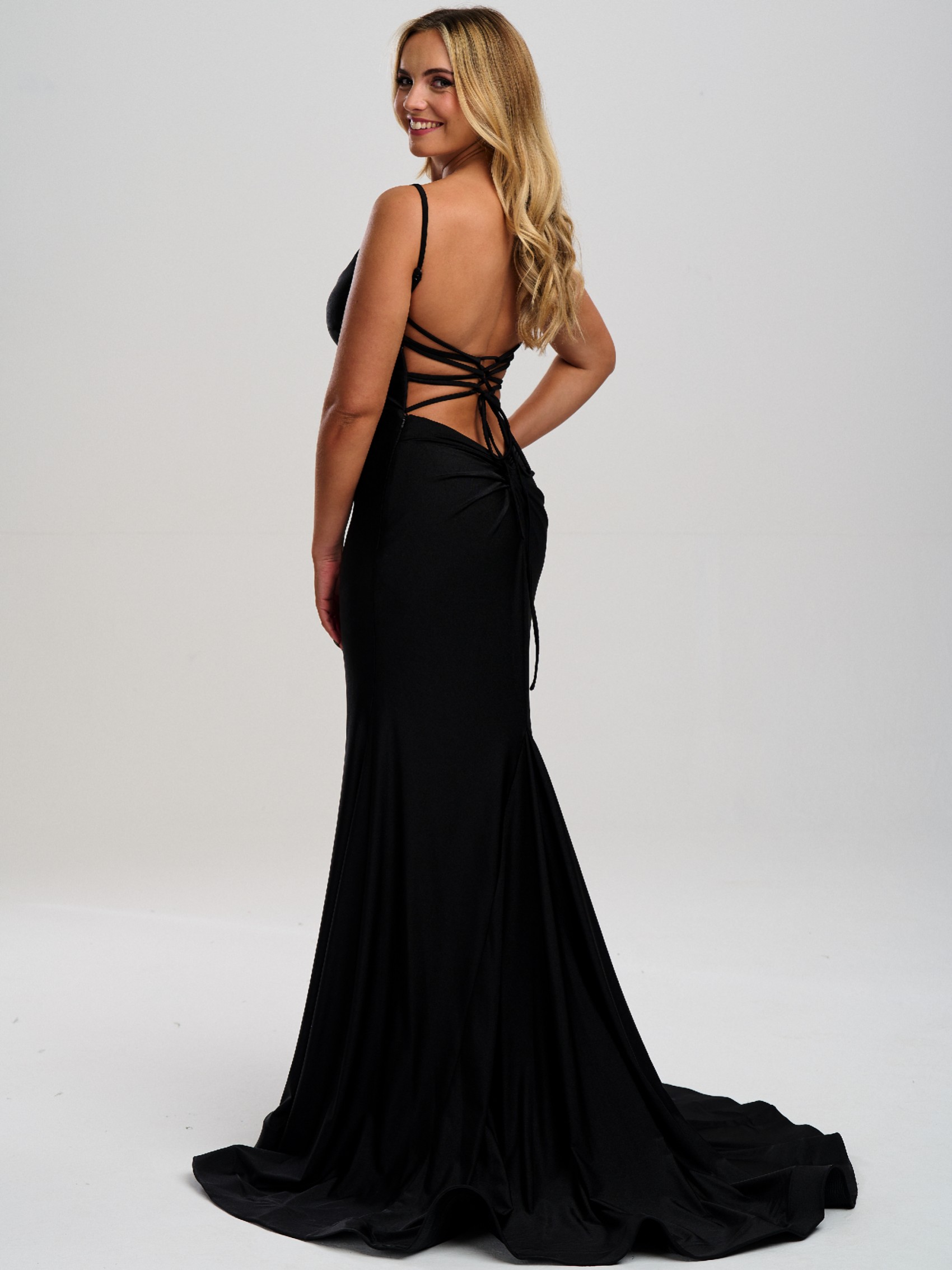 Zeigen Sie Ihre schöne Figur mit diesem atemberaubenden Ballkleid. Schlichtheit ist das Gebot der Stunde mit einer eleganten flachen Vorderseite und zarten Spaghetti-Schulterriemen. Die Rückseite des Kleides ist der Wow-Faktor dieses Designs, mit seinen komplizierten Schleifen und Krawatten, und wirbelnden gerüschten Detail über den Boden. Gepaart mit einem fantastischen breiten Saum, werden Sie sich wie eine Million Dollar fühlen, wenn Sie das PM111 Ballkleid wählen.