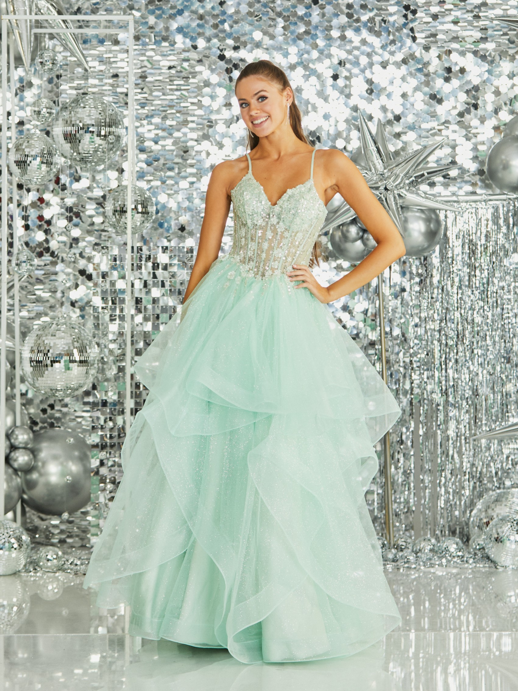 Tiffanys Skye Blassgrünes glitzerndes Rüschen-Abschlussballkleid mit geblümtem Mieder | SKYEGR-TP