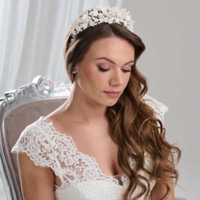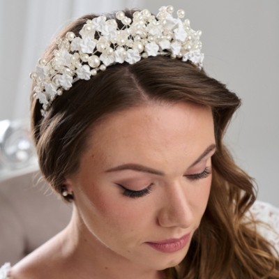 An alle Bräute mit freiem Geist, die sich nach einem Kronen-Moment sehnen! mit zarten Porzellanblumen und einer Mischung aus kleinen und größeren Perlen ist diese Krone so süß wie eh und je für die zukünftige Braut, die feminine Stücke liebt...