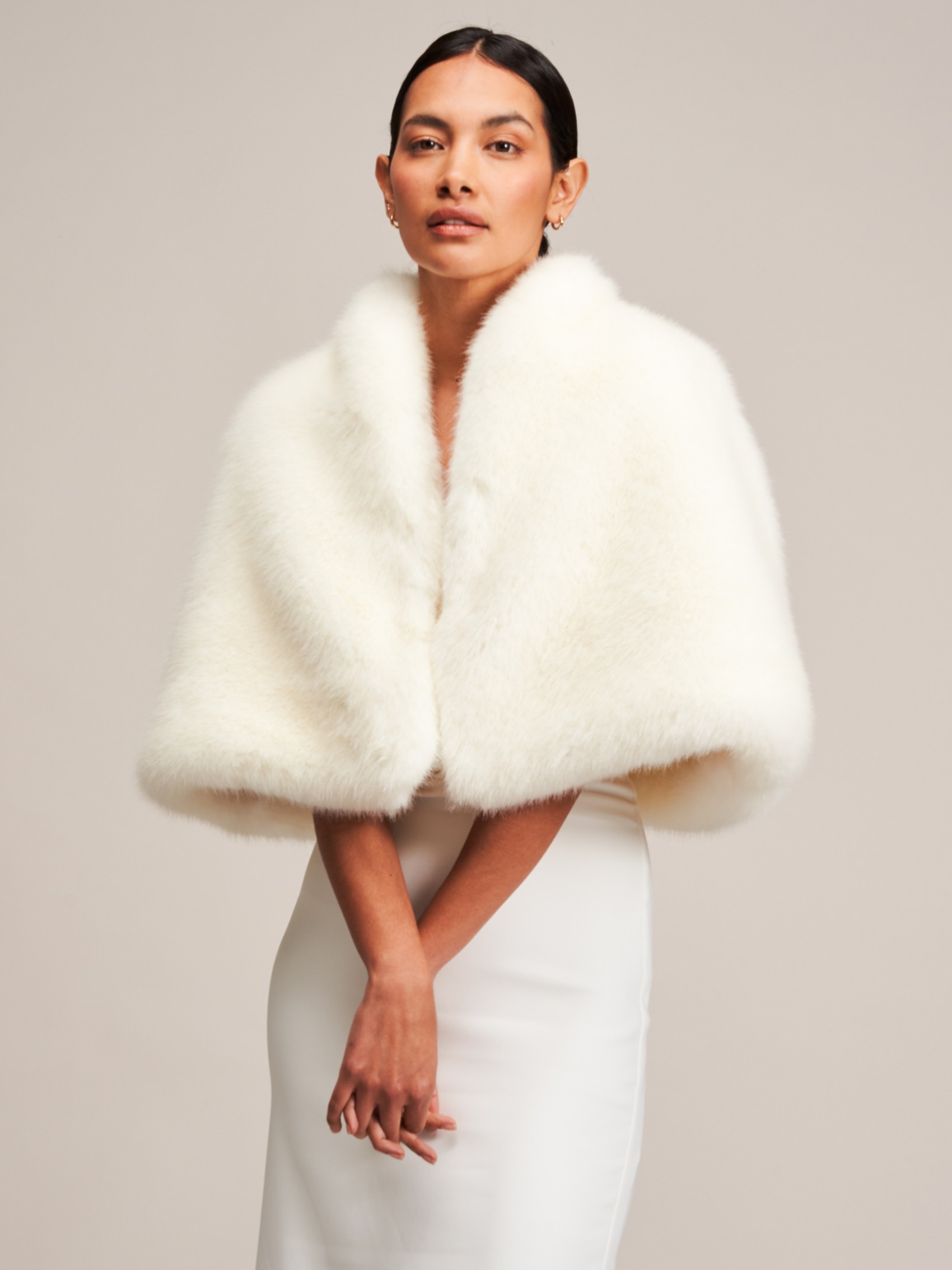 Dieser wunderschöne elfenbeinfarbene kurze Kunstpelz-Brautumhang von Helen Moore ist im Swing-Stil gehalten und sitzt knapp über der Taille. Mit einem hübschen, runden Ausschnitt ist es perfekt für eine Winterbraut und auch für Abendkleidung. Das luxuriös weiche Kunstpelz-Cape ist mit Satin gefüttert und hat einen Haken- und Ösenverschluss am Hals.