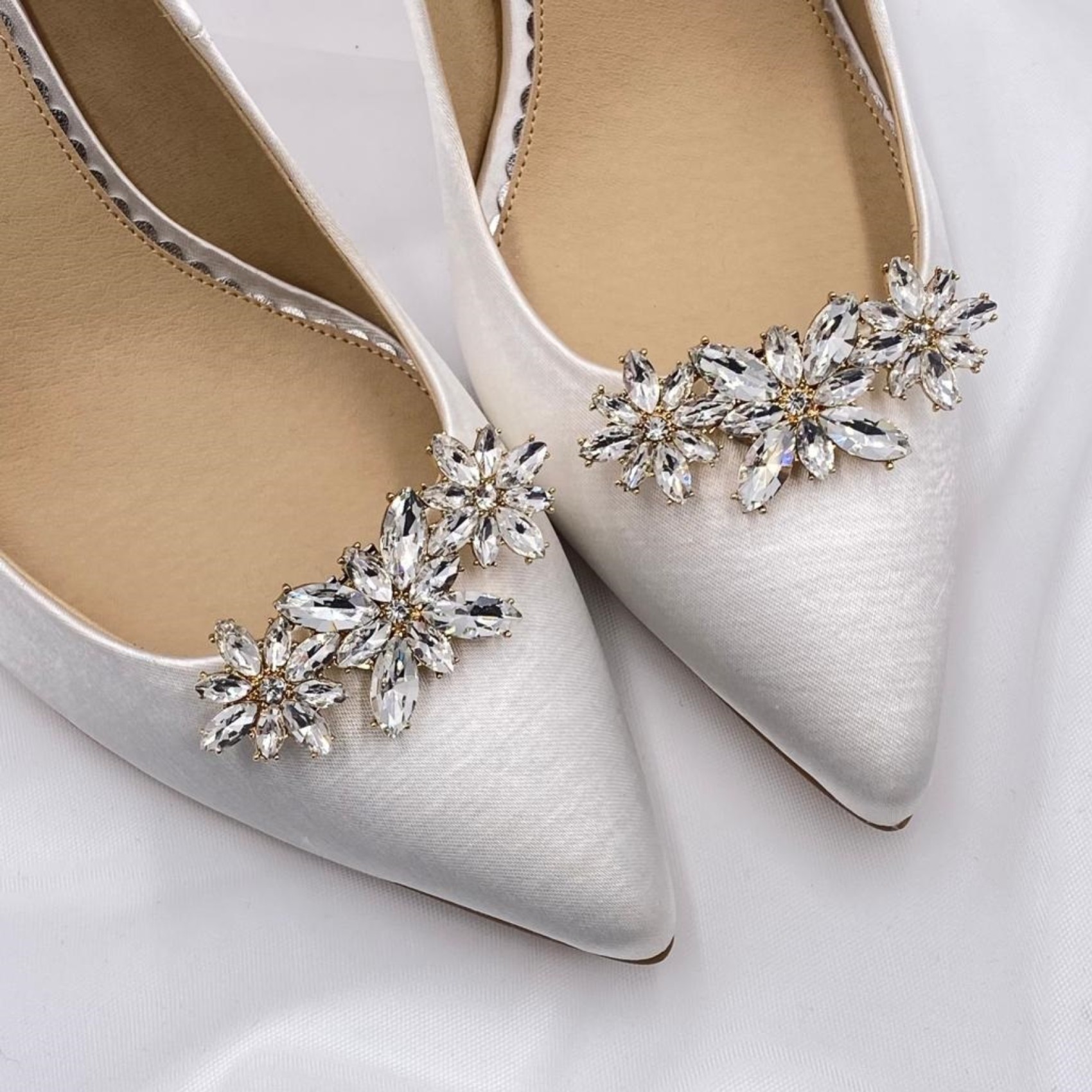 Ein Trio aus goldenen Kristall-Sternschnuppen bildet diese hübschen, von den Himmeln inspirierten Schuhclips. Die funkelnden Marquise-Kristalle in goldenen Fassungen werden einfach an der Vorderseite oder an der Seite eines Schuhs befestigt und verwandeln Ihre Hochzeits- oder Freizeitschuhe.