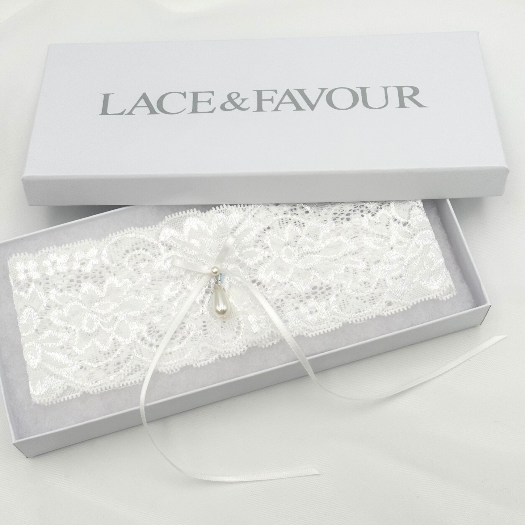 Unser Purity-Hochzeitsstrumpfband ist perfekt für die zurückhaltende Braut. Ein schlichtes Strumpfband aus einer einzigen Lage zarter elfenbeinfarbener Spitze, das mit einer schmalen Schleife aus Satinband und einem hübschen Perlentröpfchen verziert ist. Ein wunderschönes Hochzeitsgeschenk für die klassische Braut, mit diesem hübschen Design können Sie nichts falsch machen!