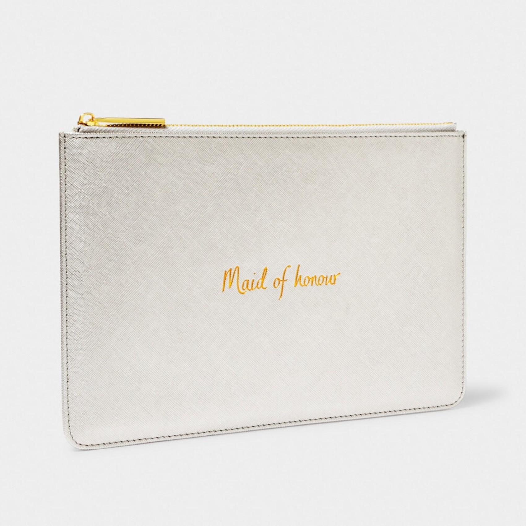 Dieses wunderschöne silberne "Maid of Honour"-Beutelchen ist mit einem goldenen Metallic-Schriftzug und einem goldfarbenen Reißverschluss versehen. Ein hübsches Andenken und eine praktische Tasche, die sie an ihrem besonderen Tag immer bei sich haben kann.