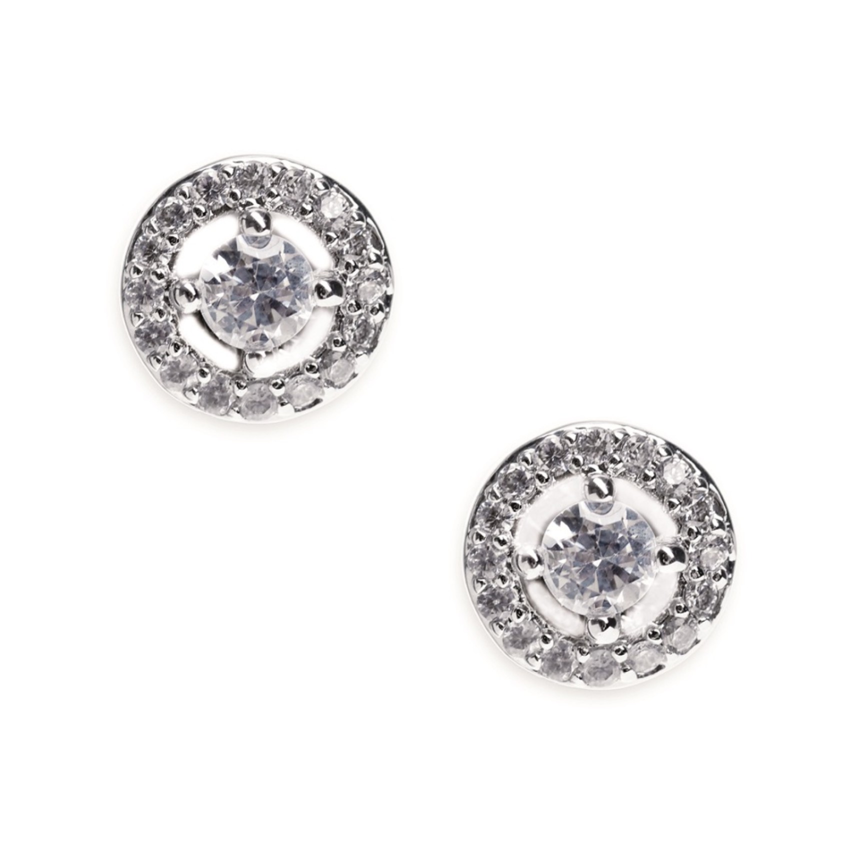 Die zentralen Steine im Brillantschliff sind in diesen zierlichen Ohrsteckern von einem Kreis aus winzigen Kristallen in Pave-Fassung umgeben. Diese klassischen Kristall-Ohrstecker sind eine klassische Wahl für Bräute und Brautjungfern und versprühen ein subtiles Funkeln.