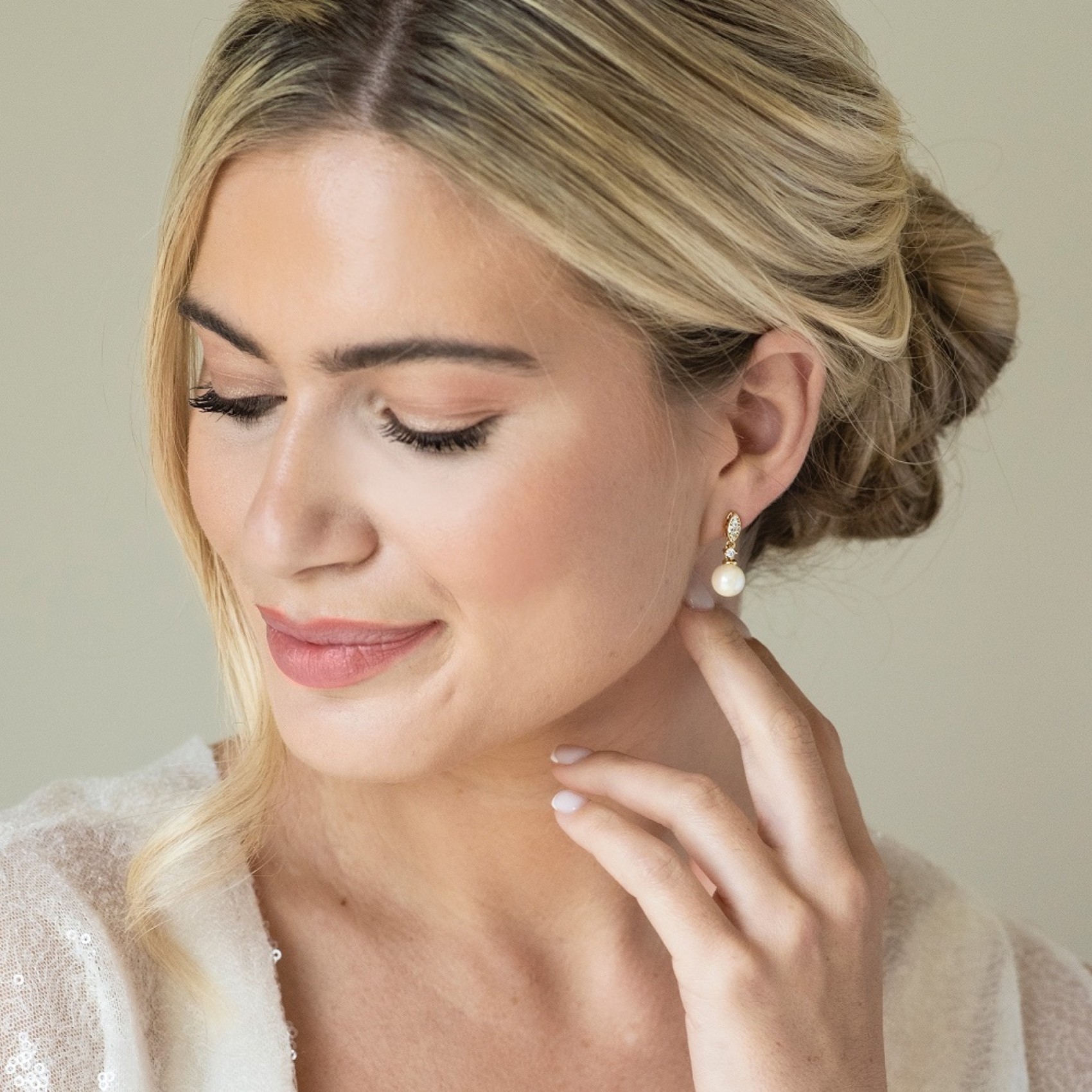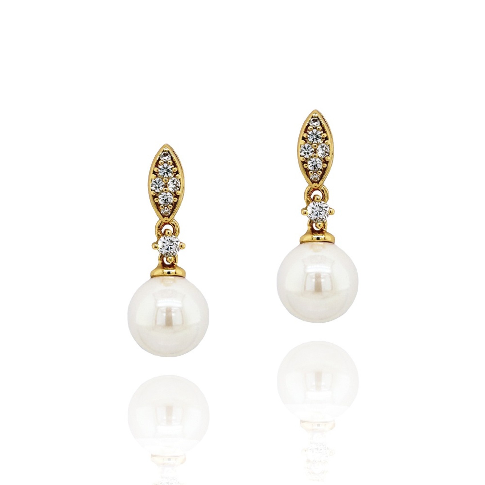 Atemberaubende goldene Perlenohrringe, inspiriert von Vintage-Design mit einem klaren Designer-Look. Verziert mit kubischen Zirkonia-Kristallen und einer elfenbeinfarbenen Perle sind diese Ohrringe für Bräute gedacht, die reines Styling und Luxusdesign lieben.