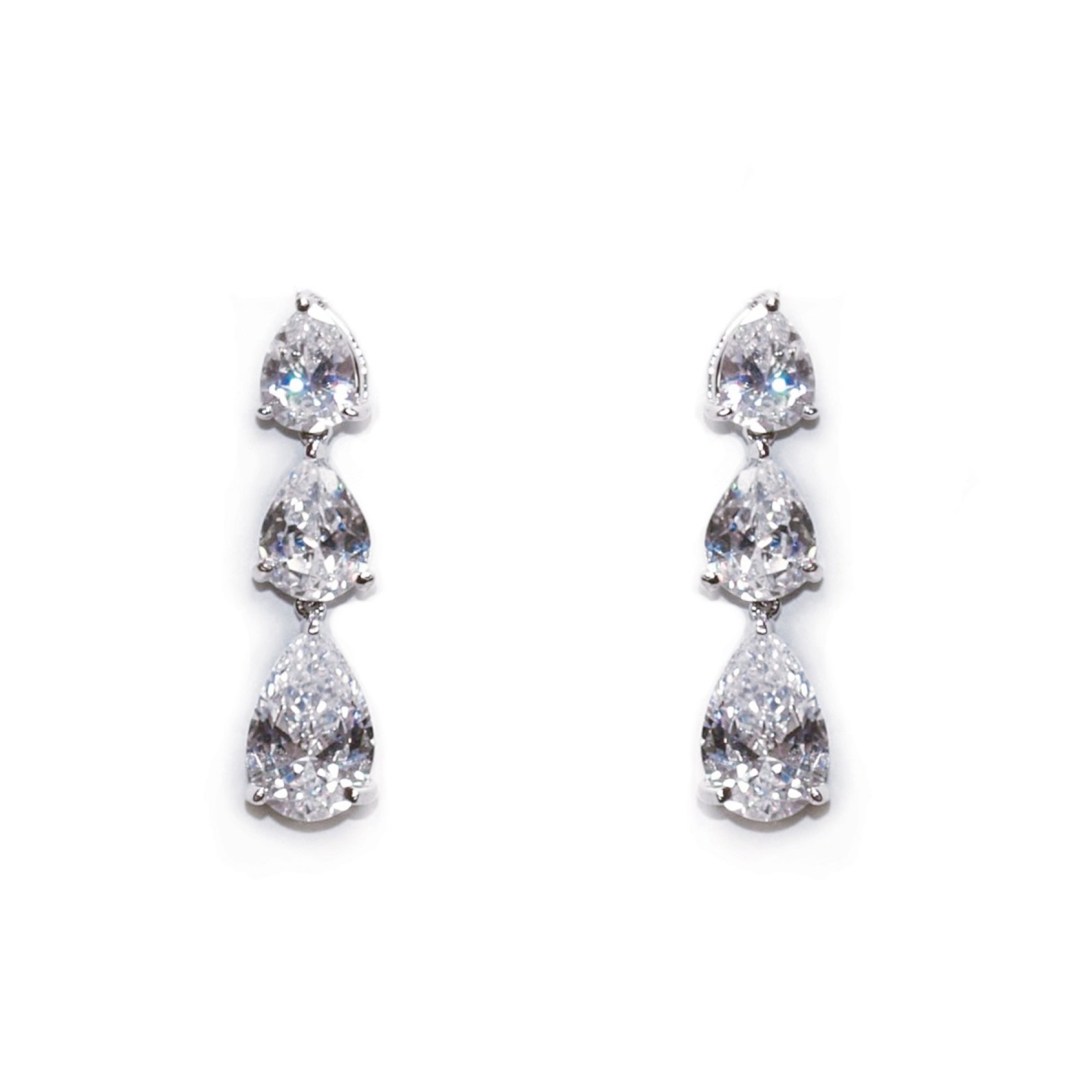 Drei glitzernde tropfenförmige Steine in einer Reihe ergeben ein elegantes Paar Hochzeitsohrringe, das jeden Brautlook ergänzt. Schlicht und unaufdringlich sind diese Kristall-Ohrringe eine schöne Wahl für die klassische Braut. Kombinieren Sie sie mit der passenden Halskette, um den Look zu vervollständigen.
