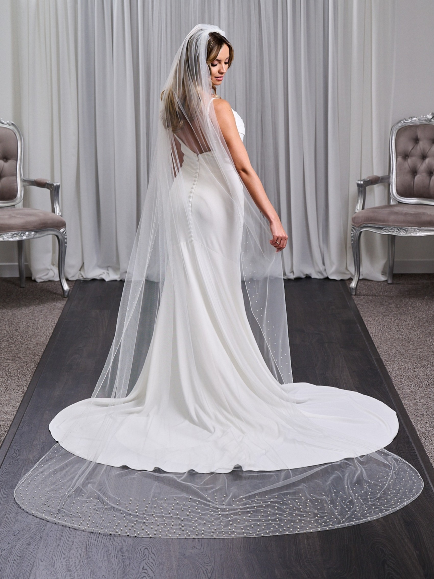 Chicago ist ein wunderschön gestalteter langer Brautschleier aus weichem elfenbeinfarbenem Tüll mit einer stark verzierten Perlenschleppe und einem schmaleren Perlenrand am Kamm. Kombinieren Sie diesen langen Perlenschleier mit einem eleganten Kleid für einen herrlich modernen Hochzeitslook.