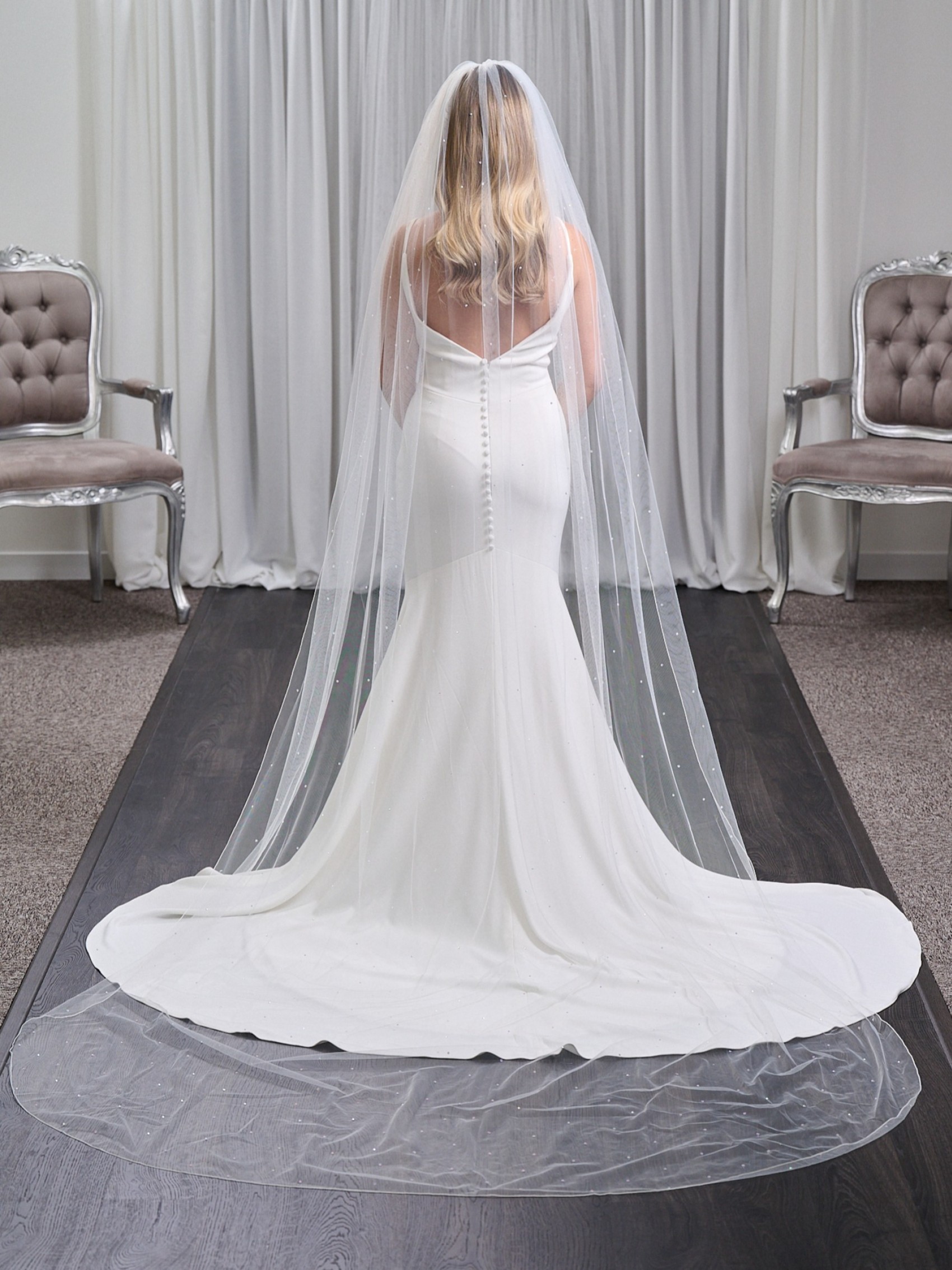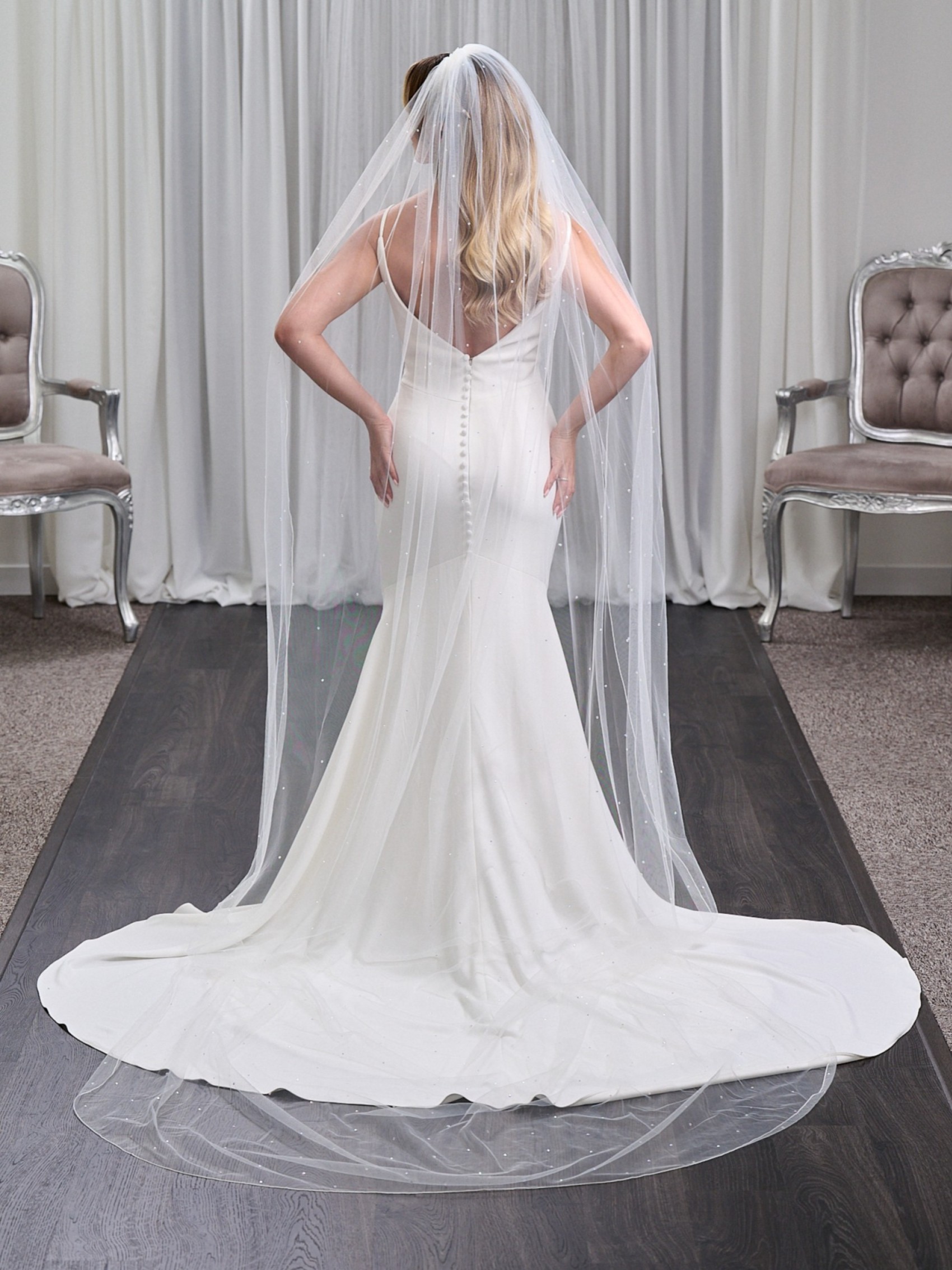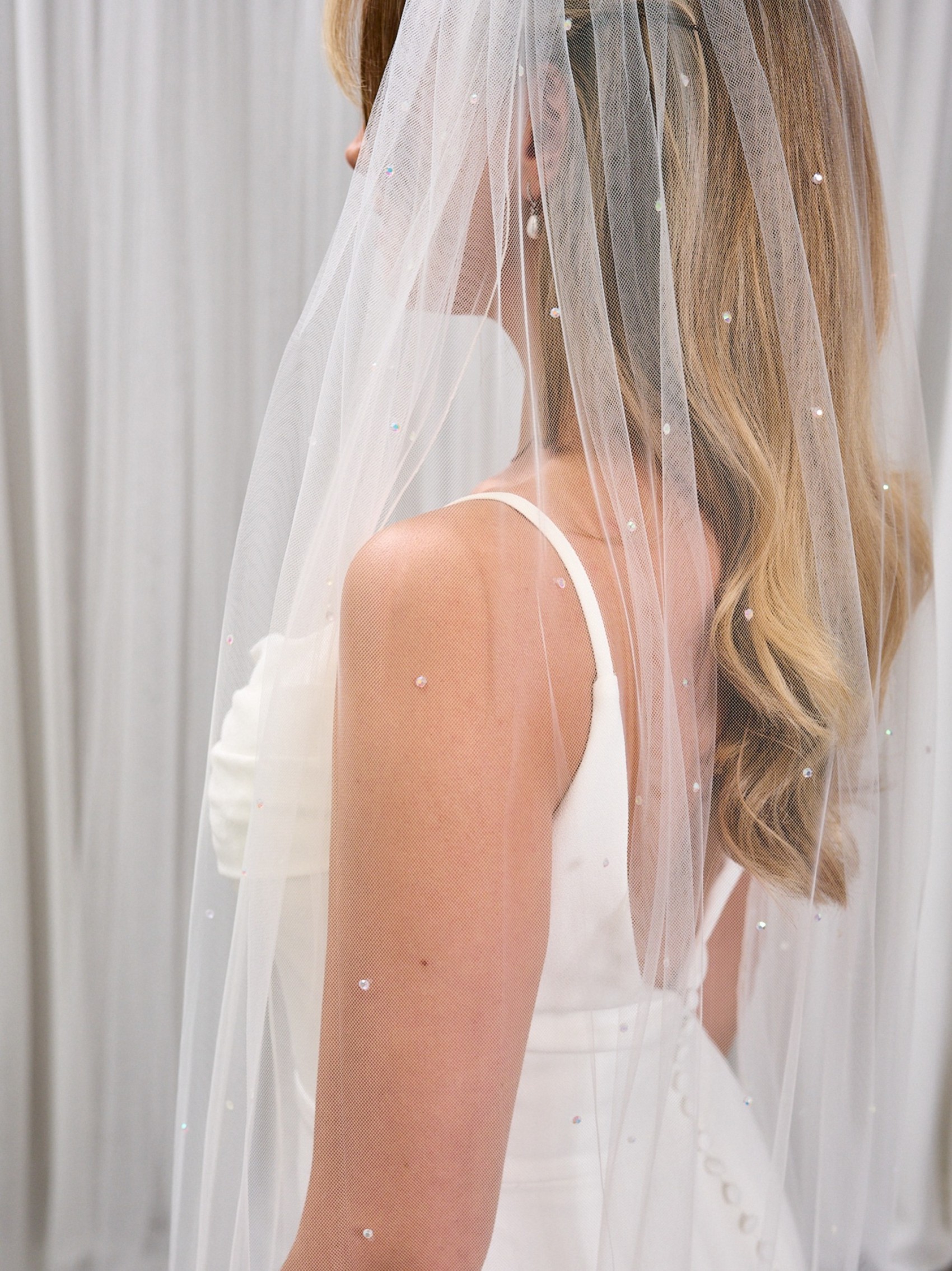 Leuchten Sie in Lovington mit diesem atemberaubenden, glitzernden Schleier auf. Hergestellt aus einer einzigen Schicht aus weichem, durchsichtigem Tüll, der mit Dutzenden von funkelnden AB-Steinen besetzt ist. Abgeschlossen mit einer sauberen Kordelkante ist dieser Brautschleier in 4 verschiedenen Längen erhältlich, um Ihr Kleid perfekt zu ergänzen.