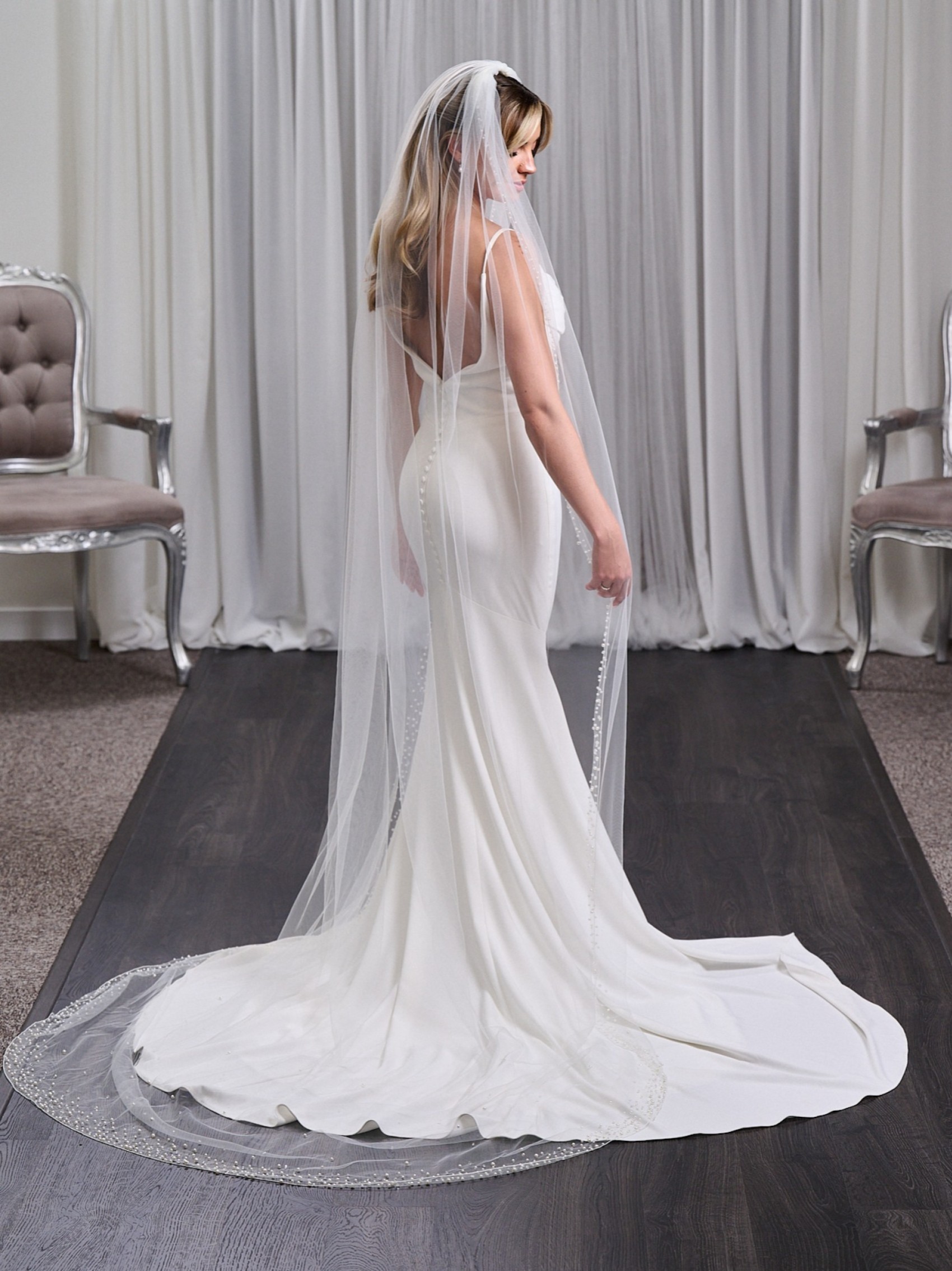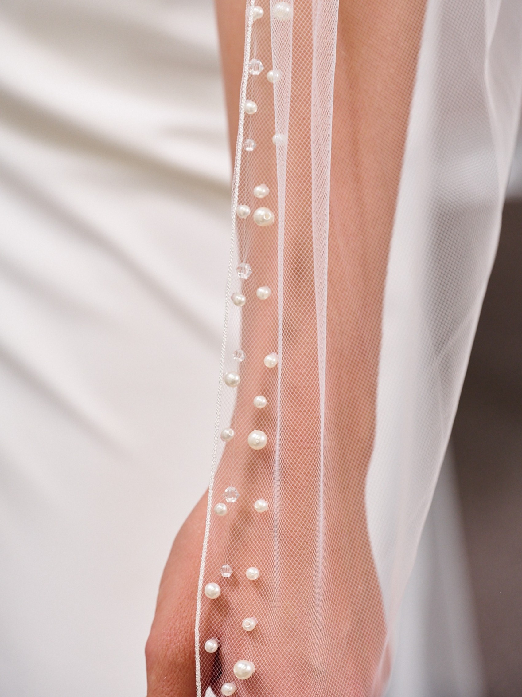 Unser Manhattan-Schleier ist eine wunderschöne Kombination aus Perlen und Kristallen, die Ihrem Look raffinierten Glamour verleiht. Er ist aus einer einzigen Lage weichem, elfenbeinfarbenem Tüll gefertigt und verfügt über eine stark verzierte Umrandung mit verstreuten Perlen und Kristallen sowie eine saubere Kordelkante. Erhältlich in Kapellen- oder Kathedralenlänge zur perfekten Ergänzung Ihres Kleides.