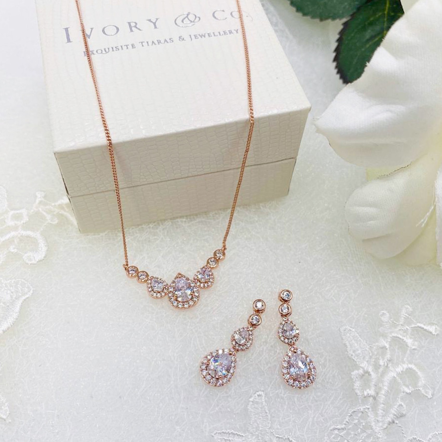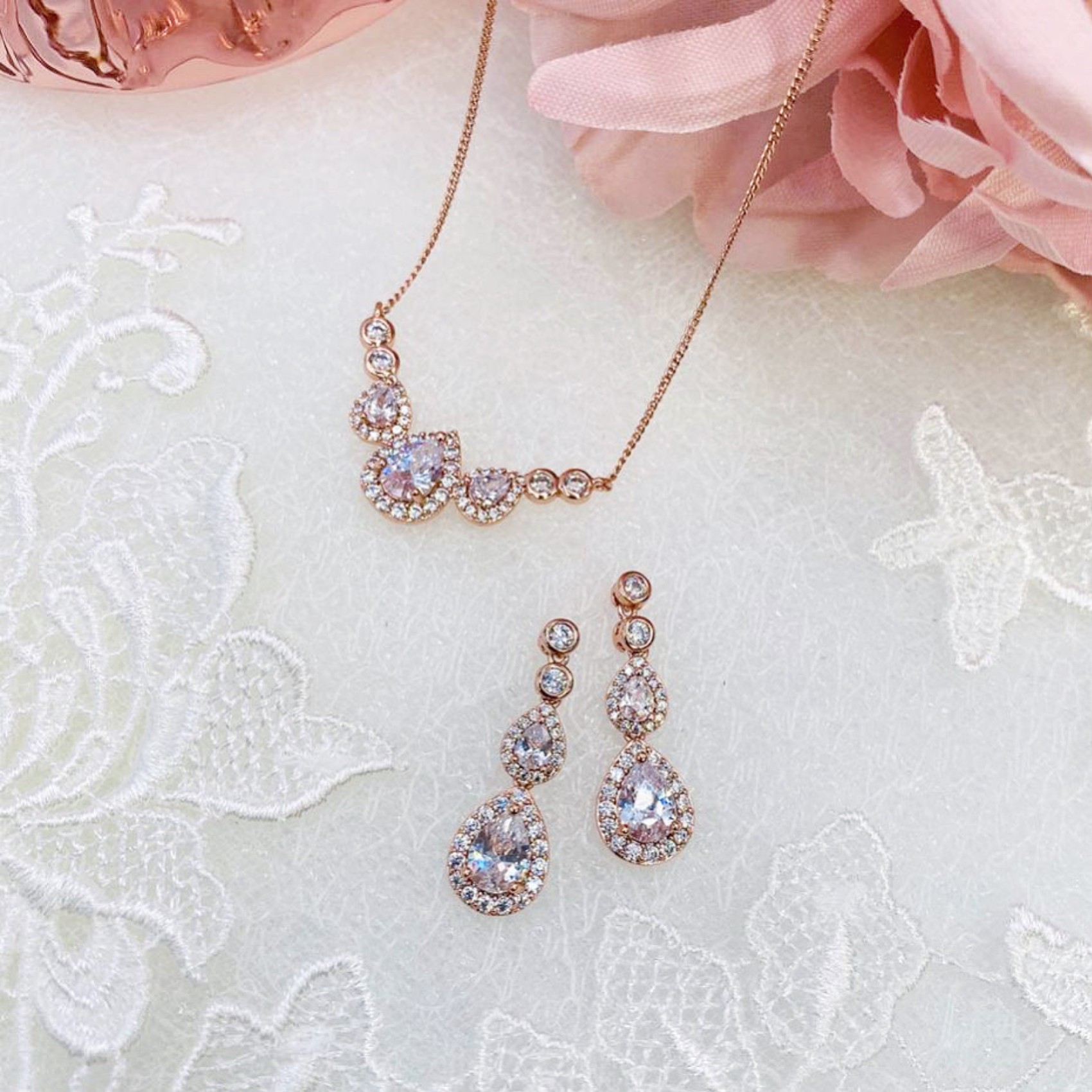 Dieses wunderschöne und elegante Schmuckset in Roségold besteht aus zierlichen Tropfenkristallen, die mit winzigen Steinen in Pavee-Fassung und Solitärkristallen eingefasst sind. Dieses zeitlose Brautschmuckset ist eine wunderbare Ergänzung zu Vintage-Looks und klassischen Looks.