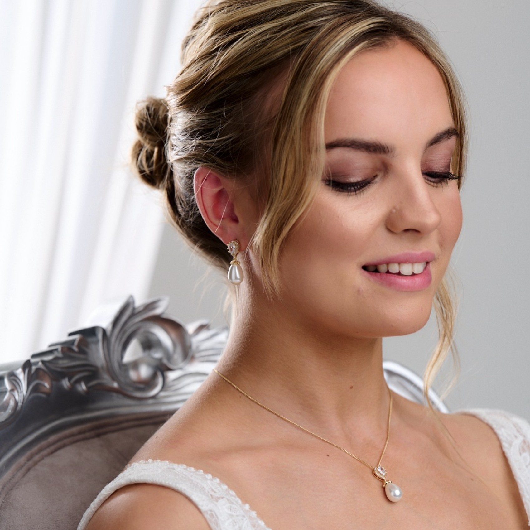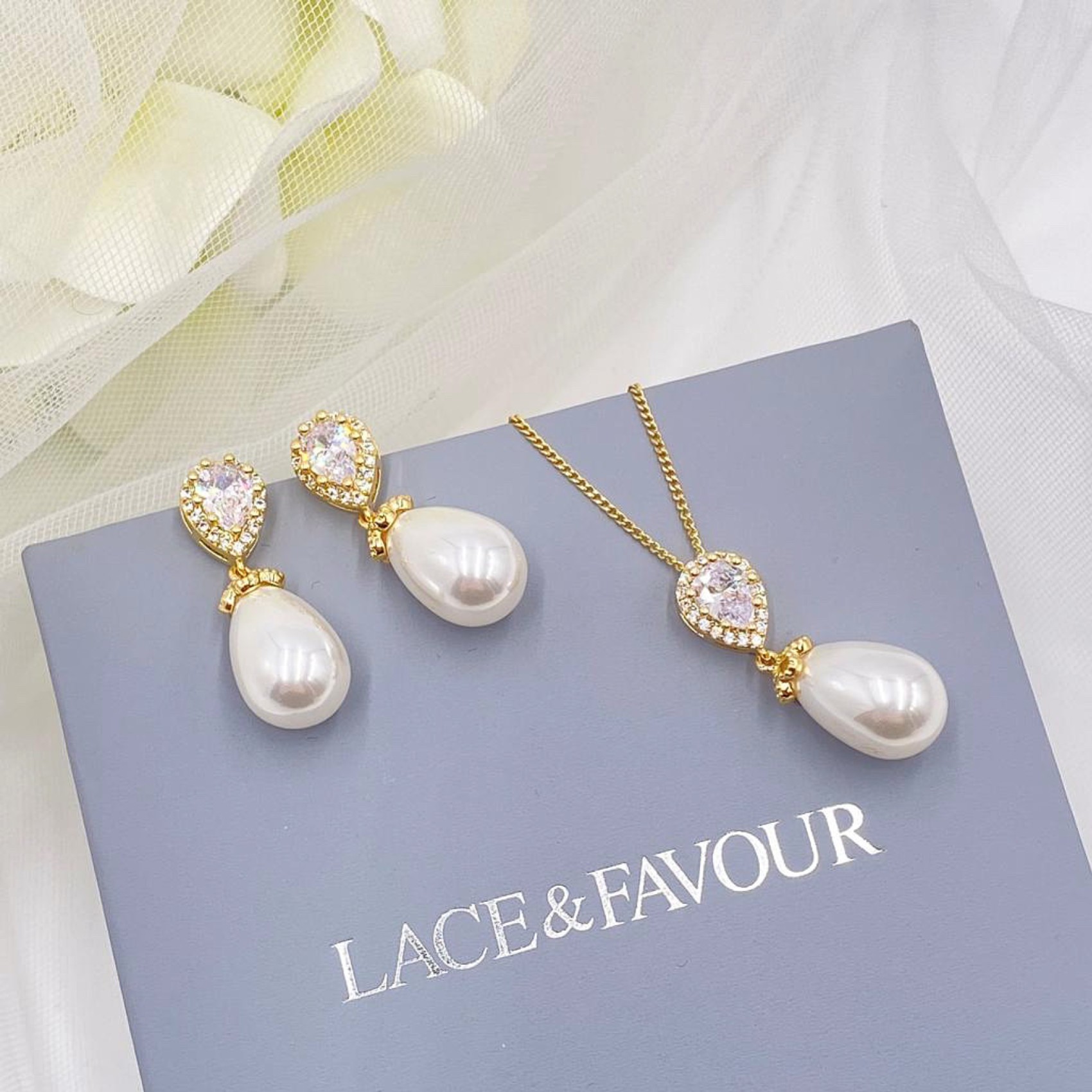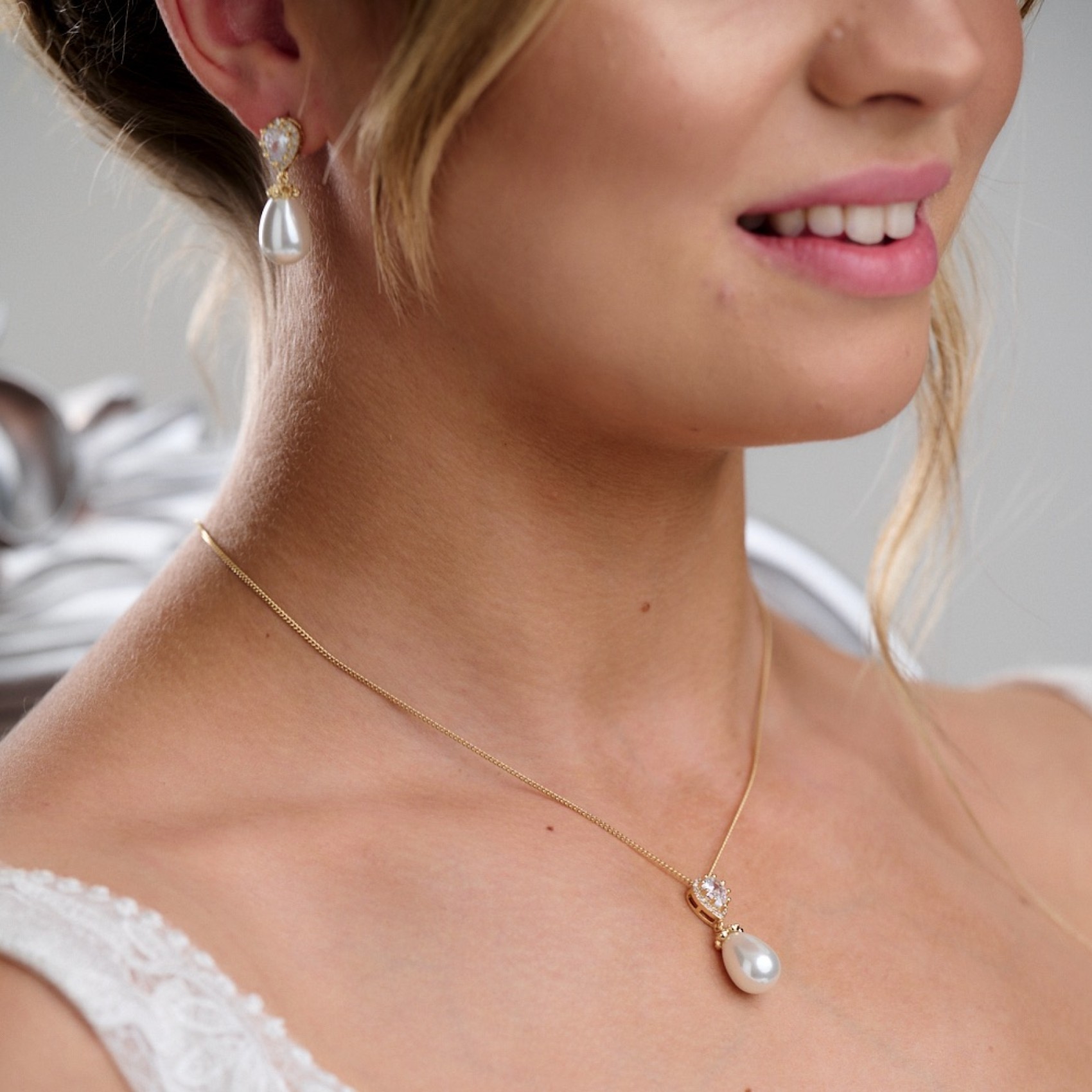 Jede Braut liebt Paloma! Ein zeitloses und elegantes Perlen-Brautschmuckset mit klaren Zirkonia-Kristallen und einer schimmernden elfenbeinfarbenen Tränenperle. Dieses wunderschöne goldene Hochzeitsschmuckset ist perfekt für jeden Brautlook.