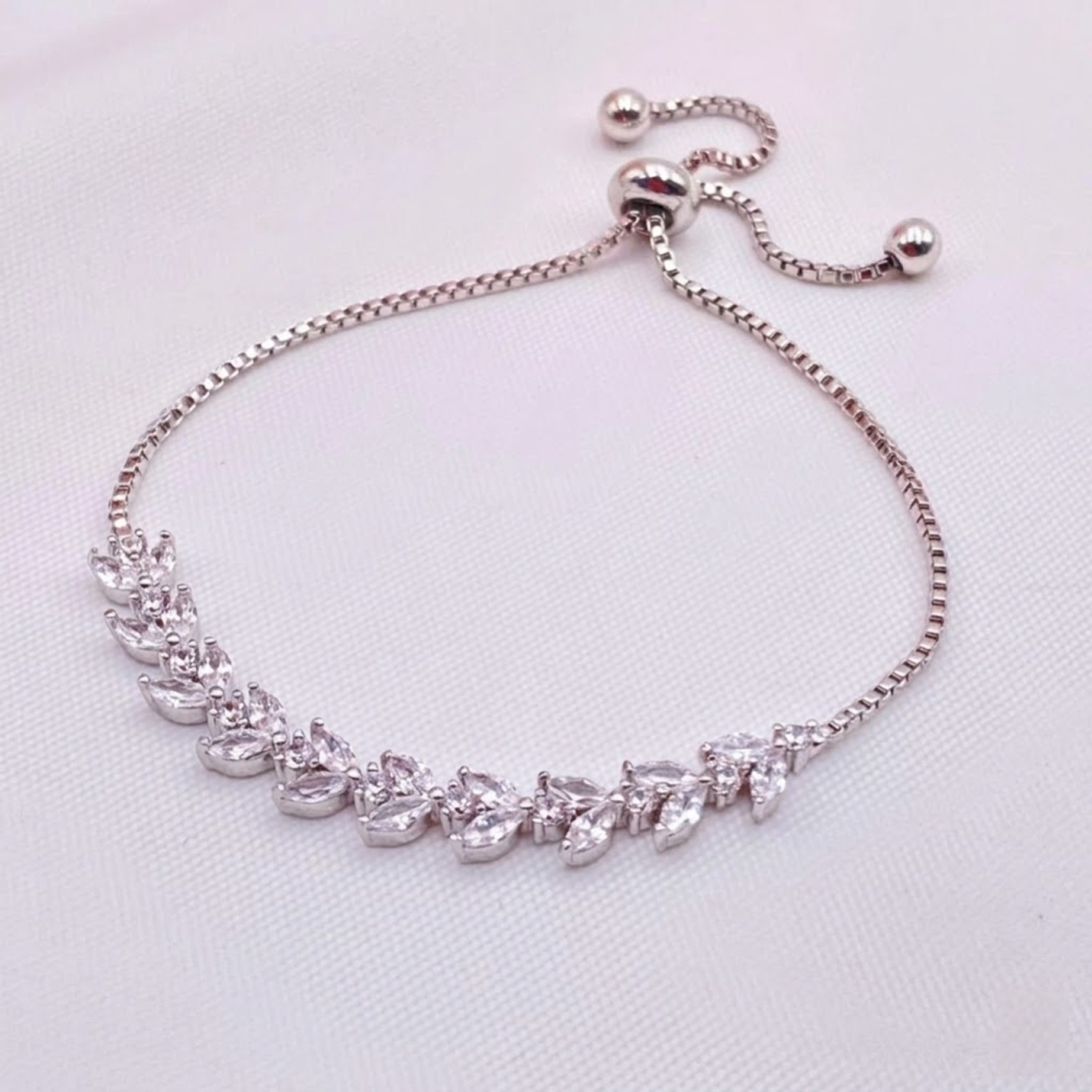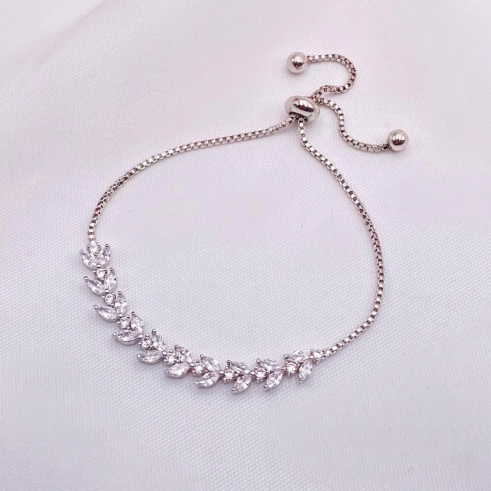 Glitzernde, blattförmige CZ-Kristalle sind mit runden, zierlichen Steinen in diesem zierlichen, verstellbaren Hochzeitsarmband verstreut. Ein schönes Schmuckstück für Bräute und Brautjungfern gleichermaßen macht dieses Armband das ideale Hochzeitsgeschenk.