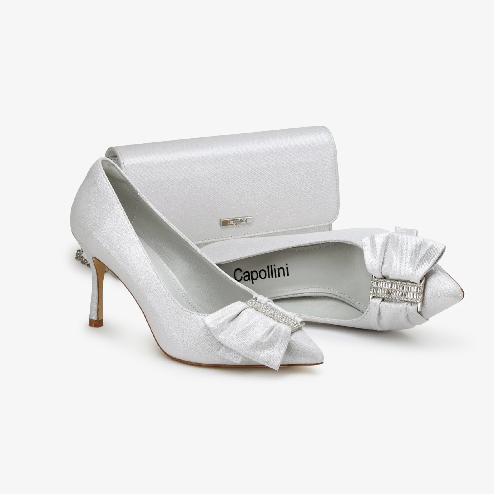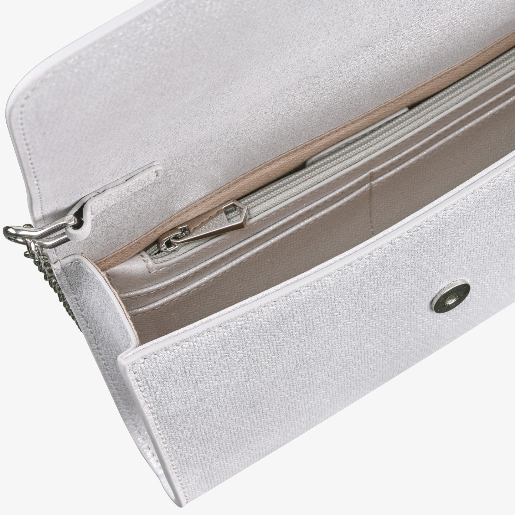 Diese handgefertigte, zeitlose Handtasche aus gletscherweißem Nubukleder verfügt über einen weichen Magnetverschluss, ist schön gefüttert und hat ein großes Fach mit Reißverschluss sowie ein offenes Innenfach. Tragen Sie die Tasche als traditionelle Clutch oder benutzen Sie die lange, abnehmbare Schulterkette, um die Hände frei zu haben. Capollini ist das Gütesiegel.