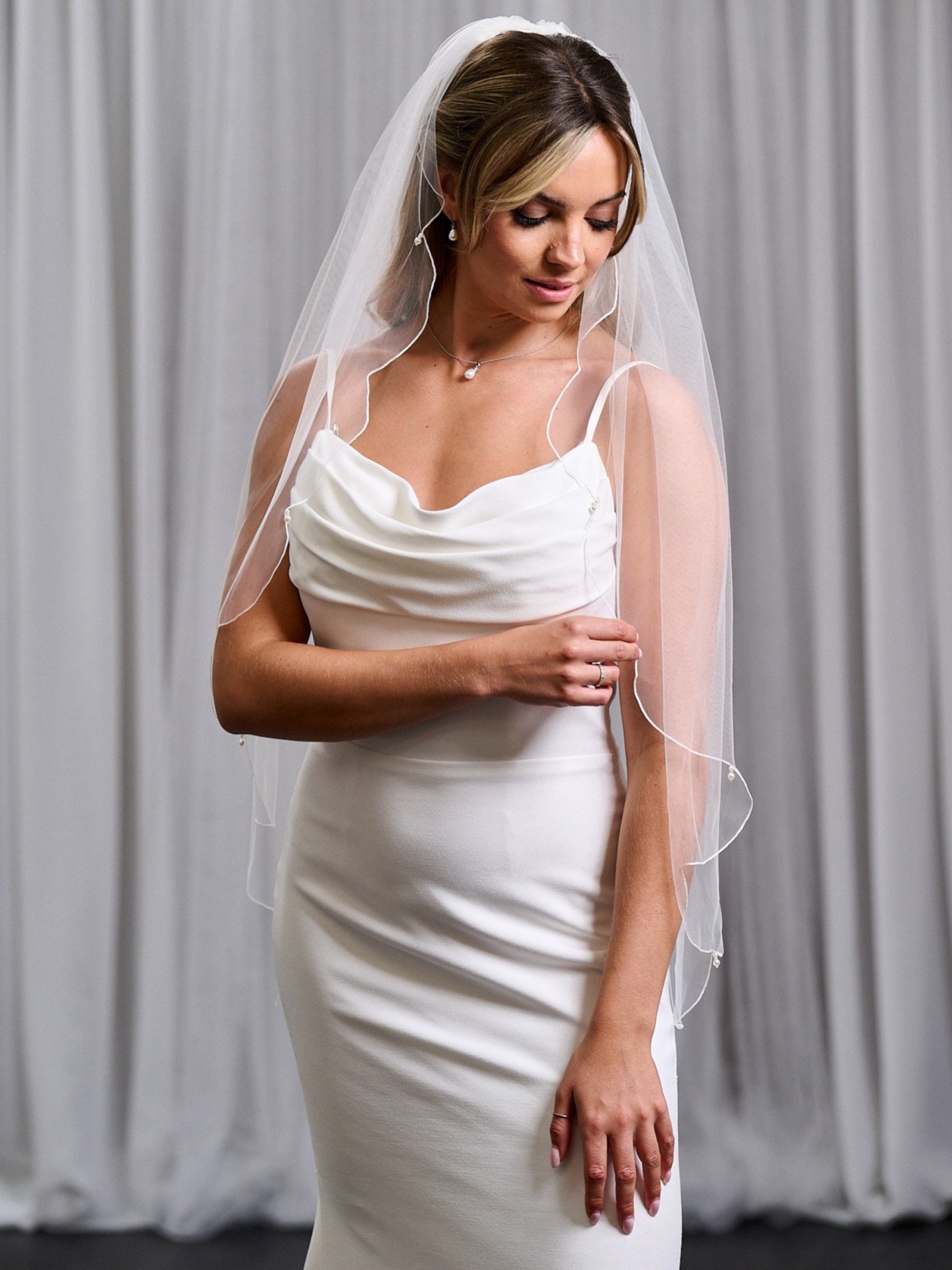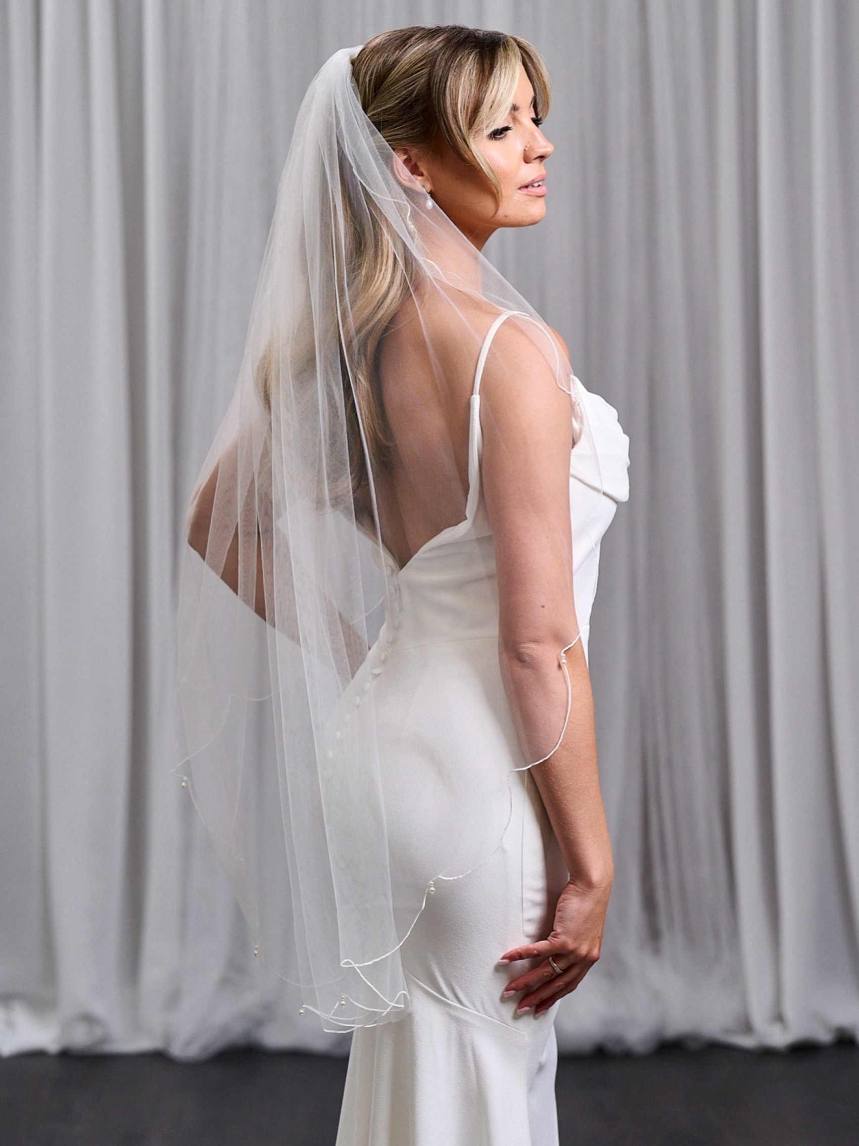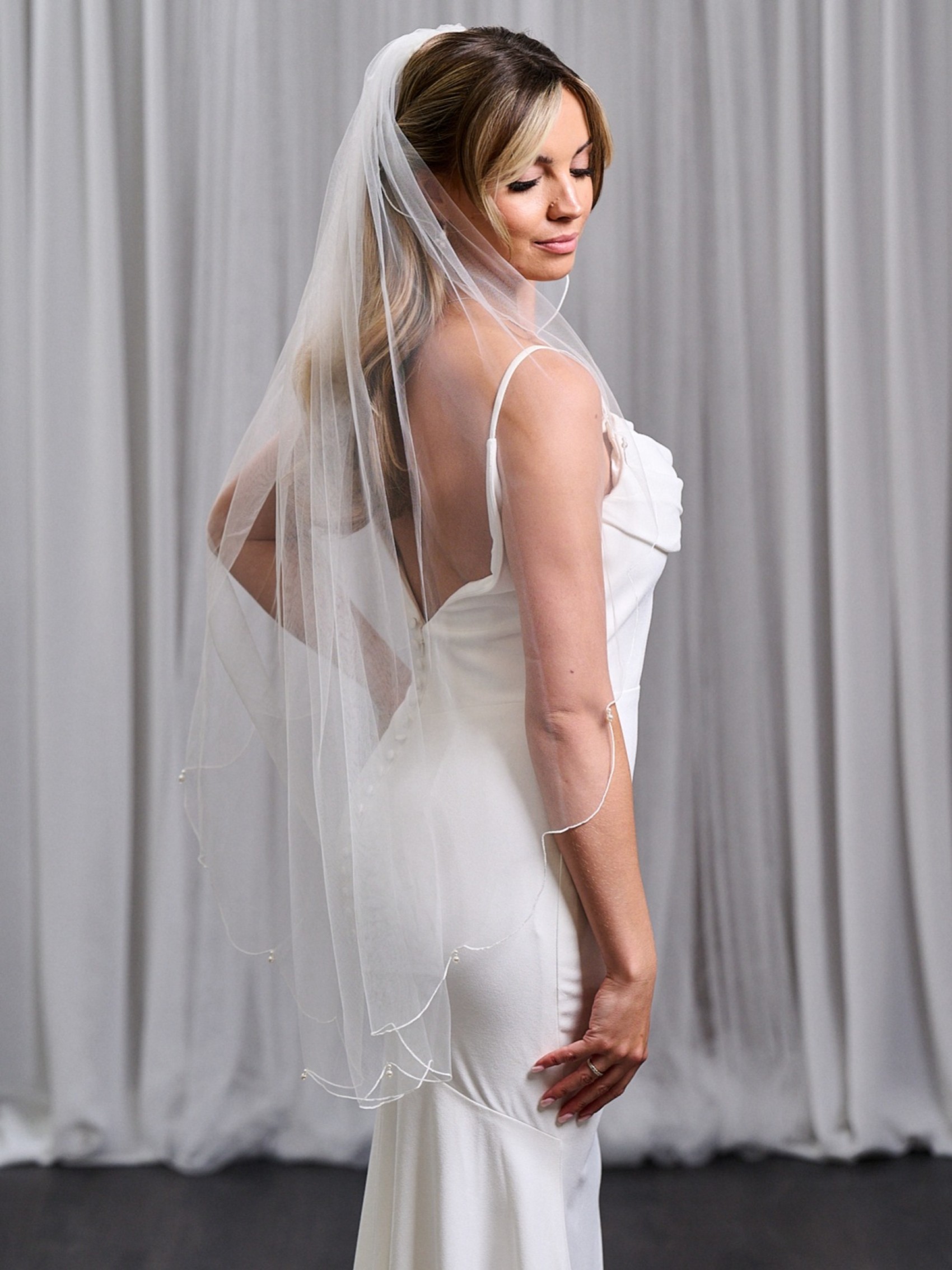 Ein eleganter Fingerspitzen-Schleier mit einer hübschen Kordel, die mit zierlichen Perlentropfen verziert ist. Handgefertigt aus einer einzigen Lage weichen elfenbeinfarbenen Tülls ist dieser Brautschleier perfekt für eine schicke Stadt-Hochzeit.