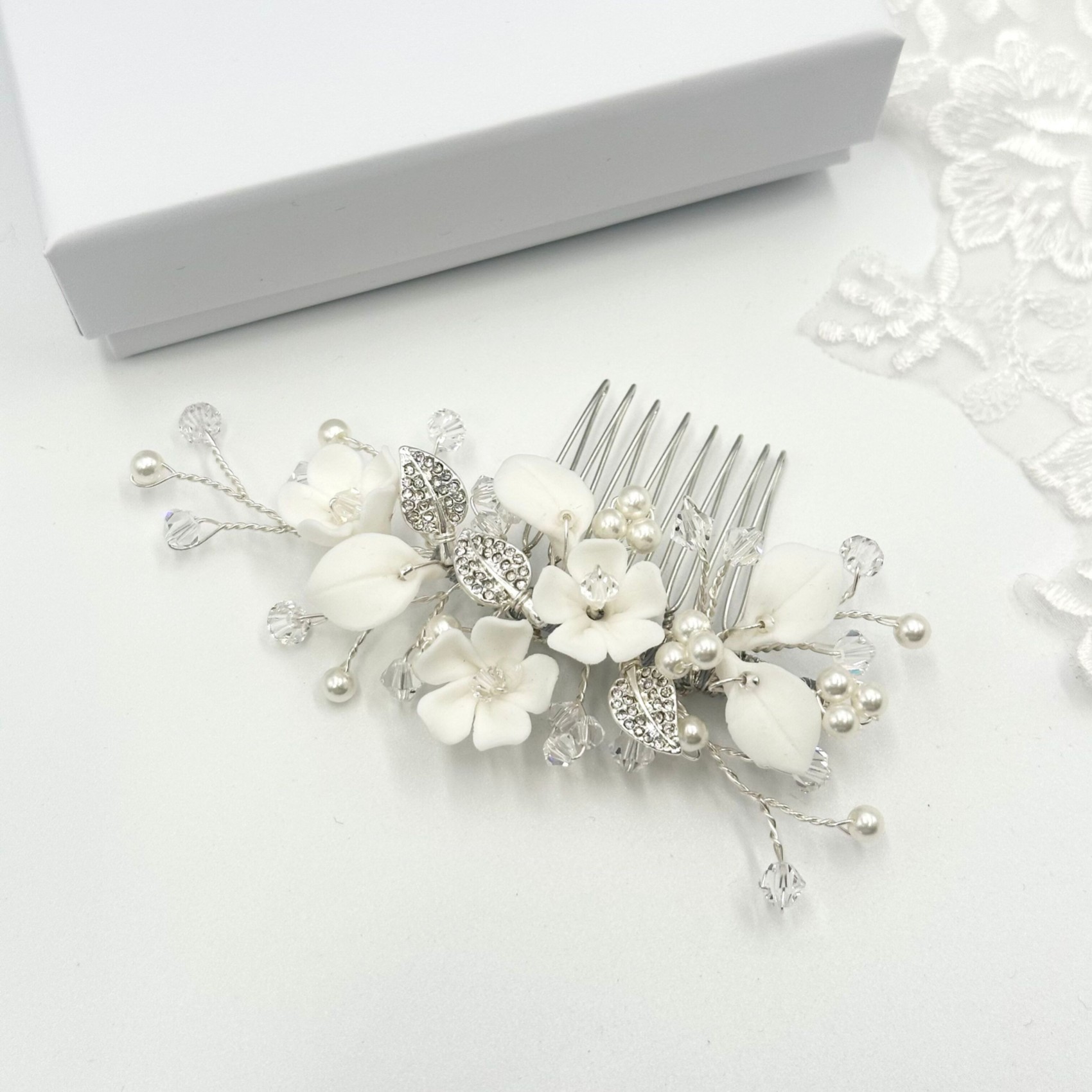 Wir lieben einfach alles an diesem Mini-Hochzeitshaarkamm! Wunderschön handgefertigt mit zierlichen cremefarbenen Keramikblumen, Perlen- und Kristallzweigen und glitzernden Diamantenblättern. Unserer Meinung nach sieht dieser Kamm am besten aus, wenn Sie ihn zu einer Hochsteckfrisur oder zu einer Hochsteckfrisur stylen. Aufgrund seiner geringen Größe ist es auch perfekt für Brautjungfern und Blumenmädchen geeignet!