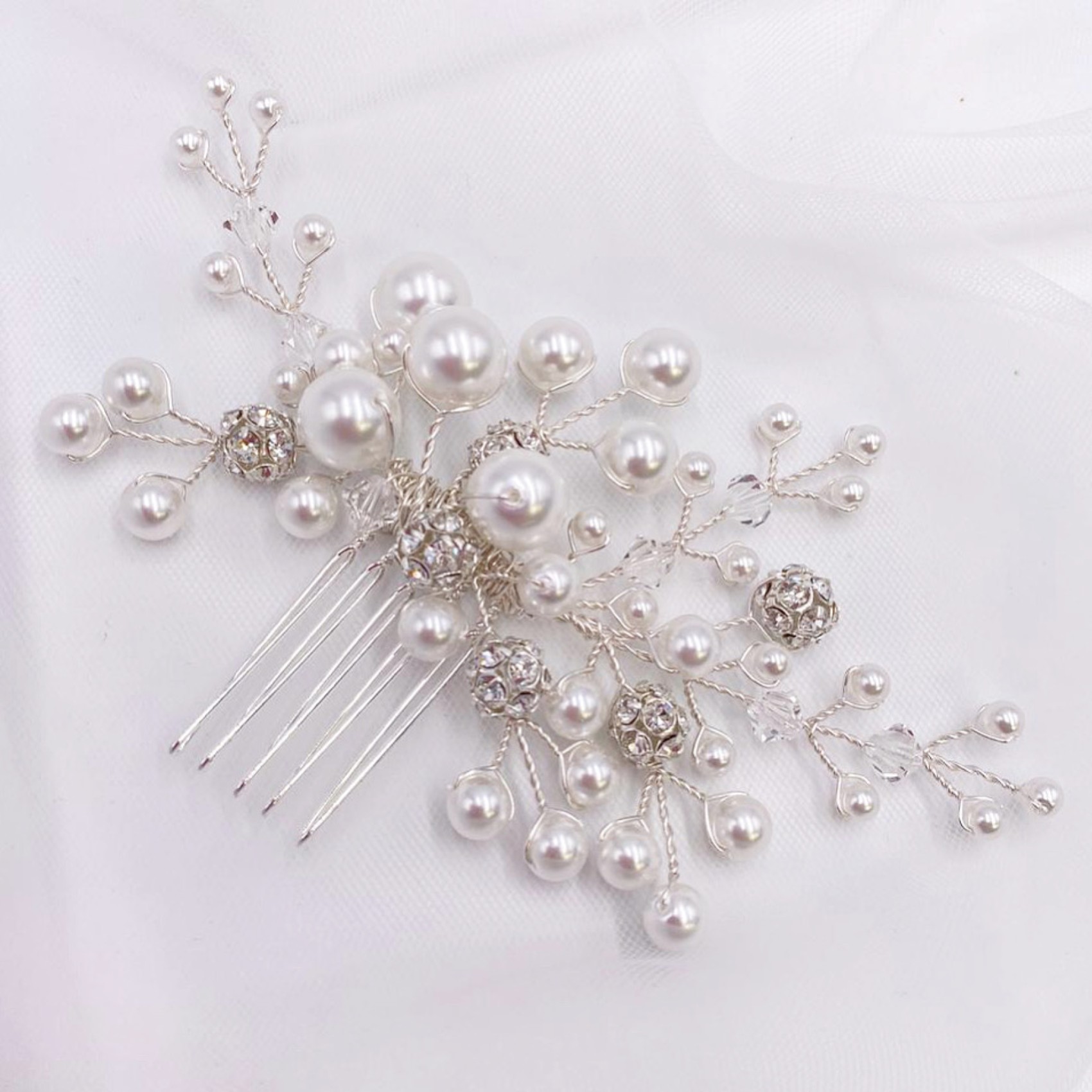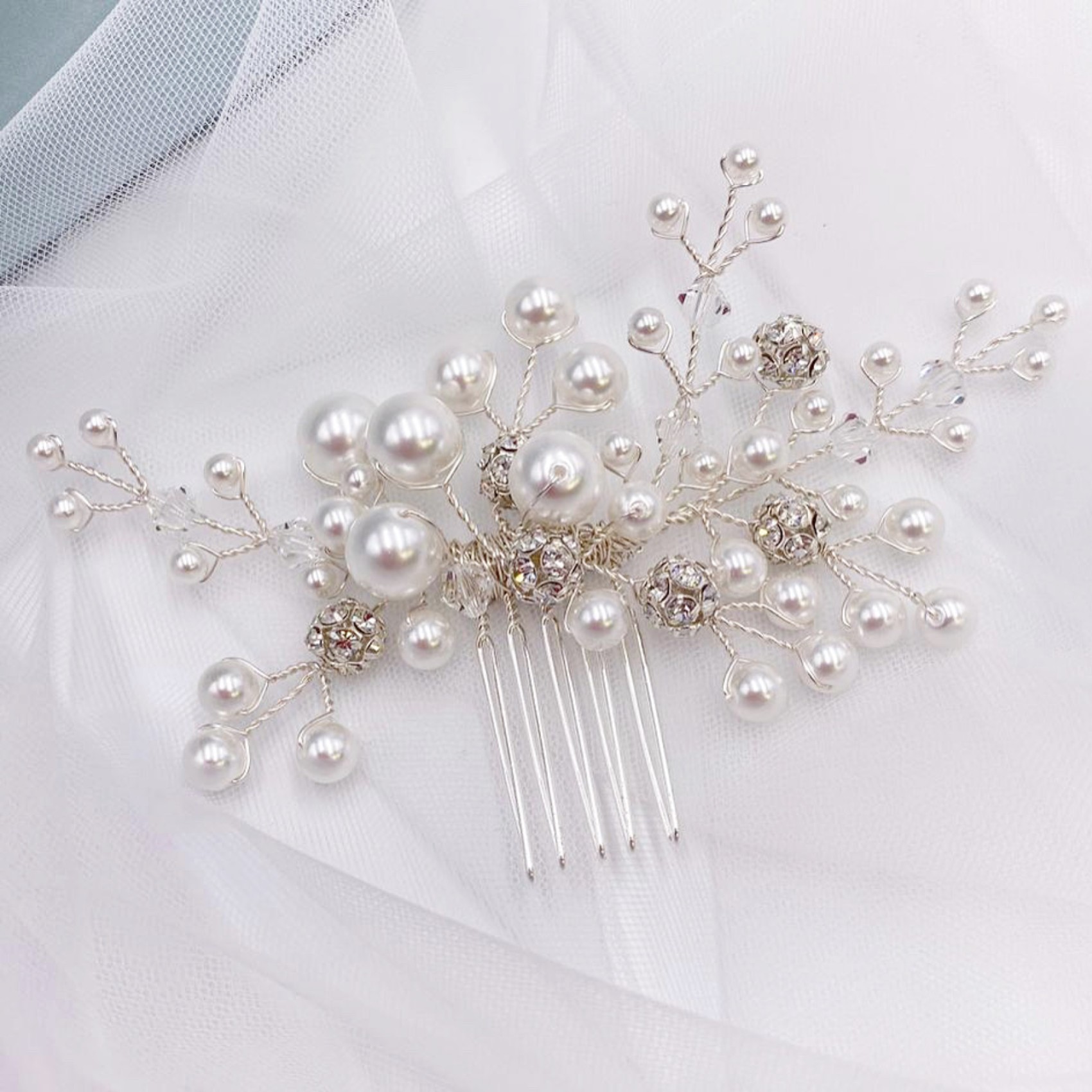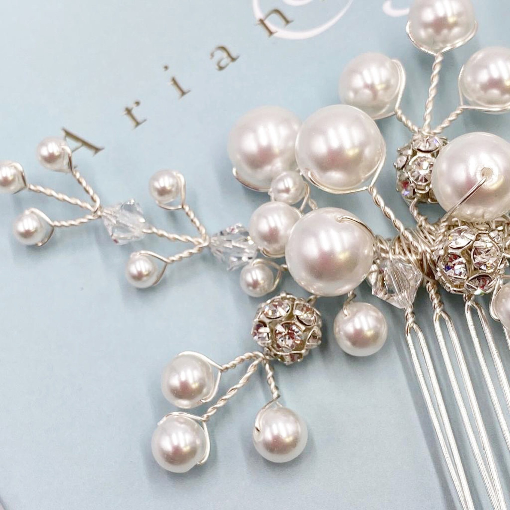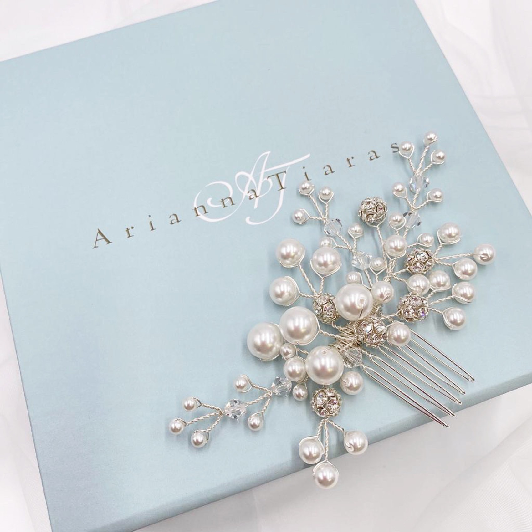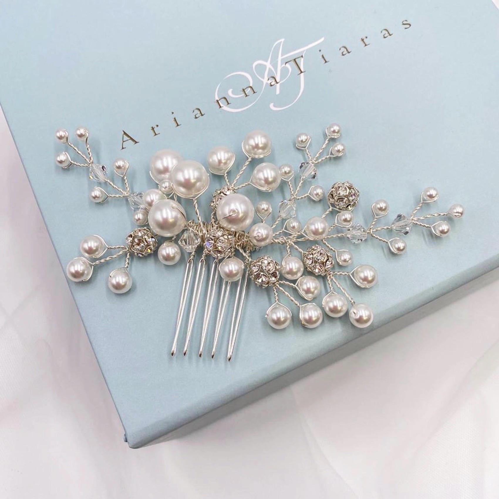 Die moderne Schlichtheit unseres Everlasting Perlenkamms mit einem kleinen Extra an Glanz. Handgefertigt mit leuchtenden, mehrreihigen Perlen, glitzernden, gepflasterten Diamanten und schimmernden Kristallen.