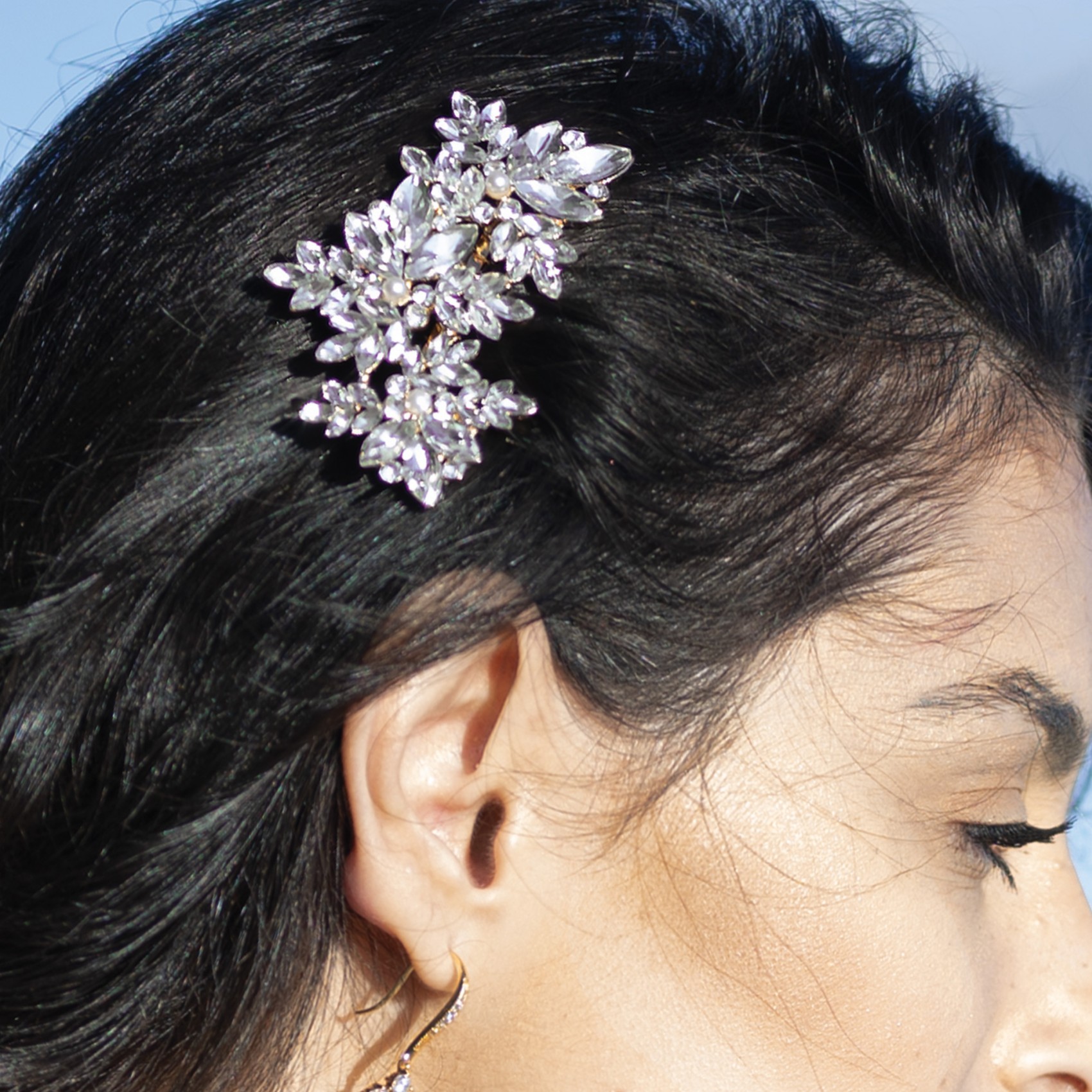 Moonstar ist ein schillernder und doch zierlicher goldener Hochzeitskamm mit echter Wirkung. Geschliffene Marquise-Kristalle sind mit Perlen in einem wunderschönen, von Vintage inspirierten Design gefasst. Dieses Stück sieht wunderschön aus, wenn es entweder am Hinterkopf über einem Dutt und Schleier oder an der Seite einer Frisur getragen wird. Ideal für Bräute, die ein raffiniertes Accessoire mit einem Hauch von Glamour und viel Glanz suchen! Seine zierliche Größe macht ihn auch zum perfekten Accessoire für Brautjungfern. Besetzt mit echten österreichischen Kristallen mit Facettenschliff, die wie echte Diamanten funkeln, und natürlich schimmernden elfenbeinfarbenen Simulationsperlen.