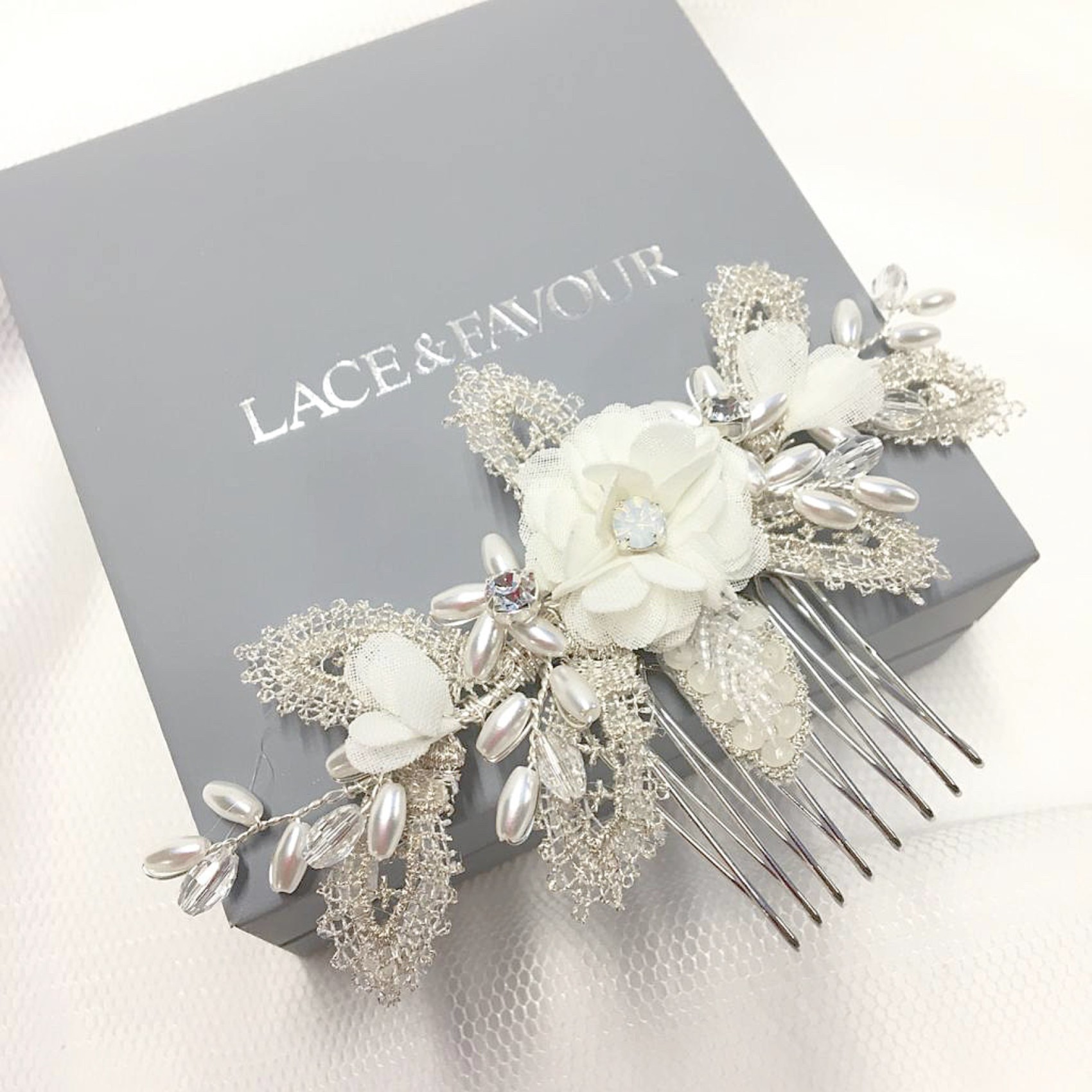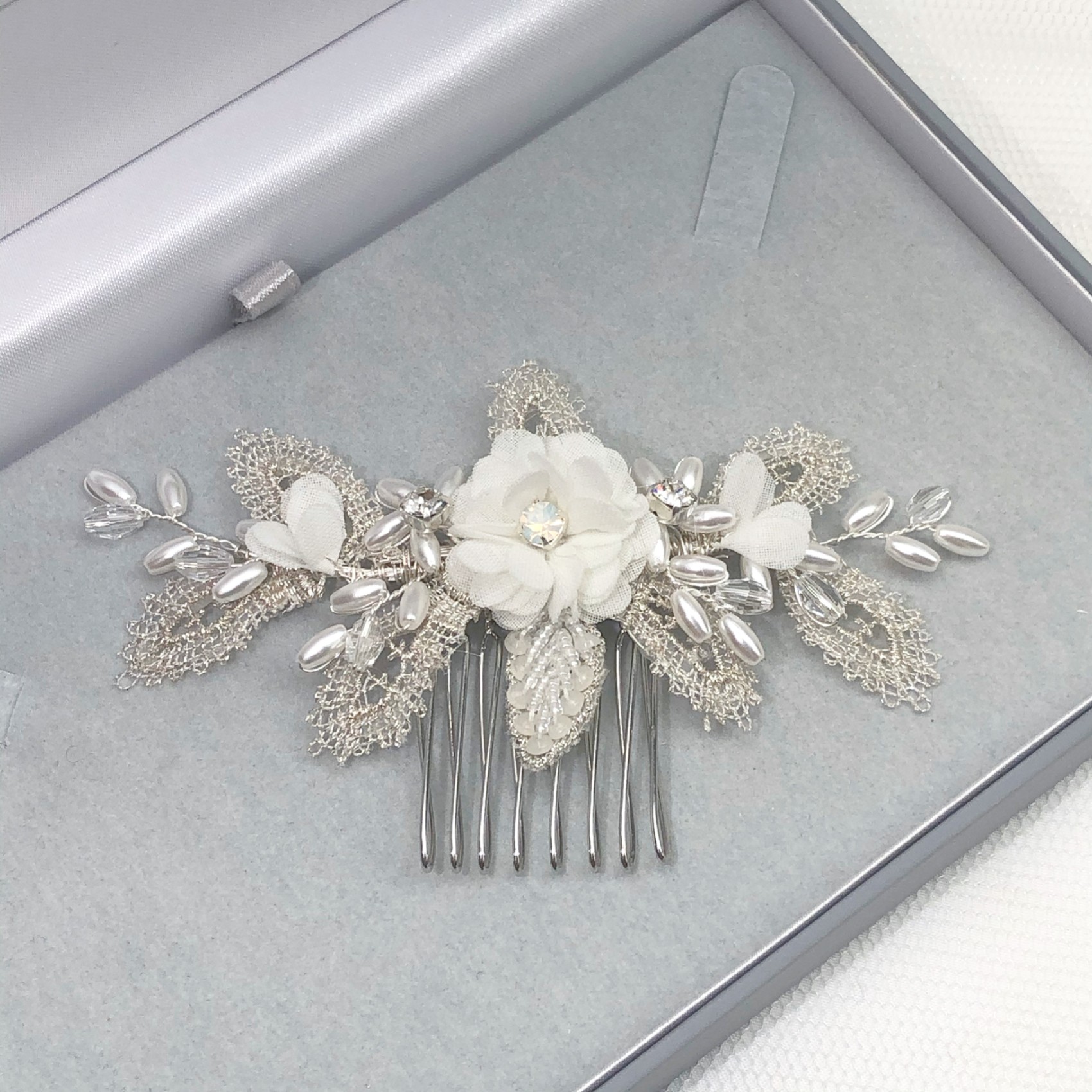 Eine Mini-Version unseres meistverkauften Sabrina-Haarkamms - Sabrina Mini! Ein zierlicher, floraler Haarkamm mit zarten elfenbeinfarbenen Blüten, Perlenblättern und zarten Blättern aus silberner Spitze. Verziert mit schimmernden elfenbeinfarbenen Saatperlen und klaren Kristallperlen. Jede Blüte ist mit einem einzelnen Opal-Solitär verziert, der einen Hauch von Glitzer versprüht. Stecken Sie sie in eine zerzauste Hochsteckfrisur, in eine Hochsteckfrisur oder tragen Sie sie am oberen Ende eines Schleiers, um ihm den letzten Schliff zu verleihen. Auch für die Brautjungfern eine umwerfende Wahl!