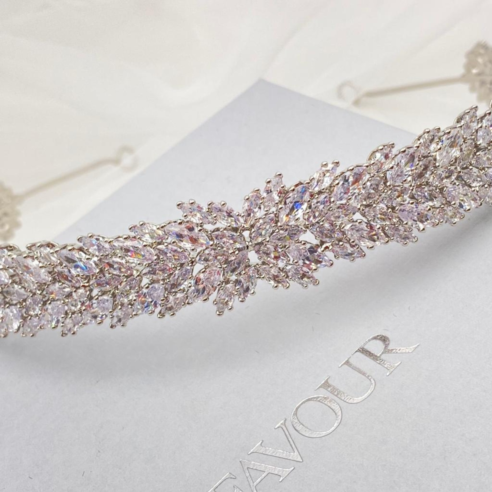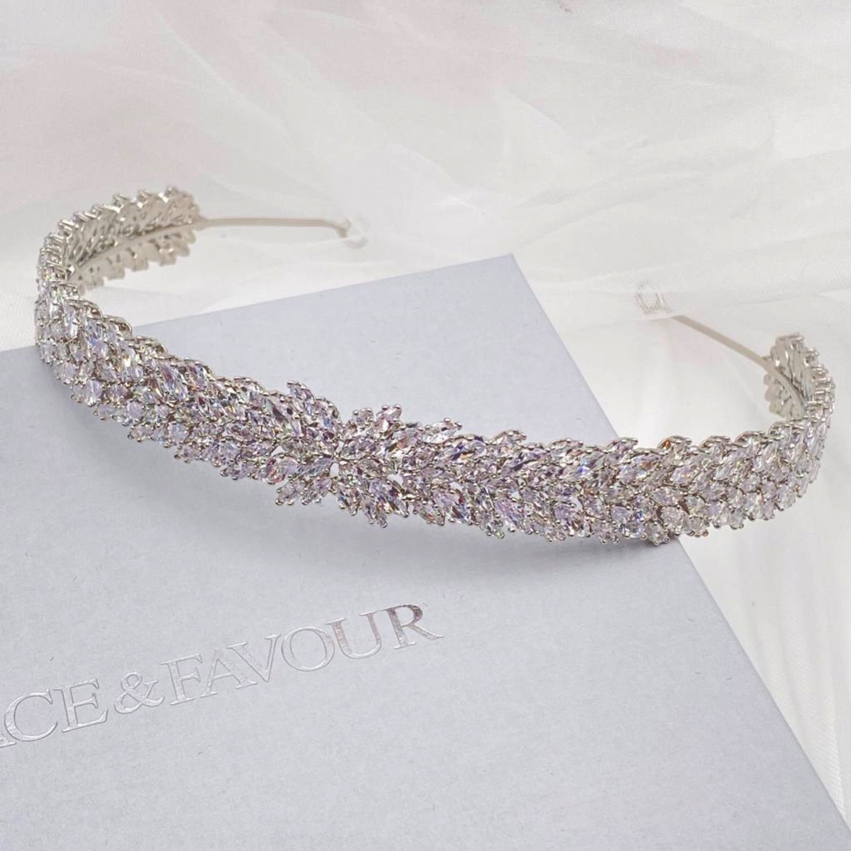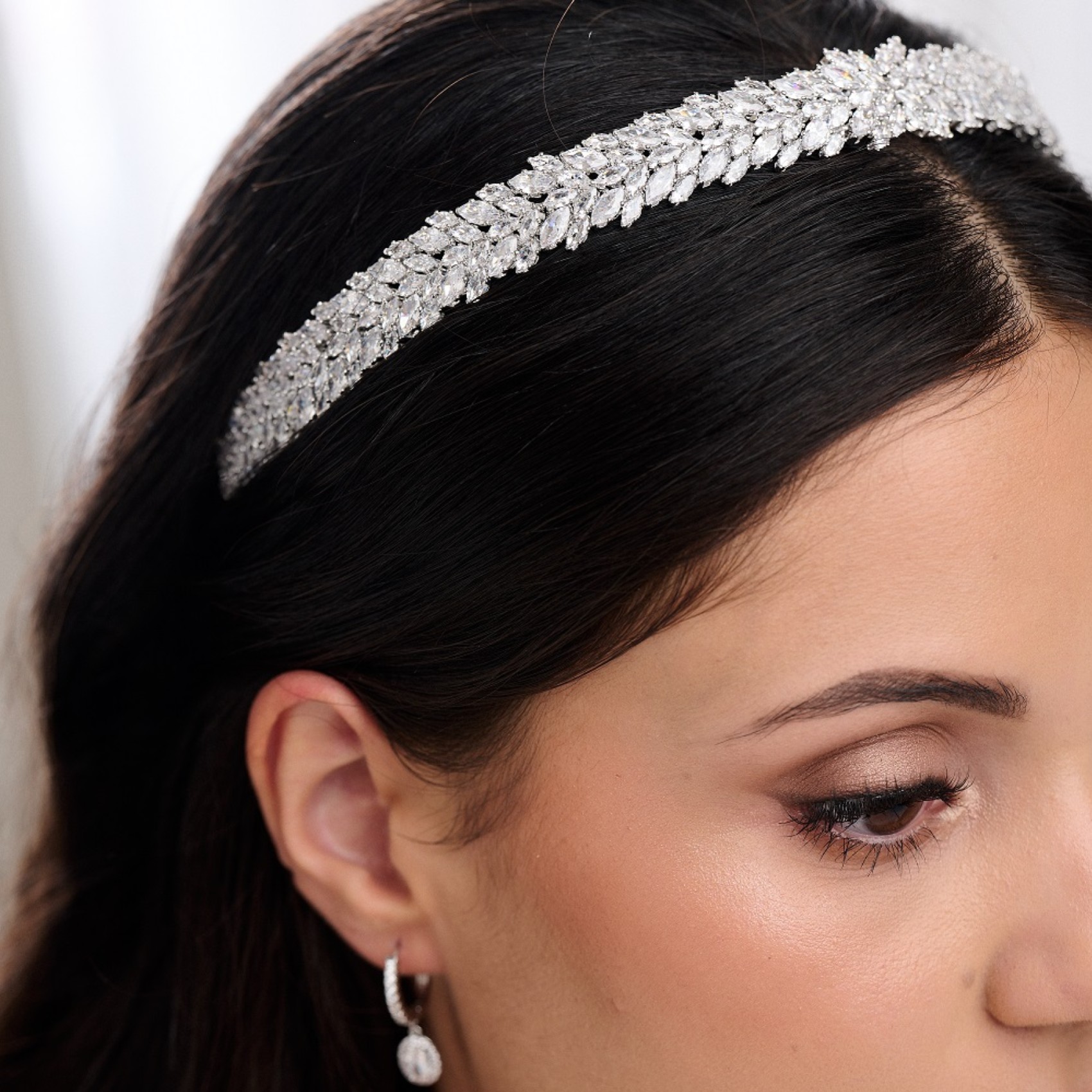 Ein wunderschönes, klassisches Hochzeitsband, das mit funkelnden Marquise-Kristallen aus Zirkonia verziert ist. Dieses Stück sieht wunderschön aus, wenn Sie es zu einer Hochsteckfrisur oder mit wallenden Wellen tragen. Vervollständigen Sie Ihren Look mit einem Paar eleganter Ohrringe und einem einfachen Tennisarmband.
