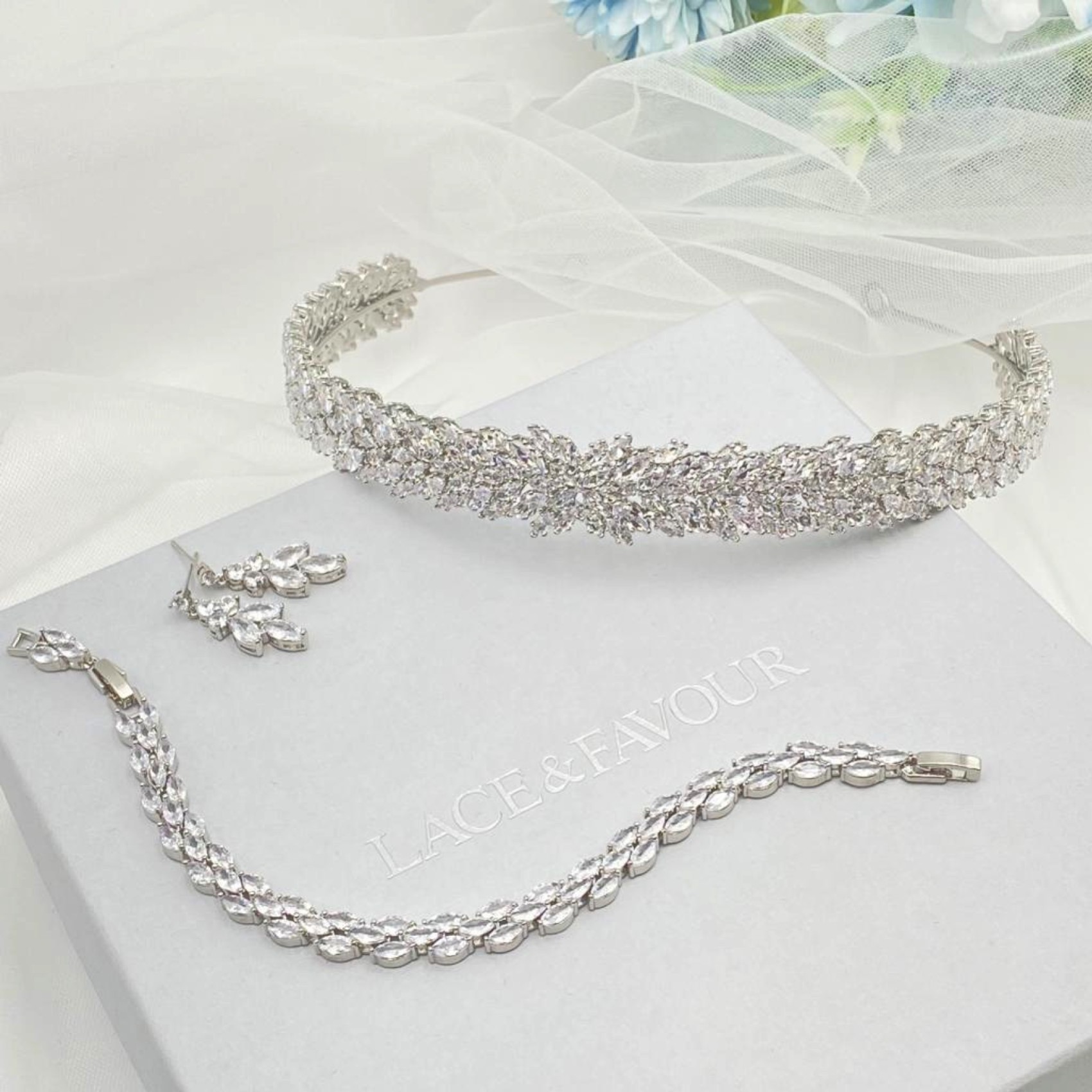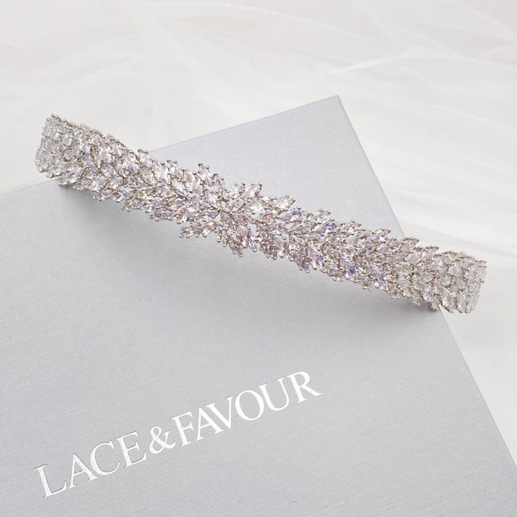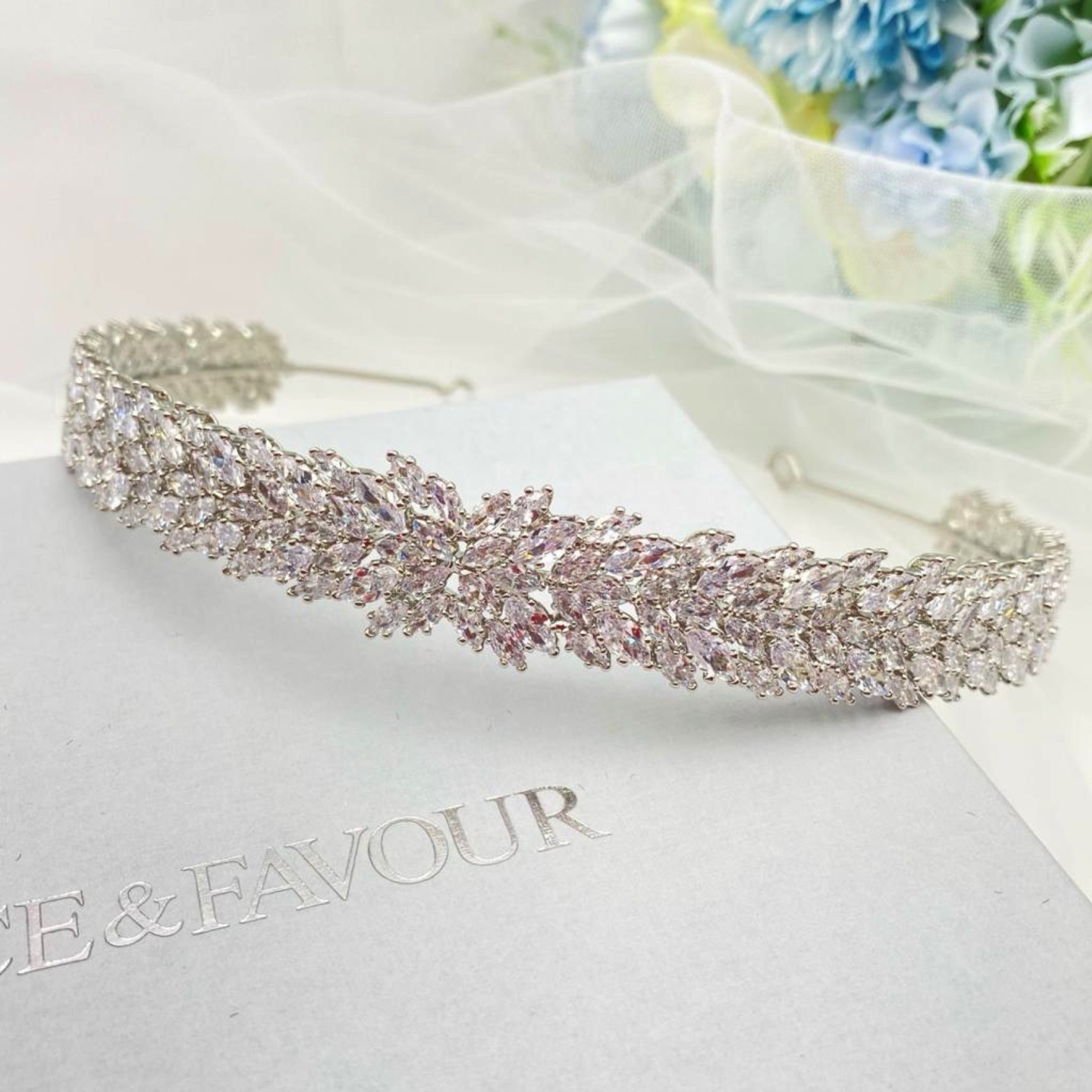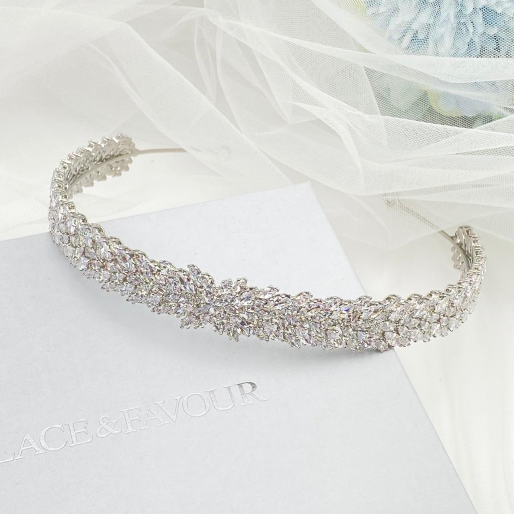 Ein wunderschönes, klassisches Hochzeitsband, das mit funkelnden Marquise-Kristallen aus Zirkonia verziert ist. Dieses Stück sieht wunderschön aus, wenn Sie es zu einer Hochsteckfrisur oder mit wallenden Wellen tragen. Vervollständigen Sie Ihren Look mit einem Paar eleganter Ohrringe und einem einfachen Tennisarmband.