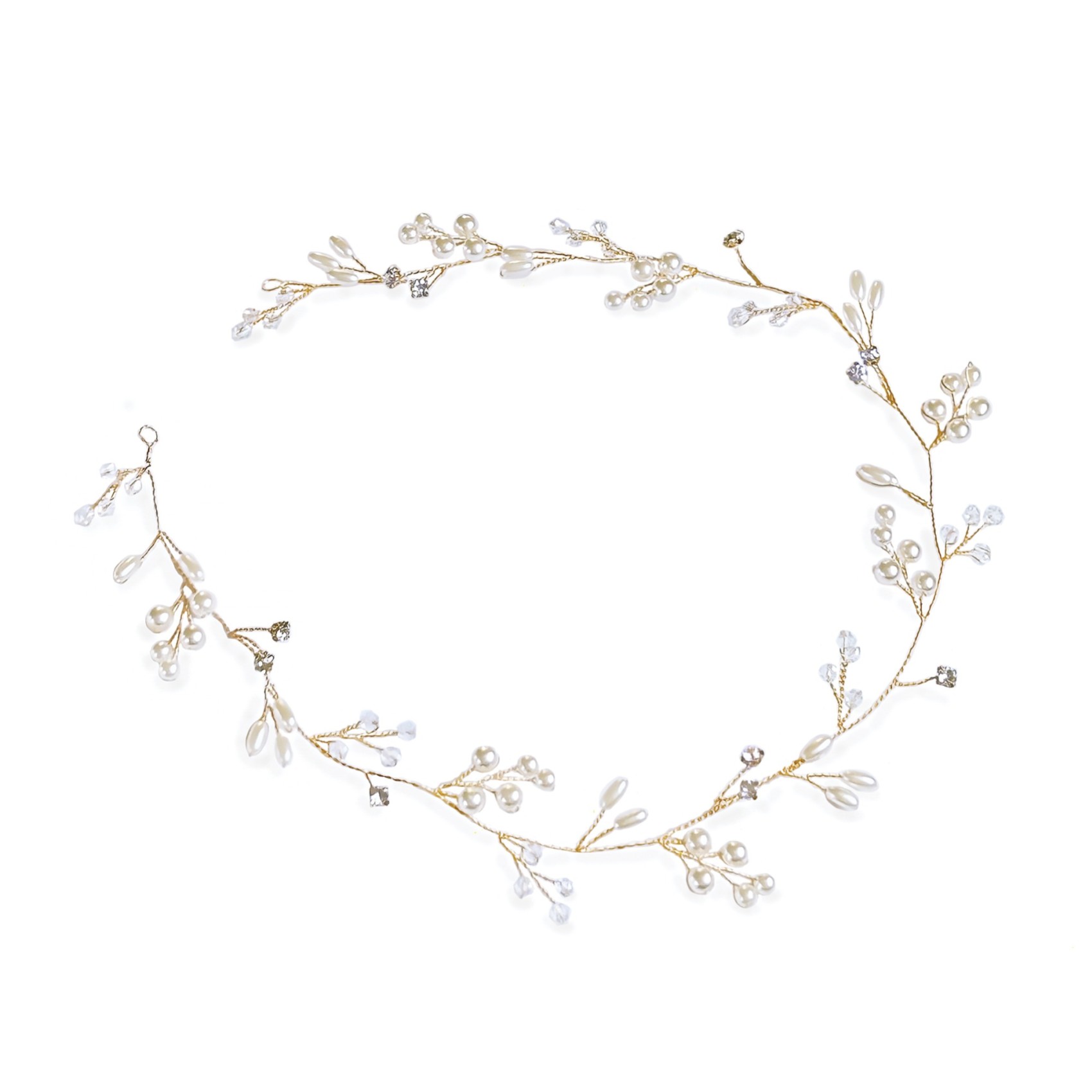 Eine wunderschön zarte goldene Hochzeitshaarrebe mit Zweigen aus funkelnden Solitärkristallen, zierlichen elfenbeinfarbenen Perlen, hübschen Saatperlen und klaren Kristallperlen. Dieser feminine Kopfschmuck für eine moderne Hochzeit ist perfekt für Bräute, die ein entspanntes Bohème-Styling mit einem subtilen Hauch von Glitzer suchen. Diese Haarranke sieht wunderschön aus, wenn sie als Girlande getragen oder zu einem Zopf oder Dutt gebunden wird.