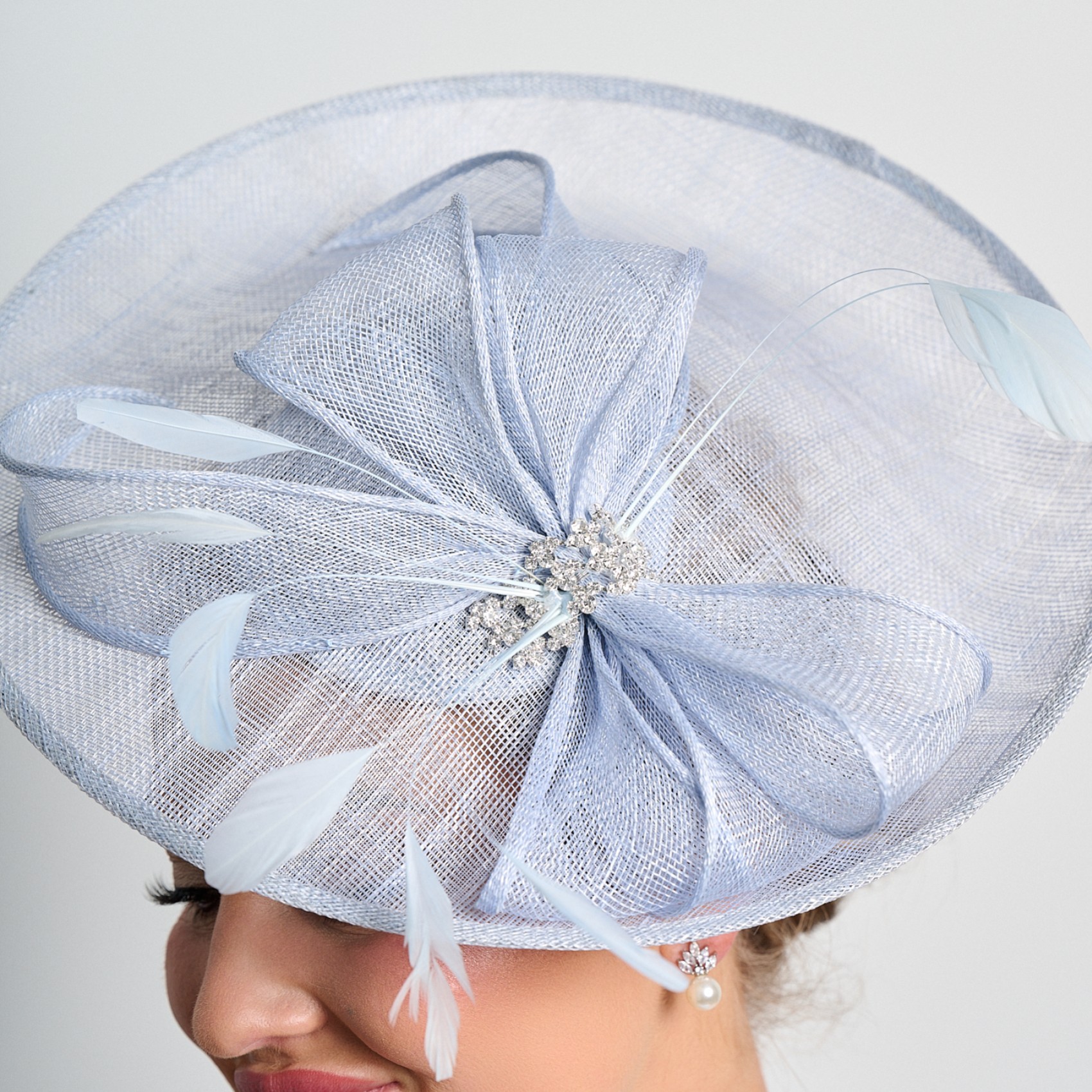 Ein raffinierter hellblauer Hochzeits-Fascinator aus einer großen, leichten Sinamay-Basis, die mit einer wunderschönen doppelten Sinamay-Schleife, einer funkelnden Diamantenbrosche und weichen Kokosfedern verziert ist. Dieser elegante Fascinator ist an einem dezenten, bequemen Stirnband befestigt und lässt sich leicht tragen. Dieser glamouröse hellblaue Fascinator eignet sich für jeden besonderen Anlass, von Hochzeiten bis hin zu Rennen. Eine atemberaubende Wahl für die Mutter der Braut oder des Bräutigams, dieser Hochzeitsfascinator verleiht Ihrem Outfit den perfekten Schliff.