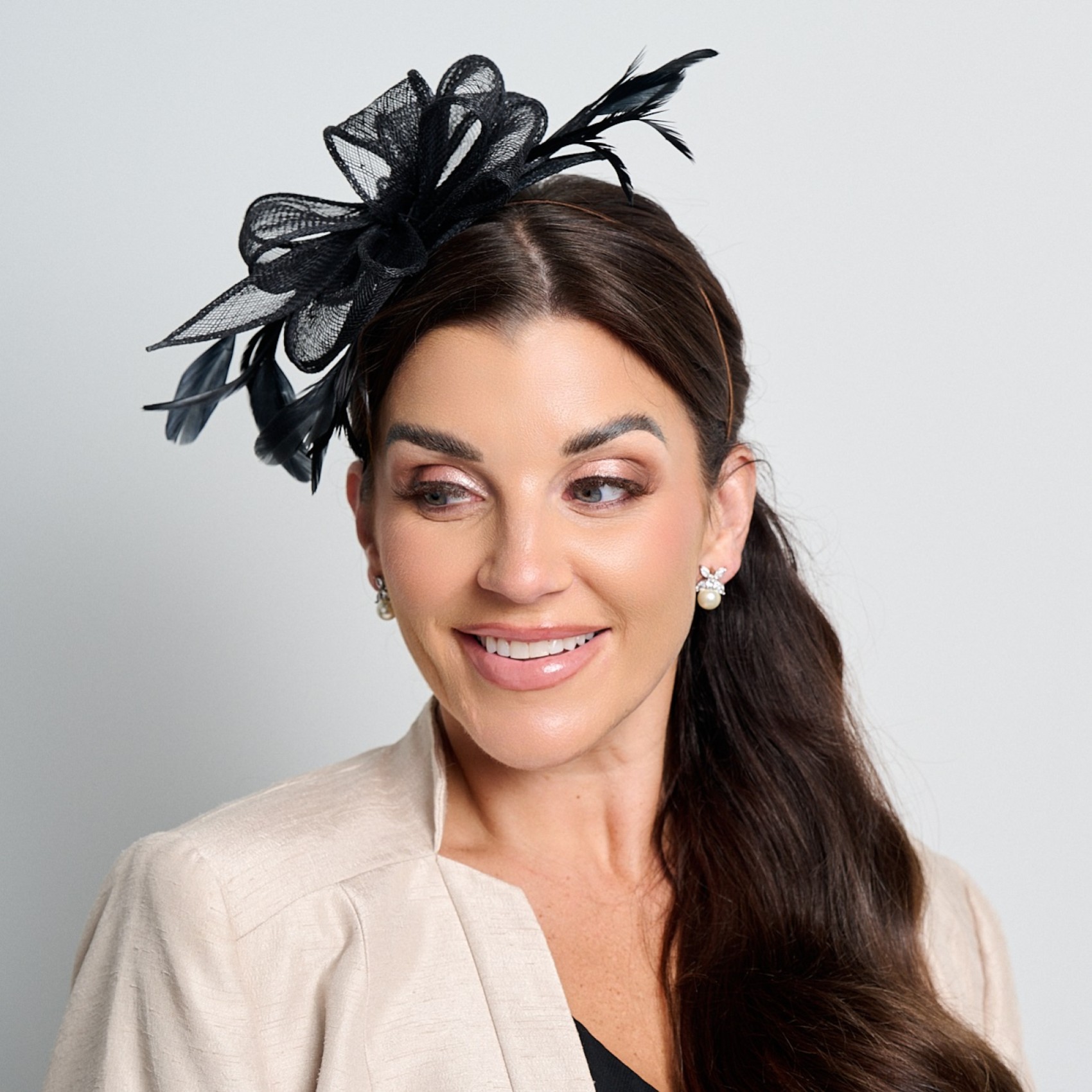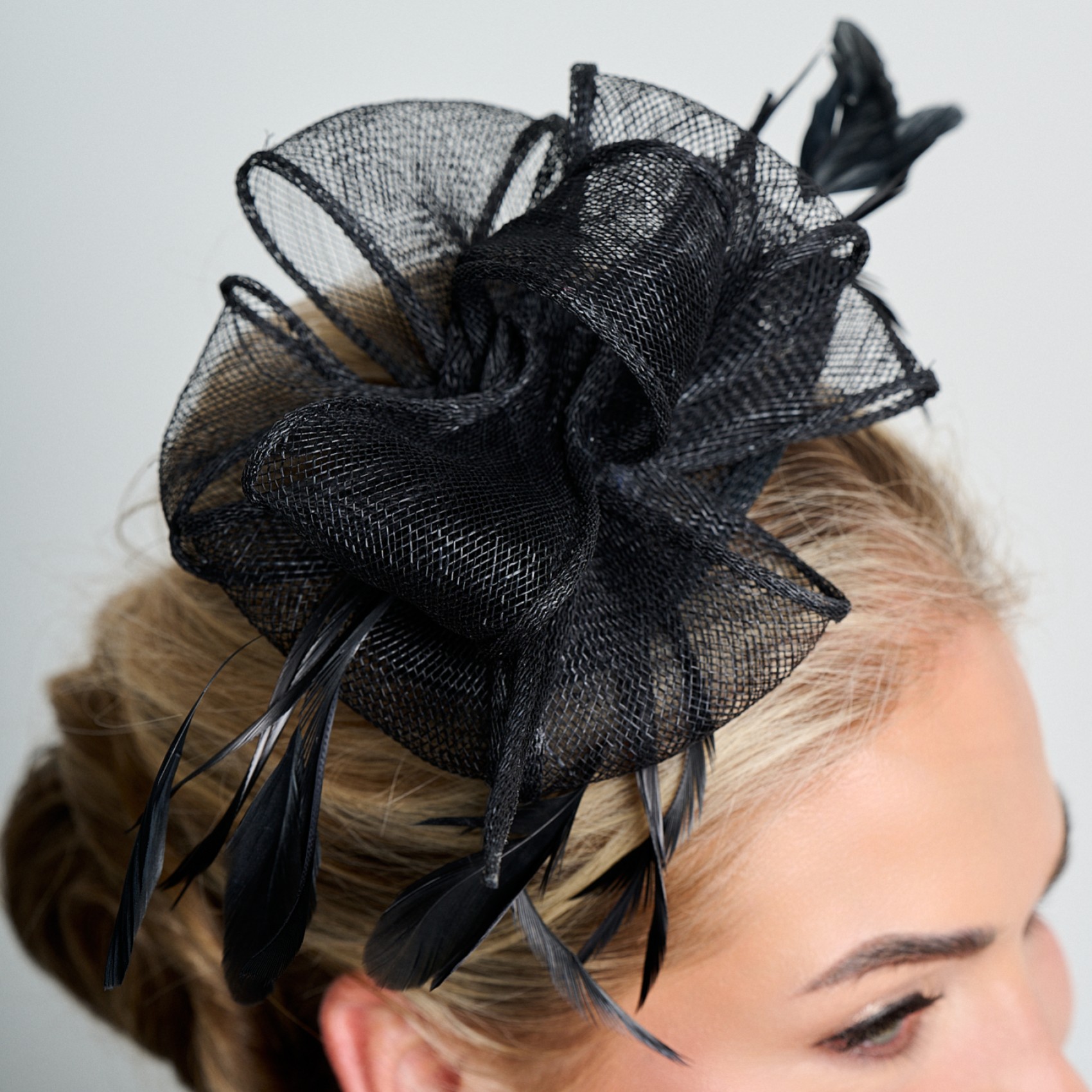 Ein attraktiver schwarzer Hochzeitsfascinator aus durchsichtigen Sinamay-Schleifen, die mit weichen Federn in einem hübschen, seitlichen Design akzentuiert sind. Dieser feminine Sinamay-Fascinator ist an einem diskreten, bequemen Stirnband befestigt und lässt sich leicht tragen. Von Hochzeiten bis hin zu Rennen ist dieser stilvolle schwarze Fascinator für jeden besonderen Anlass geeignet. Dieser Fascinator ist eine elegante Wahl für die Mutter der Braut, den Bräutigam oder einen Hochzeitsgast und verleiht Ihrem Outfit den letzten Schliff.