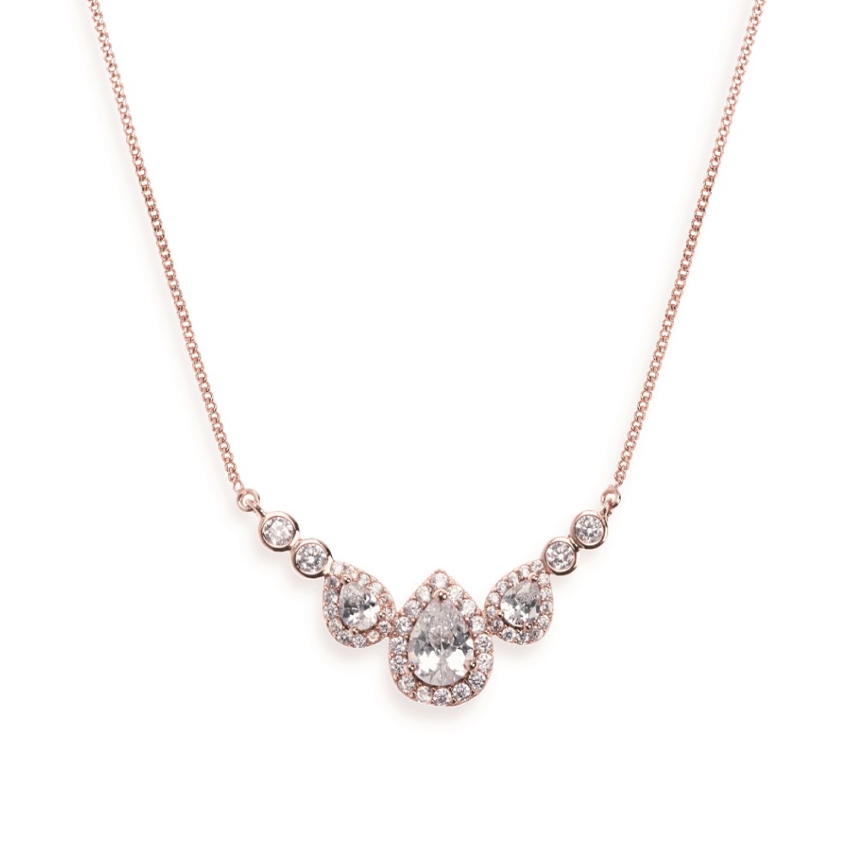 Diese elegante Halskette in Roségold besteht aus einem zierlichen Trio aus tropfenförmigen Kristallen, die mit winzigen Steinen in Pavee-Fassung eingefasst sind, sowie aus Solitär-Kristallen. Dieses zeitlose Schmuckstück ist eine wunderbare Ergänzung zu einem klassischen Brautlook.