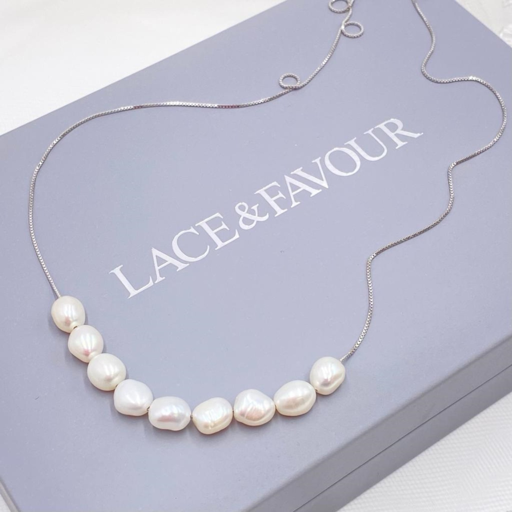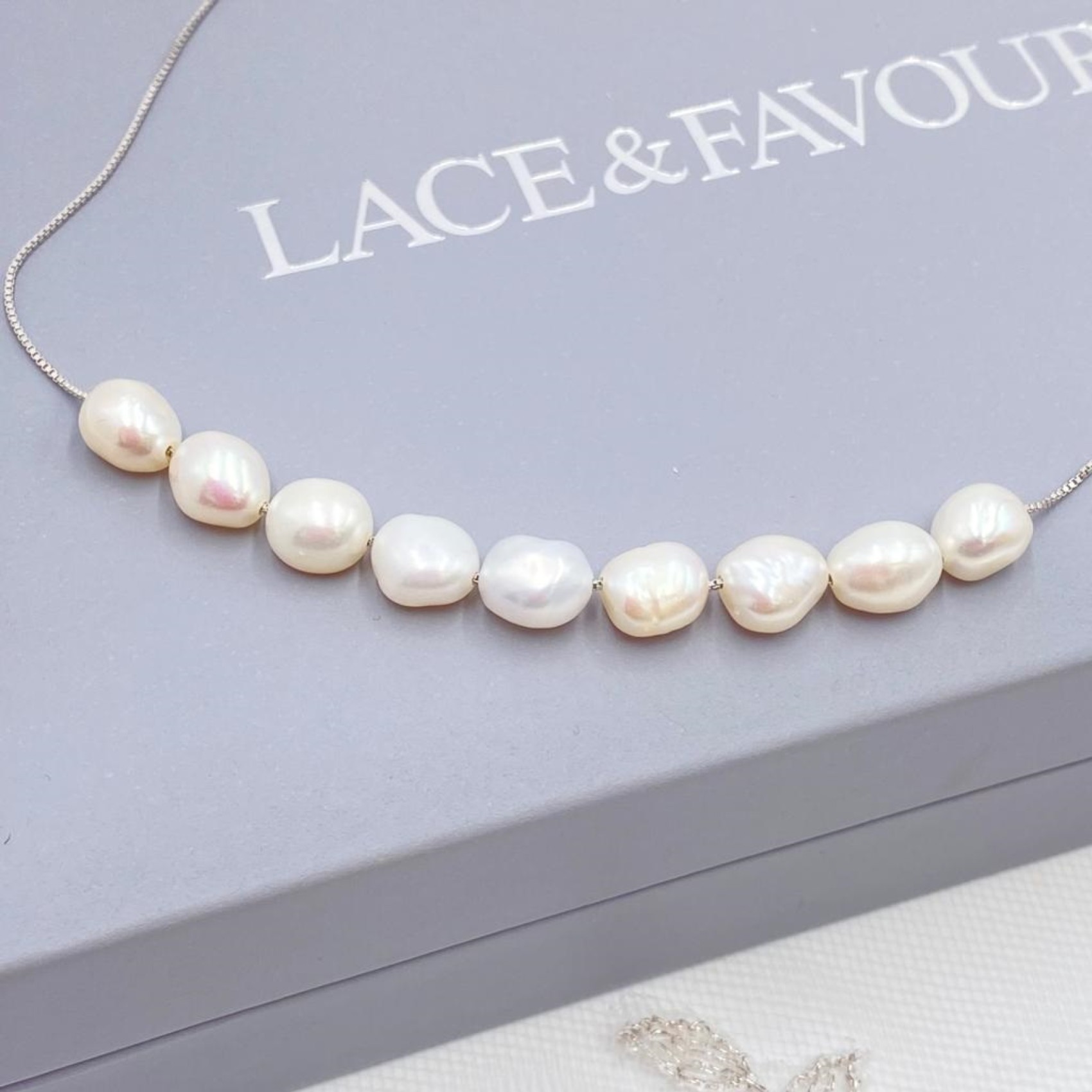 Unsere Kala-Halskette für Perlenliebhaber besteht aus 9 leuchtenden Süßwasserperlen an einer zarten, versilberten Kette. Das perfekte Schmuckstück für eine Hochzeit am Urlaubsort. Kombinieren Sie diese wunderschöne Süßwasserperlenkette mit einem traumhaften Paar unserer Perlenohrringe für einen zeitlosen und klassischen Brautlook.