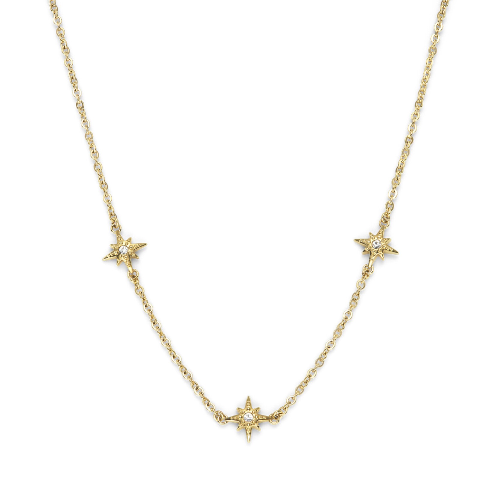 Diese zarte vergoldete Halskette besteht aus einer Reihe von kristallgefassten North Star Anhängern. Jedes Stück hat eine großzügige Verlängerung, um den perfekten Stapel zu bilden. Wie wäre es mit einer Kombination aus Gold und Silber für einen Mixed-Metal-Look?