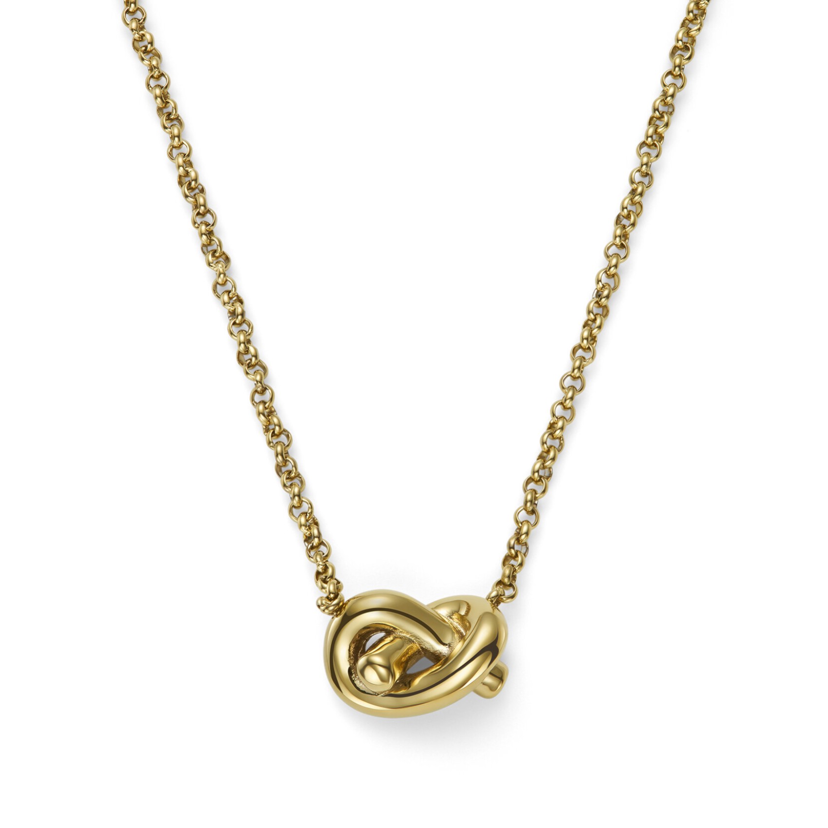 Diese besondere Interpretation des ikonischen Liebesknotens ist einfach, elegant und bedeutungsvoll. Dieser zarte, vergoldete Anhänger steht für gemeinsame Liebe und Einigkeit. Er ist aus Metall gefertigt und hat sanfte Kurven. Zusammen mit einer zierlichen Kette ist dieses zeitlose Schmuckstück ein schönes Geschenk oder eine Freude für die eigene Liebe.
