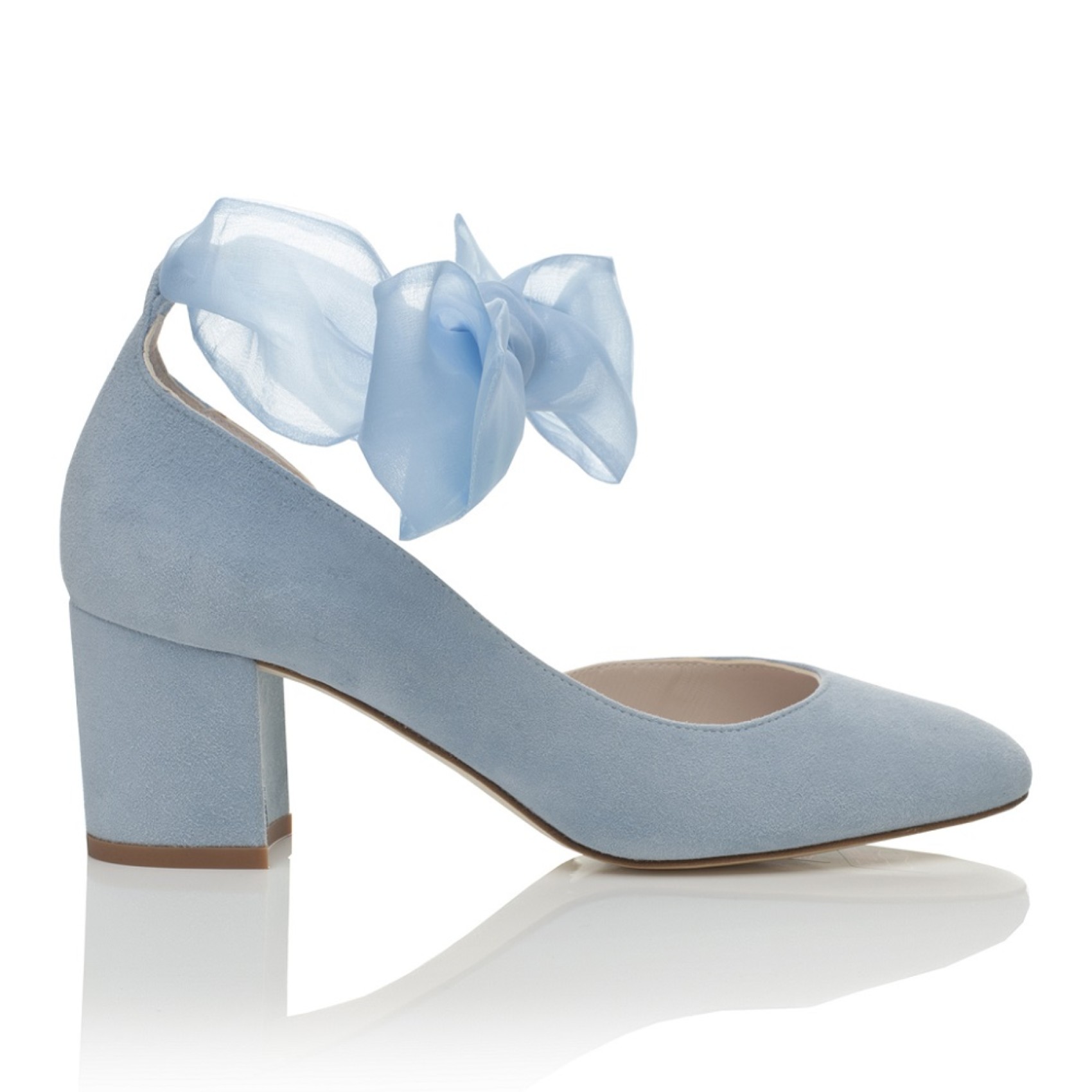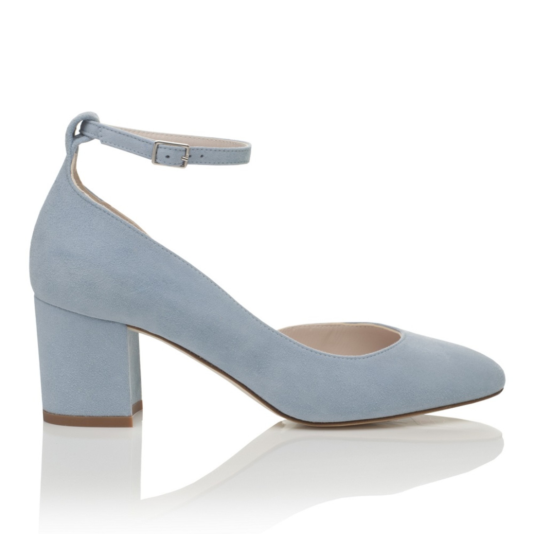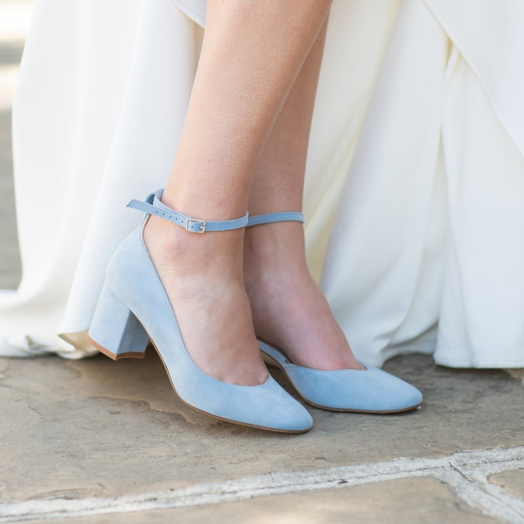 Ein schöner Hochzeitsschuh mit mittlerem Blockabsatz, handgefertigt aus wunderschönem nebelblauem Ziegenveloursleder. Das Modell hat ein hübsches Organzaband am Knöchel und wird mit einem alternativen, schlichten Knöchelriemen geliefert. Wir lieben diese blauen Hochzeitsschuhe, sie sind elegant und bequem zu tragen und dabei super hübsch und feminin!