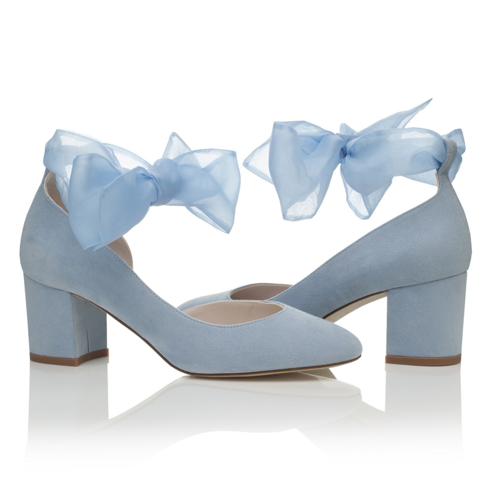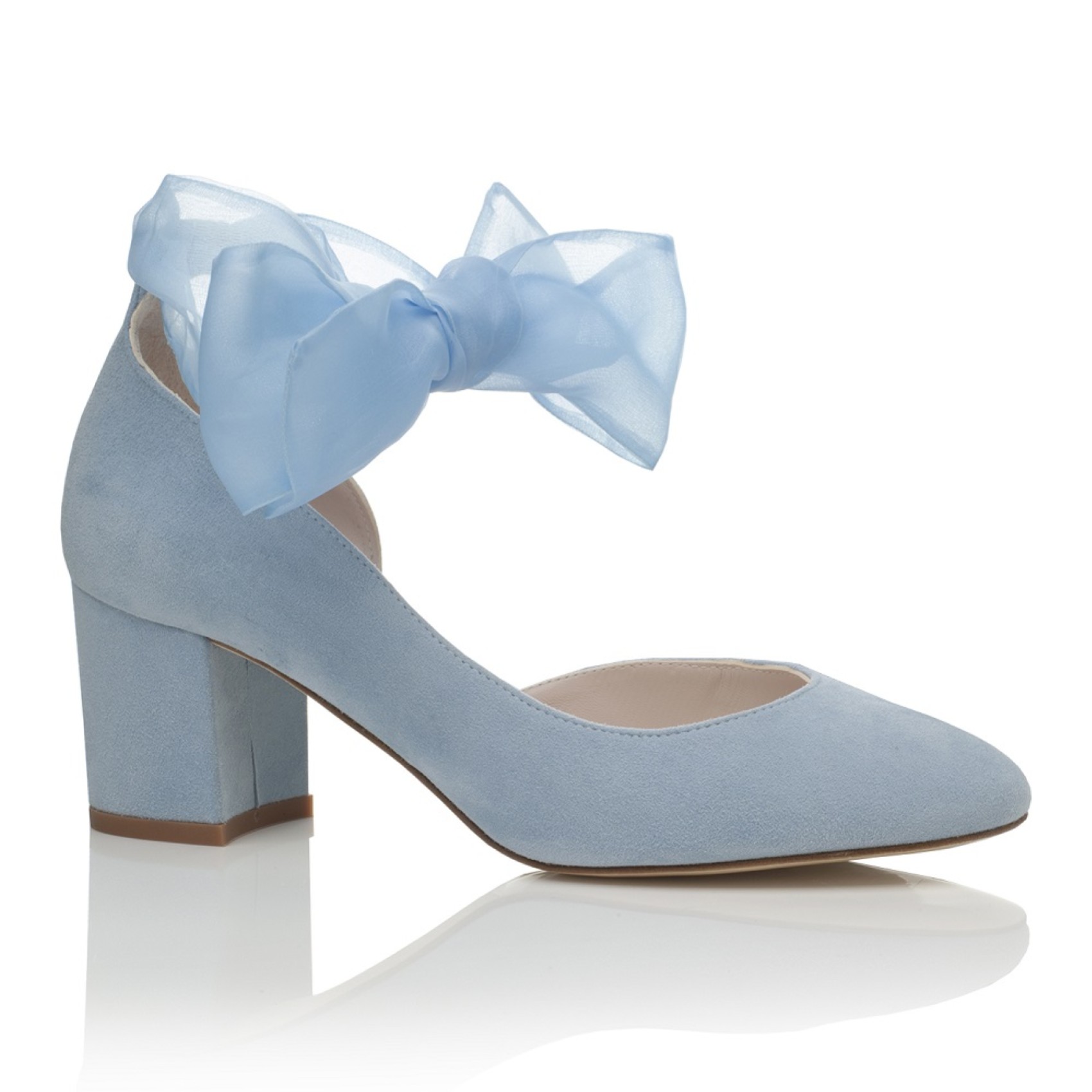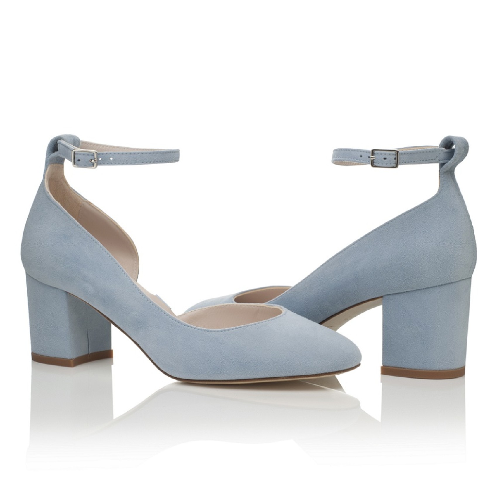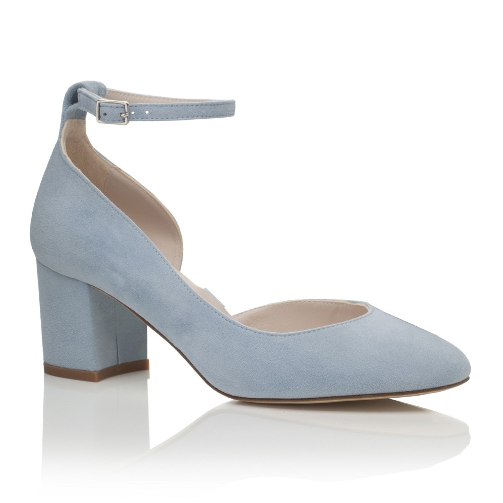 Ein schöner Hochzeitsschuh mit mittlerem Blockabsatz, handgefertigt aus wunderschönem nebelblauem Ziegenveloursleder. Das Modell hat ein hübsches Organzaband am Knöchel und wird mit einem alternativen, schlichten Knöchelriemen geliefert. Wir lieben diese blauen Hochzeitsschuhe, sie sind elegant und bequem zu tragen und dabei super hübsch und feminin!