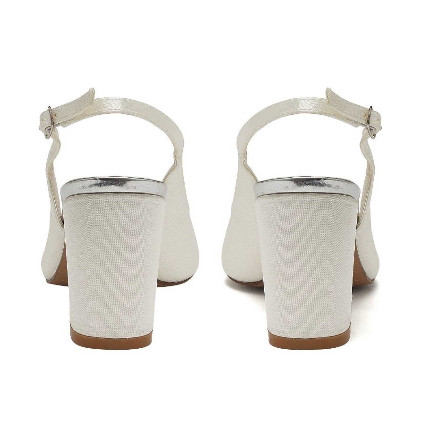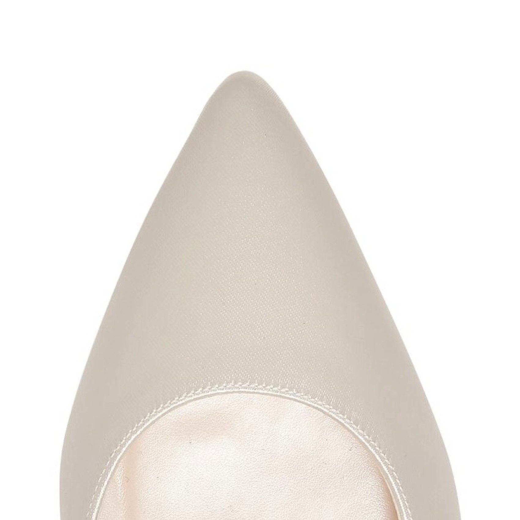 Die Faith Brautschuhe, ein raffinierter, weit geschnittener Slingback-Pumps, sind eine Neuheit in dieser Saison. Sie sind aus schimmerndem elfenbeinfarbenem Satin gefertigt, der in einer Farbe Ihrer Wahl eingefärbt werden kann, und haben eine spitz zulaufende Spitze, einen elastischen und mit Schnallen versehenen Slingback-Riemen für eine gute Passform, einen silbernen Lederbesatz und einen alltagstauglichen Blockabsatz. Ein großartiger Hochzeitsschuh, egal ob Sie Braut, Brautjungfer oder Mutter der Braut sind.