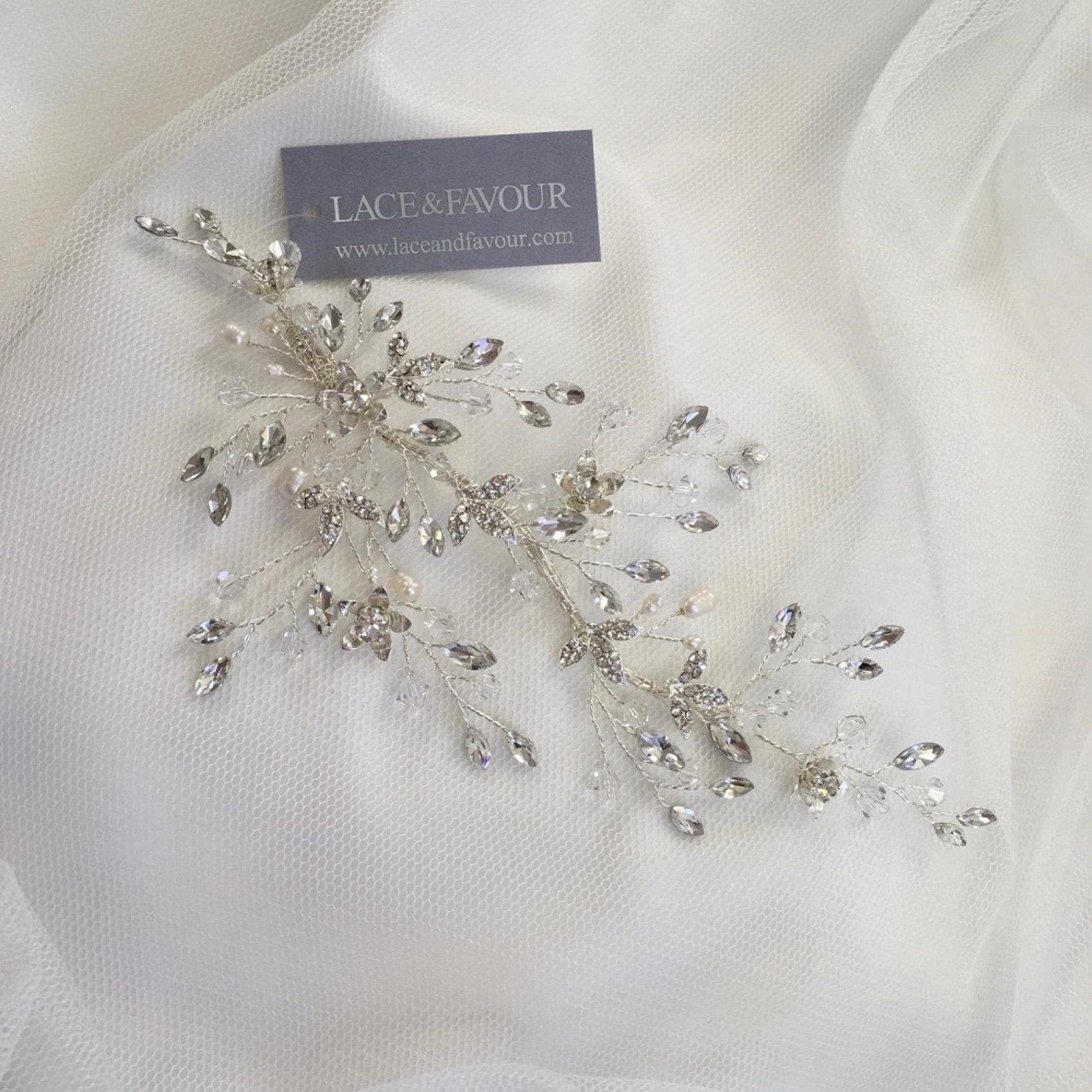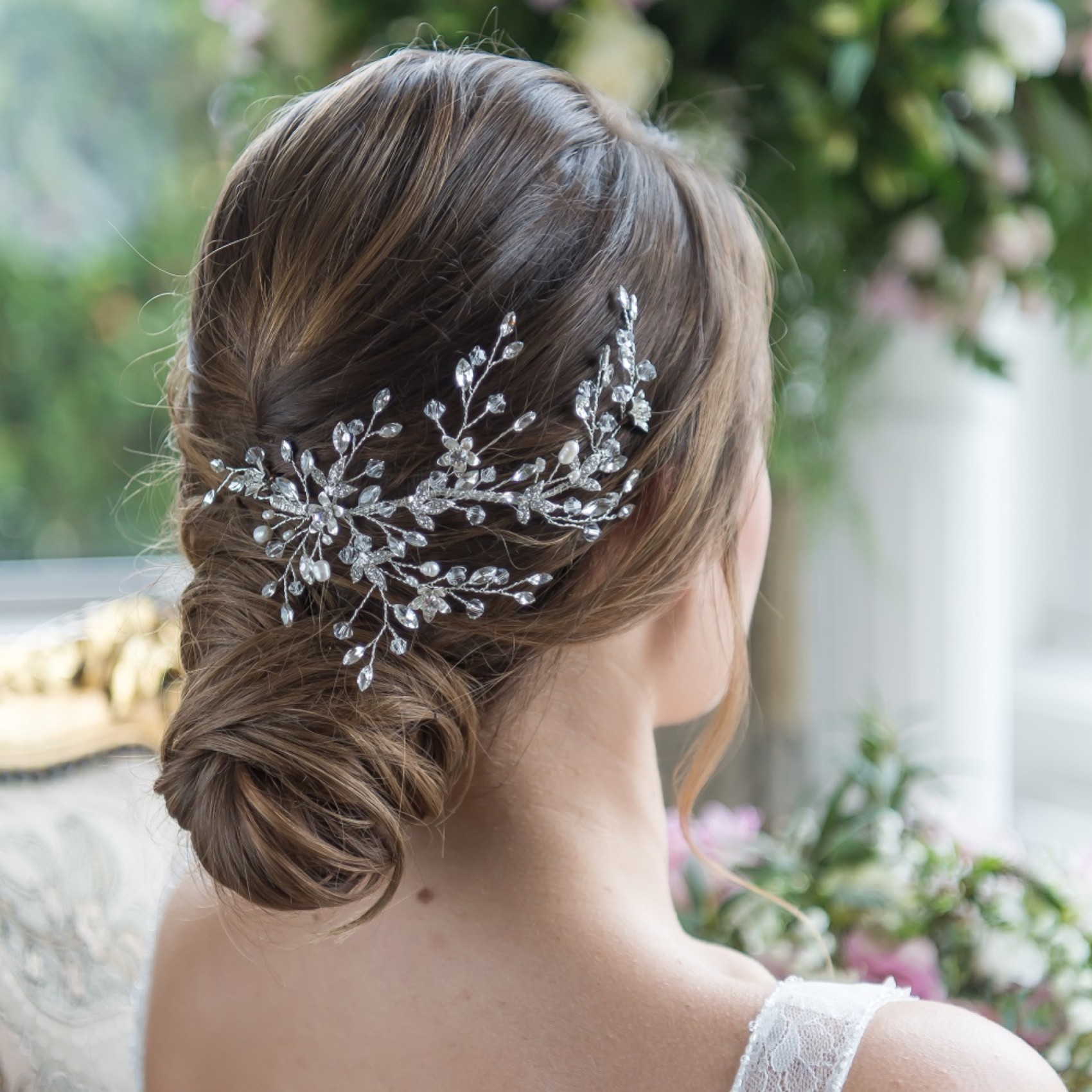 Die zierlichen Silberblumen in den Zweigen verleihen einer zarten Hochsteckfrisur eine mühelose Schönheit. Handgefertigt mit glitzernden Marquise-Kristallen, durchscheinenden Perlen und elfenbeinfarbenen Perlen, verziert mit strahlenden, kristallbesetzten Blättern und zierlichen Silberblumen. Diese zarte Haarranke wird seitlich im Haar getragen oder in einen Dutt gesteckt und ist ein echter Blickfang. Das Design ist völlig flexibel und lässt sich perfekt an Ihre Frisur anpassen. Sie wird mit kleinen Drahtschlaufen geliefert, die mit Nadeln im Haar befestigt werden können.