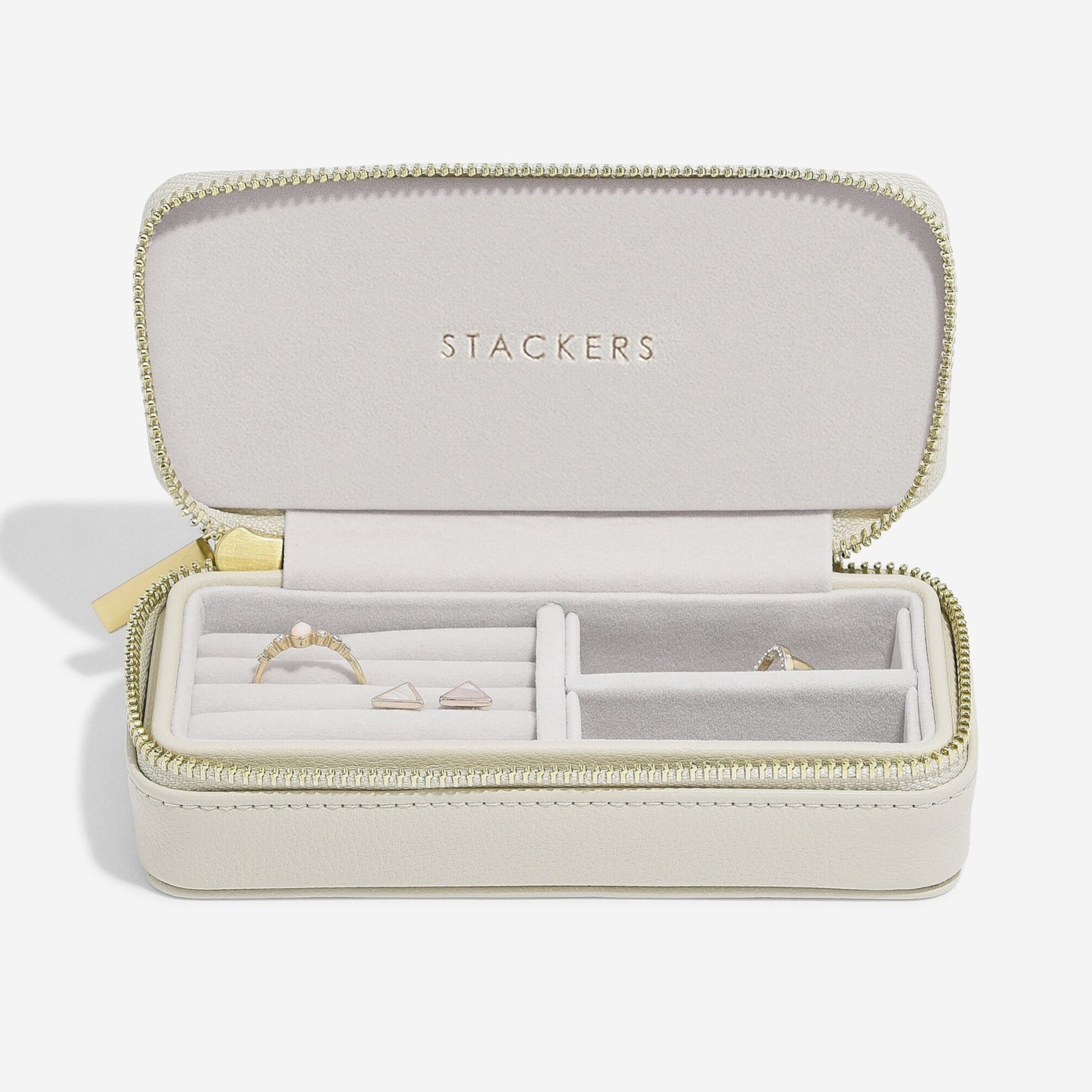 Das Reiseaccessoire, von dem Sie nie wussten, dass Sie es brauchen. Unser meistverkauftes mittelgroßes Reise-Schmuckkästchen ist ein Muss für Ihre Reisen! Sie ist aus hafermehlfarbenem Kunstleder gefertigt und mit grauem, weichem Samt gefüttert, um Ihre besonderen Stücke unterwegs sicher aufzubewahren. Nehmen Sie sie mit auf Ihren Wochenendtrip oder Ihren Urlaub im Ausland, damit Sie Ihre Lieblingsschmuckstücke überallhin mitnehmen können! Die Trennwand ist herausnehmbar, damit Sie auch größere Ohrringe unterbringen können!