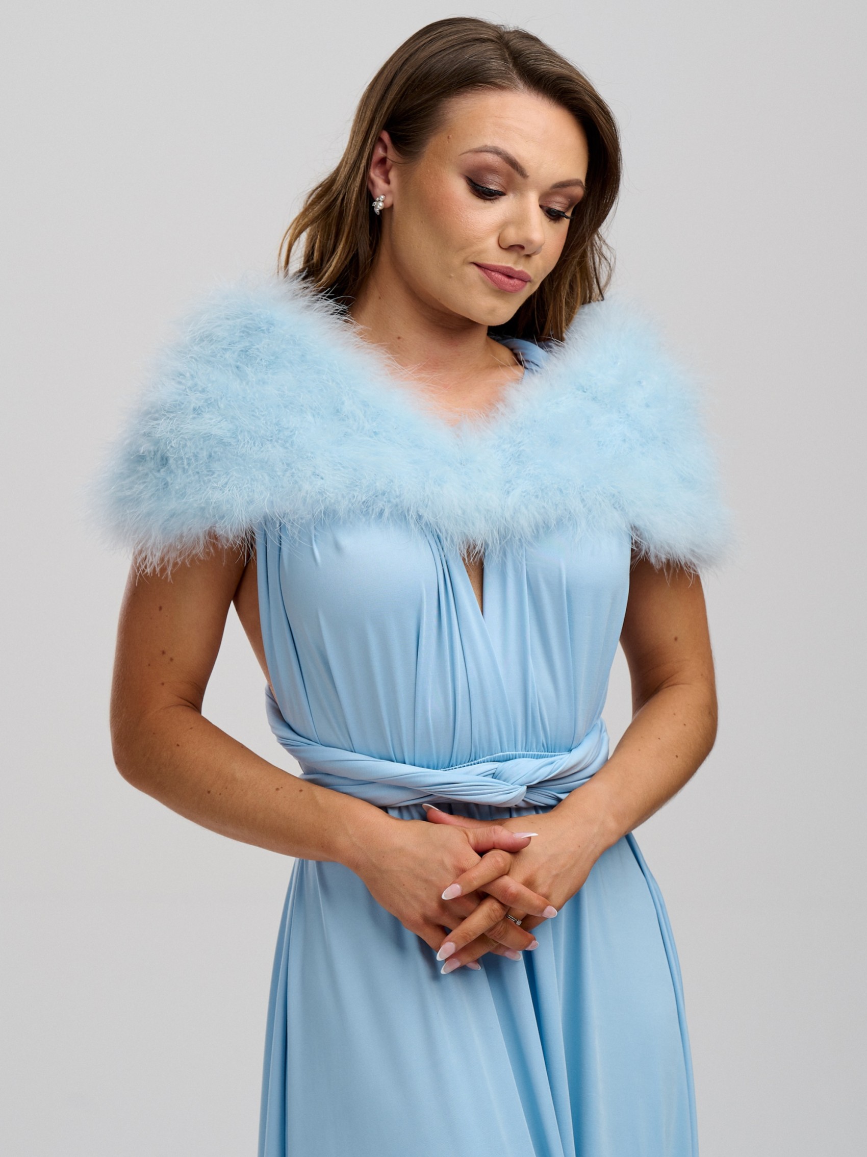 Die wunderbar weiche und elegante Stola Scarlet legt sich um die Schultern und verleiht Ihrem Look Wärme und Glamour. Diese blaue Hochzeitsstola aus echten Marabu-Federn ist ein absolutes Muss für die kühleren Monate. Diese Federstola ist auch ein wunderschönes Accessoire für Brautjungfern! Komplett mit Haken- und Ösenverschlüssen.