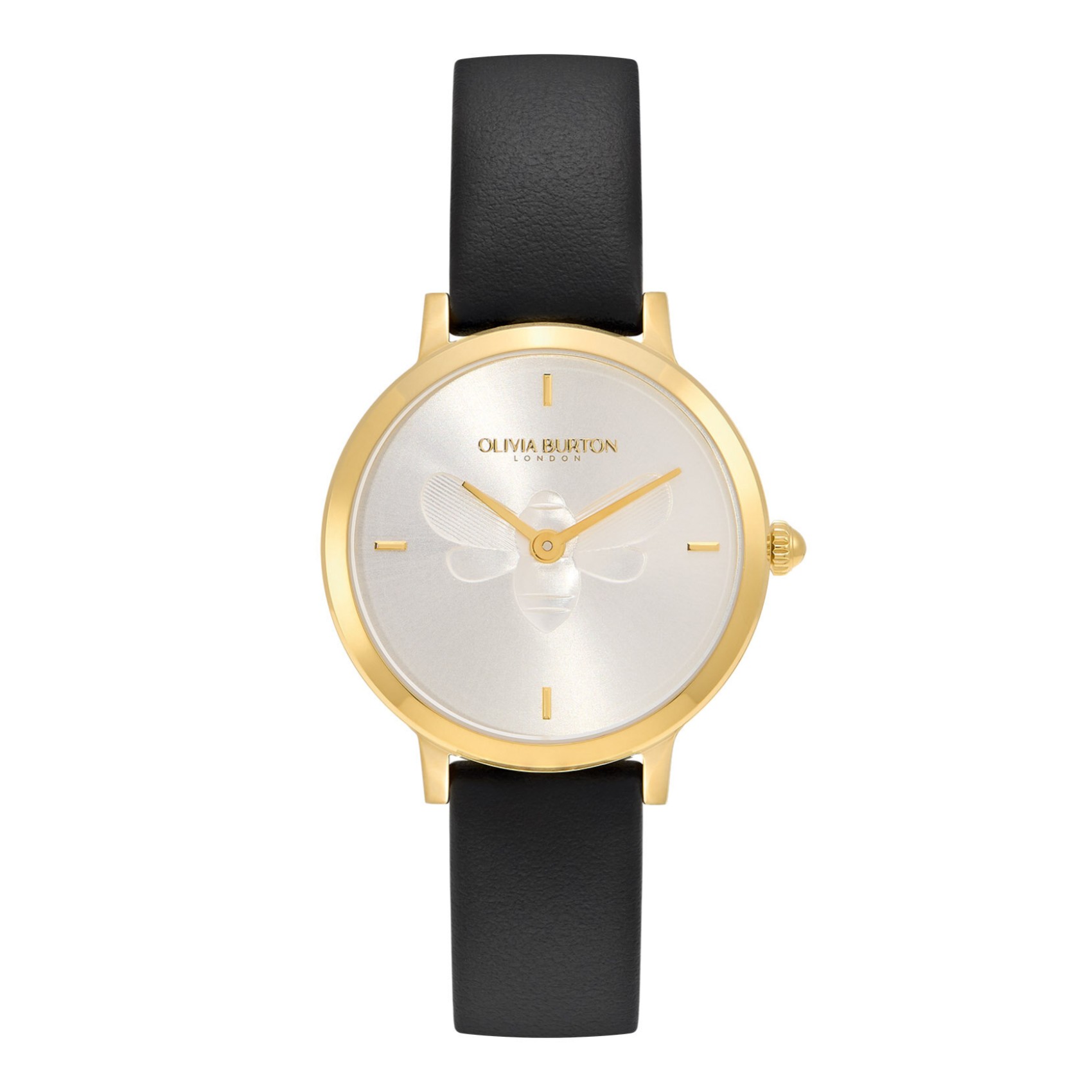 Olivia Burtondie Signature Bee-Uhr der Marke C.A.T.E.S. zeigt ein verschlungenes Bienenmotiv auf einem 28-mm-Zifferblatt mit silberfarbenem Sonnenschliff. Sie hat ein vergoldetes Gehäuse, ein schwarzes Lederarmband und ein ultraschlankes Design - wie geschaffen, um mit Ihrem Lieblingsarmband kombiniert zu werden.